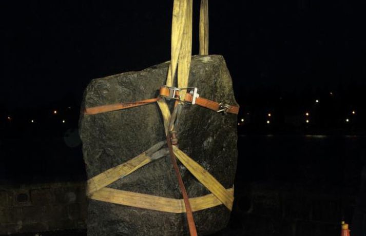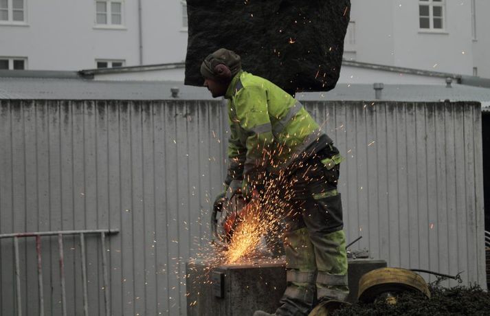 Útlistaverk Magnúsar Tómassonar af Óþekkta embættismanninum var flutt af verustað sínum út að Tjarnarbakkanum þar sem embættismaðurinn mun framvegis standa á móti Ráðhúsinu. Jón Gnarr mun afhjúpa verkið á nýja staðnum á morgun klukkan hálf þrjú. Óþekkti listamaðurinn stóð áður á torginu fyrir aftan Jómfrúna á Lækjargötunni. Flokkur verkamanna boraði hann lausan í gær til að færa hann á nýjan stað. Framkvæmdirnar voru allar festar á filmu eins og sést á myndasafninu hér til hliðar. Á einni myndinni virðist helst eins og Óþekkti embættismaðurinn ætli að bregða sér á Kampavínsklúbbinn við Lækjargötuna. Ákveðið var að flytja Óþekkta embættismanninn og koma honum á fjölfarnari stað svo fleiri fengju að njóta hans. „Menn töldu að hann væri ekki nógu sýnilegur. Þetta er spurning um að fleiri fái að njóta listaverkanna í borginni, alveg eins og Vatnsberinn eftir Ásmund var fluttur á Lækjargötuna," segir Bjarni Brynjólfsson, upplýsingastjóri hjá Reykjavíkurborg. Bjarni telur að Óþekkti embættismaðurinn sé nú kominn á stað sem hæfir honum betur. „Hann verður við Ráðhúsið og nær Alþingishúsinu og stjórnsýslunni allri. Þetta er mjög skemmtilegt," segir hann. Óþekkti embættismaðurinn er eftir Magnús Tómasson. Verkið er málmskúlptúr úr bronsi og basalti. Verkið var gert árið 1993, en keypt og sett upp af Reykjavíkurborg árið 1994
