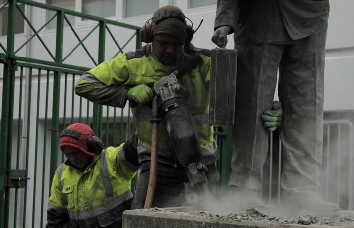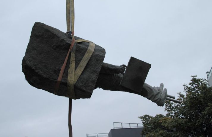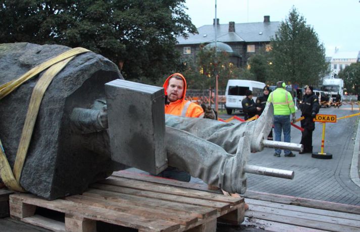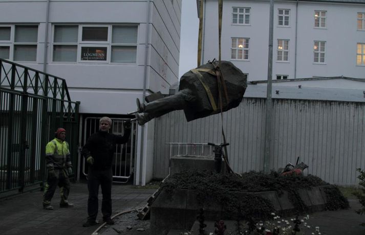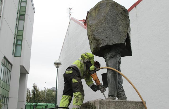 Verkamenn færa Óþekkta embættismanninn að Tjörninni BBI skrifar 13. september 2012 13:05 Óþekkti embættismaðurinn á leið á Kampavínsbarinn? Mynd/Listasafn Reykjavíkur Útlistaverk Magnúsar Tómassonar af Óþekkta embættismanninum var flutt af verustað sínum út að Tjarnarbakkanum þar sem embættismaðurinn mun framvegis standa á móti Ráðhúsinu. Jón Gnarr mun afhjúpa verkið á nýja staðnum á morgun klukkan hálf þrjú. Óþekkti listamaðurinn stóð áður á torginu fyrir aftan Jómfrúna á Lækjargötunni. Flokkur verkamanna boraði hann lausan í gær til að færa hann á nýjan stað. Framkvæmdirnar voru allar festar á filmu eins og sést á myndasafninu hér til hliðar. Á einni myndinni virðist helst eins og Óþekkti embættismaðurinn ætli að bregða sér á Kampavínsklúbbinn við Lækjargötuna. Ákveðið var að flytja Óþekkta embættismanninn og koma honum á fjölfarnari stað svo fleiri fengju að njóta hans. „Menn töldu að hann væri ekki nógu sýnilegur. Þetta er spurning um að fleiri fái að njóta listaverkanna í borginni, alveg eins og Vatnsberinn eftir Ásmund var fluttur á Lækjargötuna," segir Bjarni Brynjólfsson, upplýsingastjóri hjá Reykjavíkurborg. Bjarni telur að Óþekkti embættismaðurinn sé nú kominn á stað sem hæfir honum betur. „Hann verður við Ráðhúsið og nær Alþingishúsinu og stjórnsýslunni allri. Þetta er mjög skemmtilegt," segir hann. Óþekkti embættismaðurinn er eftir Magnús Tómasson. Verkið er málmskúlptúr úr bronsi og basalti. Verkið var gert árið 1993, en keypt og sett upp af Reykjavíkurborg árið 1994 Mest lesið „Ég spyr hvernig hefði farið ef ég hefði ekki lifað þetta af“ Innlent Töframaður lúbarinn í Garðabæ: „Ég hélt að þetta væri búið“ Innlent „Liggur maður þarna á jörðinni og það var verið að berja hann í stöppu“ Innlent „Á yfir höfði sér kærur vegna fjölda umferðarlagabrota“ Innlent Dómari krefst þess að Liam og föður hans verði sleppt úr haldi Erlent Björg sökuð um brot á kosningareglum Viðreisnar Innlent Ölvuð kona grunuð um að valda umferðarslysi á rafhlaupahjóli Innlent Grunaður um stórfellda líkamsárás Innlent Stöðvuðu stolinn bíl með naglamottu eftir eftirför um alla borg Innlent Listamenn safna fyrir 10 ára dreng á Selfossi í dag Innlent Fleiri fréttir Mótmæla og biðla til utanríkisráðherra Nýir oddvitar og sáttameðferð í kynferðisbrotamálum Töframaður lúbarinn í Garðabæ: „Ég hélt að þetta væri búið“ Listamenn safna fyrir 10 ára dreng á Selfossi í dag „Ég spyr hvernig hefði farið ef ég hefði ekki lifað þetta af“ Sprengisandur: Laxeldi, verðbólga og falsfréttir Grunaður um stórfellda líkamsárás „Á yfir höfði sér kærur vegna fjölda umferðarlagabrota“ Ölvuð kona grunuð um að valda umferðarslysi á rafhlaupahjóli Hlýnandi veður í dag og „meinlaus austanlægð“ í kortunum Hilmar Gunnarsson er oddviti í Mosfellsbæ Vilhjálmur Árnason leiðir Sjálfstæðismenn í Reykjanesbæ Baráttan hafi verið Viðreisn til sóma „Lúxusvandamál“ að velja og hafna á listann Stöðvuðu stolinn bíl með naglamottu eftir eftirför um alla borg Sjálfstæðismenn í Reykjanesbæ velja sér oddvita „Vinna er heilsuefling“ Björg sökuð um brot á kosningareglum Viðreisnar Blótað í Grindavík á nýjan leik Vaktin: Björg Magnúsdóttir leiðir lista Viðreisnar í borginni „Liggur maður þarna á jörðinni og það var verið að berja hann í stöppu“ Vilja Hjallastefnugrunnskóla í Árborg Skjálftinn í Bárðarbungu 5,3 að stærð Rýnt í Epstein-skjölin, prófkjör Viðreisnar og árás ungmenna „Koma einhverjir strákar og svo fer allt í háaloft“ Fjórðungur kosið í prófkjöri Viðreisnar Maður hlotið stórfellt líkamstjón eftir árás ungmenna „Dorrit og eiginmaður hennar frá Íslandi eru hér“ „Mjög áhugaverð umræða“ Þúsundir kvartana vegna leigubílaaksturs en fagnar breytingum Sjá meira