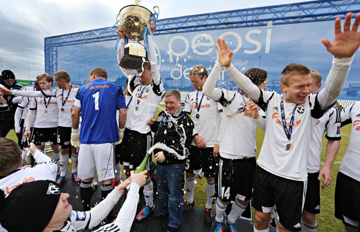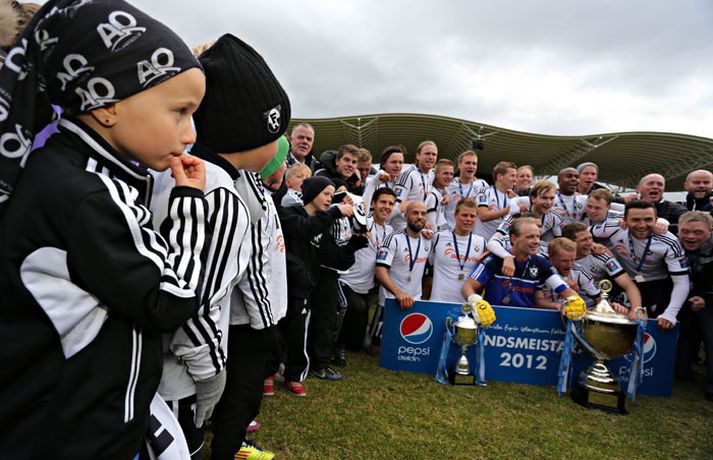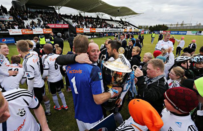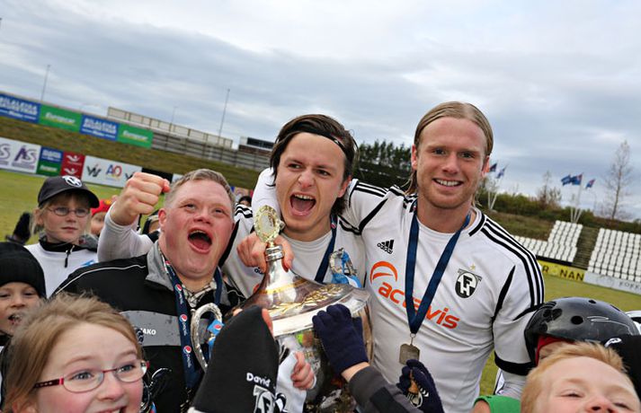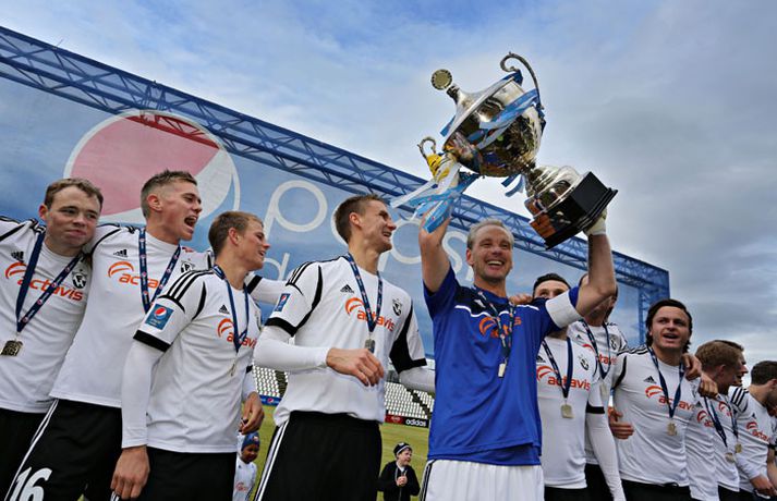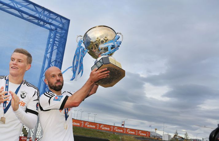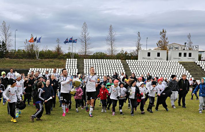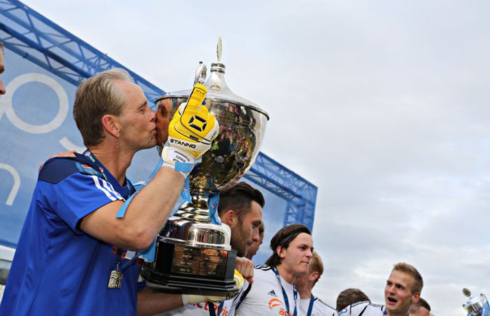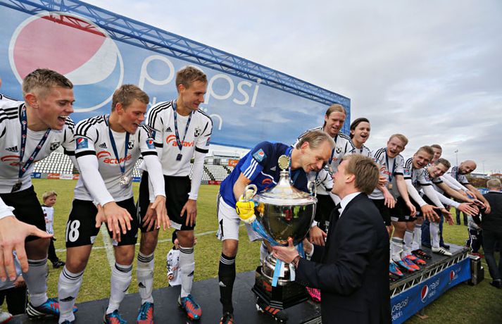 Gunnleifur Gunnleifsson, fyrirliði FH, tók á móti Íslandsmeistarabikarnum á Kaplakrikavelli í kvöld en Hafnfirðingar unnu Pepsi-deild karla í ár með yfirburðum. FH vann 2-1 sigur á Val í lokaumferð tímabilsins í dag en þetta var fimmtándi sigur FH á tímabilinu. Liðið endaði með 49 stig en næsta lið á eftir, Breiðablik, fékk 36 stig. Það var því innileg gleði í Kaplakrika í dag þar sem nýkrýndum Íslandsmeisturum var fagnað. Daníel Rúnarsson, ljósmyndari Vísis og Fréttablaðsins, tók þessar myndir.