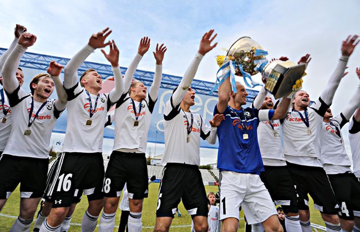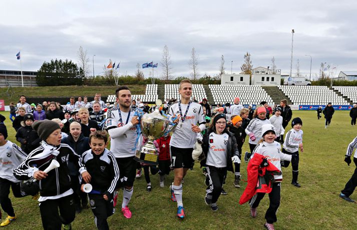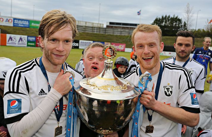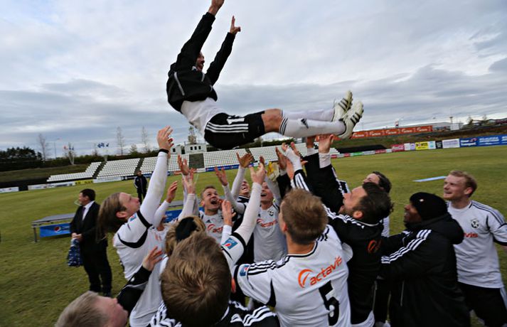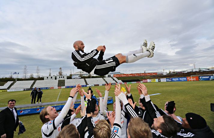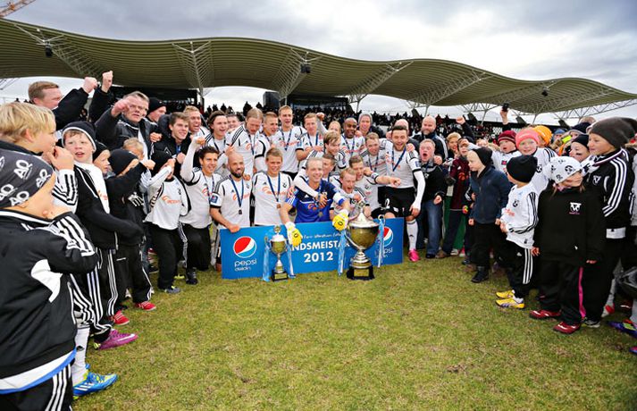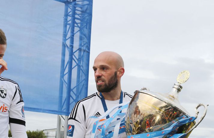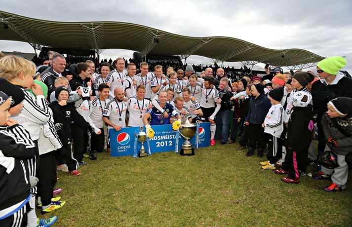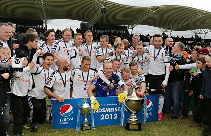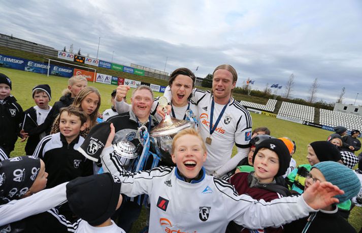 Gunnleifur Gunnleifsson, fyrirliði FH, tók á móti Íslandsmeistarabikarnum á Kaplakrikavelli í kvöld en Hafnfirðingar unnu Pepsi-deild karla í ár með yfirburðum. FH vann 2-1 sigur á Val í lokaumferð tímabilsins í dag en þetta var fimmtándi sigur FH á tímabilinu. Liðið endaði með 49 stig en næsta lið á eftir, Breiðablik, fékk 36 stig. Það var því innileg gleði í Kaplakrika í dag þar sem nýkrýndum Íslandsmeisturum var fagnað. Daníel Rúnarsson, ljósmyndari Vísis og Fréttablaðsins, tók þessar myndir.