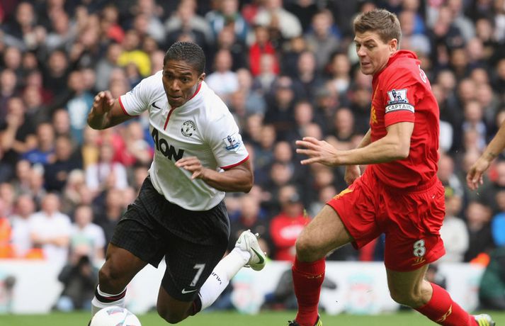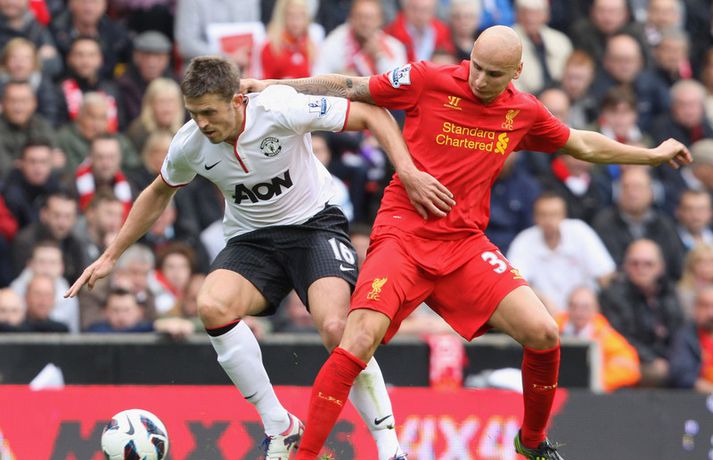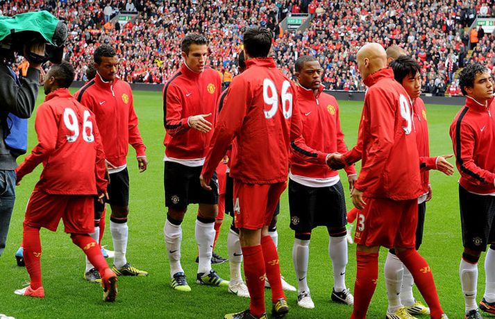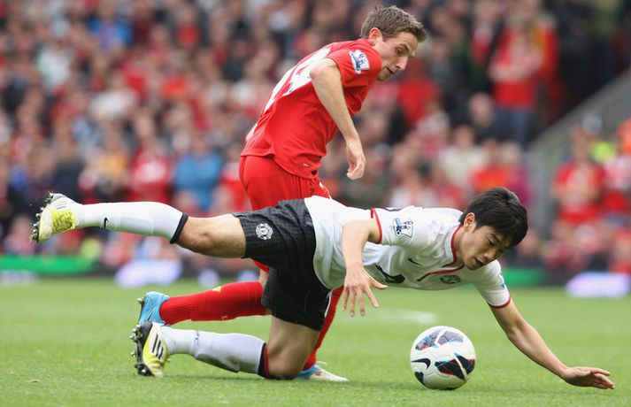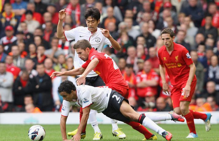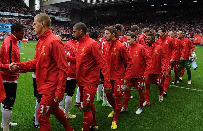 Halsey dómari stal senunni í sigri Man. Utd. á Liverpool 23. september 2012 12:00 Mynd/Nordic Photos/Getty Manchester United sigraði Liverpool 2-1 á útivelli í hádegisleik enska boltans í dag. Liverpool var mun sterkari aðilinn í leiknum þrátt fyrir að leika einum færri í rúmar 50 mínútur en Mark Halsey dómari stal senunni með stórum dómum sem réðu úrslitum í leiknum. Halsey rak Jonjo Shelvey útaf fyrir litlar sakir þegar sex mínútur voru til hálfleiks. Shelvey fór vissulega glæfralega í tæklinguna á móti Jonny Evans en það sama má segja um Evans en Shelvey fór beint í boltann og takkarnir snéru niður. Þrátt fyrir að vera einum færri komst Liverpool yfir á fyrstu mínútu seinni hálfleiks með marki Steven Gerrard. Það tók Manchester United aðeins fimm mínútur að jafna metin með mjög laglegu marki Rafael úr einni af fyrstu sóknum Man. Utd. í leiknum. Þegar fimmtán mínútur voru eftir af leiknum stal Halsey senunni á ný. Valencia féll í vítateig Liverpool án þess að nokkur maður kæmi við hann og Halsey benti beint á punktinn. Robin van Persie skoraði af öryggi úr spyrnunni og tryggði gestunum dýrmætan sigur. Þeirra 96 sem féllu í Hillsborough slysinu 1999 var minnst á fallegan hátt fyrir leikinn í ljósi sannleiksskýrslunnar sem kynnt var í síðustu viku. Ætla má þó að það verði ekki helsta umræðuefnið eftir leikinn heldur framganga Halsey dómara sem réð engan vegin við verkefnið og stærð leiksins. Manchester United lyfti sér í annað sæti deildarinnar með sigrinum en Liverpool er í fallsæti eftir fimm leiki, án sigurs. Gang leiksins í grófum dráttum má lesa hér að neðan:97. mínúta: Mark Halsey flautar til leiksloka. 2-1 sigur Mancester United staðreynd á lánlausu liði Liverpool.83. mínúta: Kelly í fínu færi en skalli hans ekki nógu góður.81. mínúta: 1-2. Van Persie skorar, Pepe Reina fór í rétt horn en vítið of fast og of utarlega.80. mínúta: Agger er borinn af leikvelli, nú verður hægt að taka vítið.76. mínúta: Halsey dæmir víti á Liverpool, á hvað veit enginn nema hann.65. mínúta: Liverpool enn og aftur aðgangsharðir. Susso með fínt skot en Lindegaard ver enn og aftur.61. mínúta: Liverpool er enn sterkari aðilinn þrátt fyrir að leika manni færri. Suarez var ekki langt frá því að skora en Lindegaard varði mjög vel frá honum.54. mínúta: Gerrard með skot beint á Lindegaard. Opinn og skemmtilegur leikur í seinni hálfleik.51. mínúta: 1-1. Það tók Man. Utd. ekki langan tíma að jafna. Valencia með fyrirgjöf, Kagawa kassaði boltann á Rafael sem átti frábært skot í fjærhornið.46. mínúta: 1-0. Það tók Liverpool 50 sekúndur að skora í seinni hálfleik. Fyrirliðinn Steven Gerrard réttur maður í teignum. Góð sókn upp hægri kanntinn, hinn 18 ára gamli Susso með fyrirgjöf, Man. Utd. nær ekki að hreinsa almennilega. Glen Johnson kemur boltanum á Gerrard sem skoraði af stuttu færi.Hálfleikur: 0-0. Liverpool mun betri í fyrri hálfleik en rauða spjaldið gerir heimamönnum erfitt fyrir.42. mínúta: Suarez með fínt skot beint úr aukaspyrnu en Lindegaard varði vel.39. mínúta: Jonjo Shelvey rekinn útaf. Ótrúlega strangur dómur. Liverpool verið mikið betri til þessa í leiknum.27. mínúta: Það er að lifna yfir leiknum aftur. Suarez með skemmtilega tilraun, rétt yfir.26. mínúta: Nani með skot yfir, beint úr aukaspyrnu af 25 metra færi.21. mínúta: Daniel Agger vill fá víti en ekkert dæmt. Líklega rétt hjá Halsey dómara.9. mínúta: Leikmenn Liverpool eru hættulegir í sínum aðgerðum. Van Persie rétt nær að stýra skoti Steven Gerrard aftur fyrir endamörk eftir hornspyrnu.7. mínúta: Giggs með fyrsta fína færið en skot hans rétt utan vítateigs sveif hárfínt framhjá markinu.Fyrir leik: You´ll Never Walk Alone var áhrifameira en nokkurn tímann fyrr. Allir sungu og heiðruðu minningu þeirra látnu sem aldrei fyrr.Fyrir leik: 96 blöðrum var sleppt upp í loft til minningar um þá sem misstu líf sitt í Hillsborough slysinu.Fyrir leik: Suarez og Evra tókust í hendur án allrar dramatíkur.Staðan í ensku úrvalsdeildinni. Mest lesið Ekkert bit í snáknum: „Hörmulegur og ætti að hætta“ Sport Stoltur af stráknum en ætlar ekki að kaupa hann aftur Handbolti „Þú birtir falsfrétt um mig, þú ert í banni“ Fótbolti United horfir til Þýskalands eftir höfnun Semenyo Enski boltinn Haaland stóðst vigtun eftir jólin Enski boltinn Þessi tíu eru tilnefnd sem Íþróttamaður ársins 2025: 23 ára aldursmunur Sport Goðsögn fallin frá Enski boltinn Cunha vill skemmta og Howe treystir leikmönnum Enski boltinn Kærður af knattspyrnusambandinu Enski boltinn Zidane sá soninn spila á Afríkumótinu Fótbolti Fleiri fréttir Cunha vill skemmta og Howe treystir leikmönnum United horfir til Þýskalands eftir höfnun Semenyo Haaland stóðst vigtun eftir jólin Hápunktarnir hingað til í enska boltanum Goðsögn fallin frá Kærður af knattspyrnusambandinu Bestu jólamörkin: Drogba, Scholes eða Giroud? Van de Ven bað Isak afsökunar: „Vildi ekki meiða hann“ Hvers vegna heillast stórliðin svo af Semenyo? Stewart, Snoop og Modric í eina sæng Vill ekki segja hversu lengi Bruno er frá Spyr hvort Guardiola stígi á vigtina Arsenal í undanúrslit eftir vító Man. Utd reyndi stíft en Semenyo kaus City „Tölfræðilega séð eiga þeir ekkert að vera í þessari stöðu“ Chelsea setur sig í samband við Semenyo Jiménez jafnaði bestu vítaskyttu sögunnar Slot mun sakna Isak í tvo mánuði eftir „glórulausa tæklingu“ Sjáðu „auma“ vítið sem skilaði Fulham sigri Fulham skildi Forest eftir við fallsvæðið Áfallið staðreynd og Isak búinn í aðgerð Fagnaði titli Liverpool sem óður maður um alla borg „Allir virðast elska hann“ „Þetta mun ekki buga okkur“ Guardi