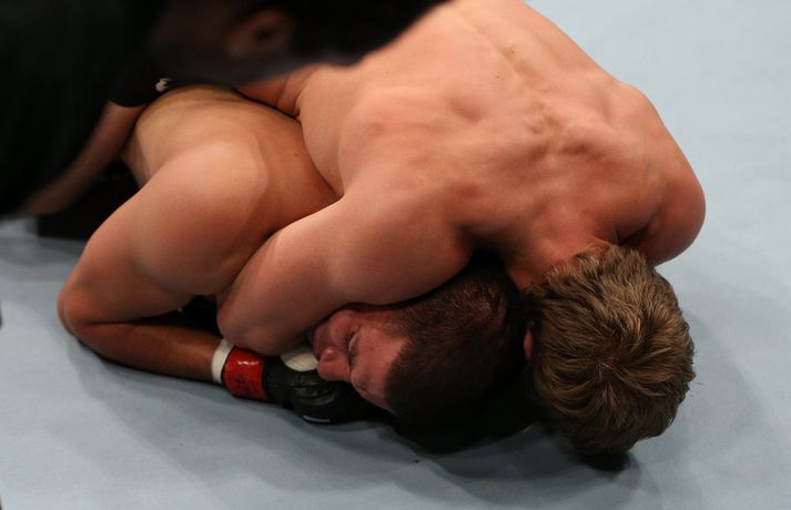 Gunnar tók Johnson í nefið | Myndir Eiríkur Stefán Ásgeirsson skrifar 30. september 2012 10:00 Gunnar fagnar sigrinum í gær. Nordic Photos / Getty Images Gunnar Nelson stimplaði sig inn í UFC-bardagasamtökin með stæl í gær þegar hann bar sigurorð af DaMarques Johnson í Nottingham á Englandi í gær. Það tók Gunnar ekki nema 3:34 mínútur að klára Johnson á hengingarbragði en Gunnar fékk varla högg á sig í bardaganum. Meðfylgjandi myndir segja meira en mörg orð. Íþróttir Tengdar fréttir Gunnar Nelson kláraði Johnson í fyrstu lotu Gunnar Nelson tók sinn fyrsta UFC-bardaga með trompi. Hann vann afar sannfærandi sigur á DeMarques Johnson strax í fyrstu lotu. 29. september 2012 18:12 Mest lesið Ógeðslega erfitt og ógeðslega vont en brosir oft í viku á eftir Sport Skortir Liverpool breidd þrátt fyrir gríðarleg fjárútlát síðasta sumar? Enski boltinn „Nú er nóg komið“ Fótbolti Sádar eru ekki að fara að byggja HM-leikvang ofan á skýjakljúfi Fótbolti „Búnir að sýna hvað við getum verið lélegir“ Körfubolti Hetja Englands á EM sleit krossband Enski boltinn NBA-leikmaður með krabbamein Körfubolti Lofar frekari fjárfestingum Enski boltinn Uppgjörið: Þýskaland - Ísland 42-31 | Þrot í Þýskalandi Handbolti Dagskráin í dag: Meistararnir á Króknum, Körfuboltakvöld og allskonar Sport Fleiri fréttir Nýr þjálfari Juventus er með Napoli-húðflúr Eldgos og brjósklos skapa óvissu: „Vonum bara að móðir náttúra leyfi þetta“ Ógeðslega erfitt og ógeðslega vont en brosir oft í viku á eftir „Nú er nóg komið“ NBA-leikmaður með krabbamein Skortir Liverpool breidd þrátt fyrir gríðarleg fjárútlát síðasta sumar? Sádar eru ekki að fara að byggja HM-leikvang ofan á skýjakljúfi Dagskráin í dag: Meistararnir á Króknum, Körfuboltakvöld og allskonar Hetja Englands á EM sleit krossband Lofar frekari fjárfestingum Haukur Helgi: Höfum ekki verið að spila góðan körfubolta „Getum verið fjandi góðir“ Uppgjörið: Álftanes-Njarðvík 93-92 | Heitur Haukur var hetjan á Álftanesinu Uppgjörið: Keflavík - Þór Þ. 86-82 | Þarf ekki alltaf að vera fallegt ef það virkar „Varnarleikur snýst eiginlega bara um að nenna“ Uppgjörið: Valur - Grindavík 55-90 | Taplausir Grindvíkingar kjöldrógu Val ÍR áfram eftir sigur í Mosfellsbæ „Búnir að sýna hvað við getum verið lélegir“ KR - ÍA 109-75 | KR-ingar sýndu allar sínar bestu hliðar þegar þeir burstuðu Skagamenn Uppgjörið: Þýskaland - Ísland 42-31 | Þrot í Þýskalandi Juventus ræður Spalletti út tímabilið Tilkynnti um óléttu og nýjan samning á sama tíma Meistaradeildin skiptir um bjór og Heineken snýr sér að padel Aron Einar kominn á toppinn Patrekur hættur eftir dapurt gengi Stjörnunnar Tölur úr Bestu: Hallgrímur Mar bjó til langflest færi Íslandsmeistararnir frá því fyrir sextíu árum heiðursgestir í kvöld Góðvinur þáttarins meiddist illa og menn áttu erfitt með að horfa Hljóp hálft maraþon í Crocs og drakk úr skónum Fantasýn: „Þessi vörn er eitthvað skrímsli“ Sjá meira