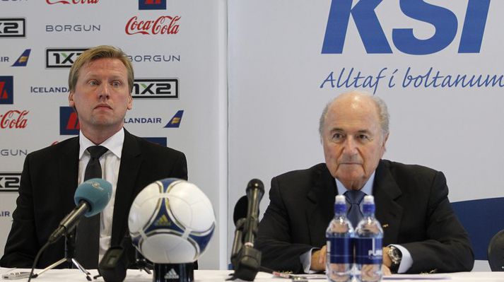 Blatter sat fyrir svörum í Laugardalnum 9. október 2012 11:58 Mynd/Pjetur Vísir var með beina textalýsingu frá blaðamannafundi Sepp Blatter, forseta Alþjóðaknattspyrnusambandsins. Þar voru hin ýmsu málefni tengd FIFA rædd. Smelltu á Refresh eða ýttu á F5-takkann á lyklaborðinu til að sjá nýjustu upplýsingar frá blaðamanni Vísis á staðnum.12.40: Blatter færir KSÍ gjöf. Þar með er fundinum lokið.12.38: „Ertu frá Sviss? Já, þú ert frá Sviss. Ég er hlutlaus. Ég er alþjóðlegur," sagði Blatter. „Ég vonaðist til að þú myndir ná leiknum gegn Sviss," sagði Geir við Blatter. „Það gekk vel síðast - við unnum Rússa."Blatter: „Nei, ég ætla ekki að vera ráðgjafi svissneska landsliðsins. En miðað við það sem ég hef séð og finnst merkilegt hversu gott skipulag ríkir hér. Þjálfaramálin eru í mjög góðum málum og er það grundvallaratriði. Þetta er ekki svona í öllum löndum. Ég veit til þess að í sumum héröðum í Sviss fást ekki knattspyrnuþjálfarar til að starfa með börnum." „Ísland á marga góða knattspyrnumenn víða um Evrópu. 60 atvinnumenn. Albert Guðmundsson var brautryðjandi og mikil goðsögn. Ég óska Íslandi góðs gengis gegn Albaníu og Sviss."12.37: Blaðamaður frá Sviss spyr - hvað fannst þér merkilegast við íslenska knattspyrnu?12.36: Hann segir aftur frá kynningu Sigurður Ragnars og hvað honum fannst mikið til koma.12.35: „Ég held að þið ættuð að byrja á EM. Lágmarksfjöldi liða á mótum er sextán þjóðir. Til þess þarf marga leikvanga. Nú fer HM U-17 kvenna fram í Aserbaídsjan þar sem gott starf hefur verið unnið. Ef að yngri landslið kvenna kemst einhvern daginn í lokakeppni á vegum FIFA - þá væri það fyrsta skrefið."12.35: Á Ísland möguleika á að Ísland haldi HM fyrir smærri þjóðir?12.34: Er búið að slá vetarkeppni af borðinu fyrir HM 2022 í Katar. „Eins og málin standa þá eru allt þetta vangaveltur. Við hjá FIFA höfum ekki fengið neinar bónir eða kröfur frá Katar um að breyta keppnisdagsetningum."12.33: „Þetta mál er margra ára gamalt. Það er nú höndum framkvæmdarstjórnar FIFA að taka ákvörðun um frekari rannsóknir. Ég krafðist þess. Það er ekki í mínum höndum og get ekki svarað þessari spurningu."12.32: Spurður um ISL mútumálið, þar sem fyrrum forseti FIFA hafi þegið mútur. Voru viðbrögð Blatter röng?12.30: „Þetta er í fyrsta sinn sem knattspyrnan fer til Austur-Evrópu. Íþróttir voru síðast þegar Ólympíuleikar voru haldnir í Rússlandi árið 1980. Við vorum þar í síðustu viku, þar sem við tilkynntum keppnisborgir. Ellefu borgir voru tilkynntar. Þeir munu skila af sér mjög góðri HM. Síðar í framtíðinni förum til Arabíulandanna."12.29: Blatter ræðir einnig um Álfukeppnina sem haldin verður í Brasilíu á næsta landi. Það verður prófraun fyrir HM 2014. Hann er núna löngu kominn út fyrir efnið og byrjaður að ræða um praktíska hluti keppninnar - í hvaða borgum leikið verður og svo framvegis.12.28: „Menning þessara landa er allt öðruvísi en í Evrópu. Það eru mörg vandamál í þessum löndum og knattspyrnan getur ekki leyst þau öll. Brasilía er þó á uppleið og er sjötta stærsta efnahagsveldi í heiminum. Ef Brasilía vill spila á sinn máta geta þeir orðið heimsmeistarar. Ef þeir vilja spila evrópskan stíl þá verður Evrópuland heimsmeistari."12.27: „Þetta var líka sagt fyrir HM í Suður-Afríku. Glæpatíðnin jókst aldrei. Nú förum við Brasilíu. Þar búa 200 milljónir. HM verður öruggt. En það er ekki hægt að tryggja öryggi landsins fyrir eða eftir HM. Ólympíuleikar fara líka fram í Brasilíu árið 2014. Yfirvöld í Brasilíu munu gera allt sem þau geta til að stemma við glæpum."12.26: Blatter er spurður um glæpatíðni í Brasilíu og Rússlandi, þar sem næstu HM fara fram.12.25: Blatter heldur áfram að segja frá góðgerðarstarfi FIFA um allan heim. Blatter svarar hverri spurning í löngu máli og veður úr einu í annað.12.23: „Þegar Suður-Afríka fékk HM árið 2004, var lýðveldið aðeins tíu ára gamalt. Eftir HM er landið nú hluti af alþjóðlegu samfélagi sem Indland, Suður-Kórea og Brasilía er í. Efnahagurinn hefur stórbatnað. Auðvitað er enn mikið starf sem á eftir að vinna í Suður-Afríku. Við erum enn að leggja okkar af mörkum þar, sem og í fleiri löndum víða um heim."12.22: Blatter er spurður um HM 2010 í Suður-Afríku.12.20: „Það eru háar og miklar fjárhæðir í knatspyrnunni. Bæði hjá okkur og félögunum. Freistingarnar eru miklar. En 70 prósent teknanna rata beint og óbeint til aðildarsambandanna, til að efla íþróttina um allan heim. En það er ómögulegt að fylgjast með hverjum eyri og hvert hann ratar. En við þurfum samstöðu og líka af hálfu fjölmiðla. Ég er heiðursmeðlimur í AIPS (Alþjóðasamtökum íþróttafréttamanna) en ég sit því miður hérna megin við borðið, þótt ég sé einn ykkar."12.18: „Mér hefur verið tekið vel af landshöfðingjum hvert sem ég fer. Ég, og FIFA, erum ekki vinsæl alls staðar. Það er ómögulegt að gera öllum til geðs. Það er allt í lagi að gagnrýna. Ekki gleyma að það eru óvinir í þessari íþrótt, eins og ég svaraði áðan."12.16: „Það fer eftir sjónarhóli hvers og eins. Sums staðar í heiminum höfum við fengið mjög góð viðbrögð við okkar starfi, sérstaklega í tengslum við heimsmeistarakeppnir. Það eru 300 milljón iðkendur í heiminum. Það er eins og stór heimsálfa og stórt land. FIFA getur ekki borið ábyrgð á gjörðum þeirra allra. En við tókum þá ákvörðun árið 2010, eftir HM, að efla starf siðnefndar. Sex meðlimir í framkvæmdarstjórn FIFA hafa stigið frá borði."12.16: Hvað er orðspor FIFA í heiminum?12.15: Hann segir fr