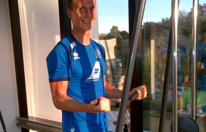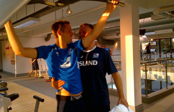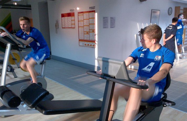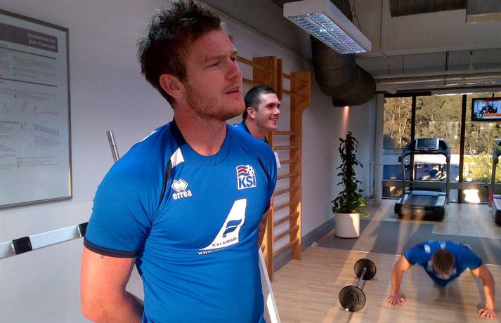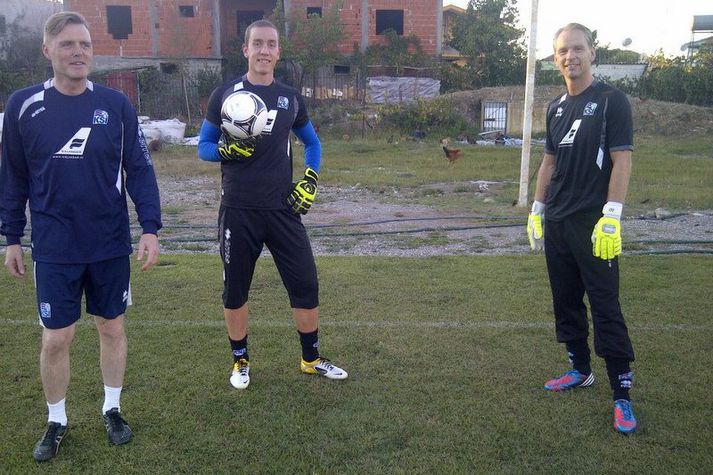 Íslenska landsliðið í knattspyrnu er komið til Albaníu þar sem liðið mun mæta heimamönnum í undankeppni HM 2014 á föstudagskvöldið. Gunnleifur Gunnleifsson, annar markvarða landsliðsins, sagði á Facebook-síðu sinni í kvöld að þeir hefðu æft við nokkuð sérstakar aðstæður í dag. „Fór á markmannsæfingu hér í Albaníu. Við Hannes Þór Halldórsson æfðum á velli þar sem hænur og dauður hundur(allavega hreyfði hann sig ekki) voru bara hinum megin við línuna!! Alveg eðlilegt hérna!" Hér fyrir ofan má sjá skemmtilegar myndir sem voru birtar á Facebook-síðu KSÍ í dag.Vísir