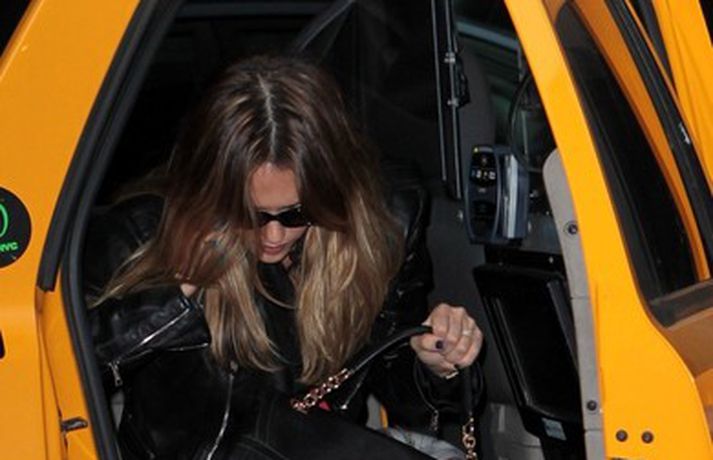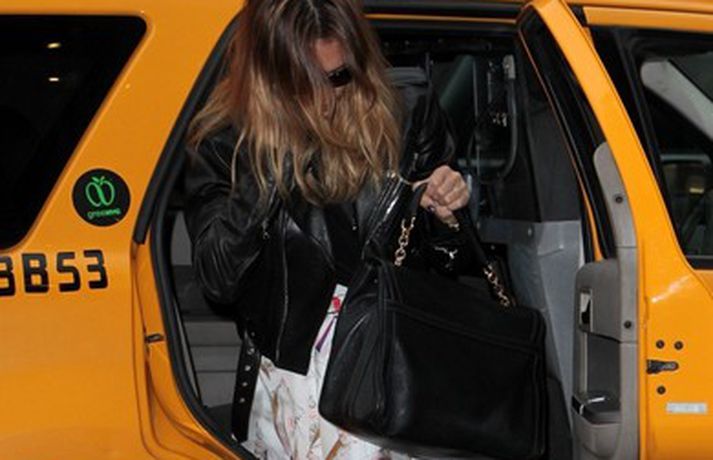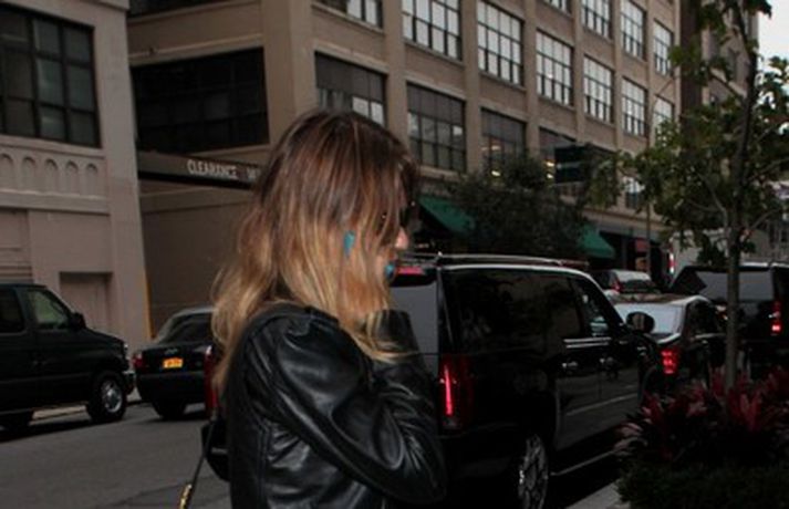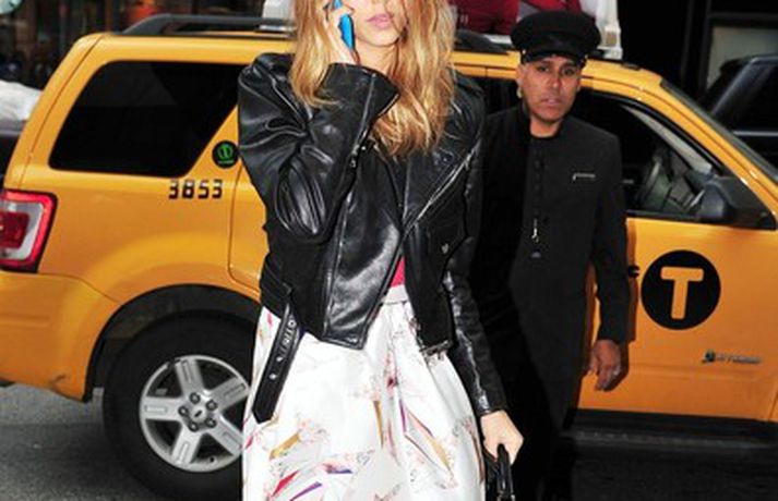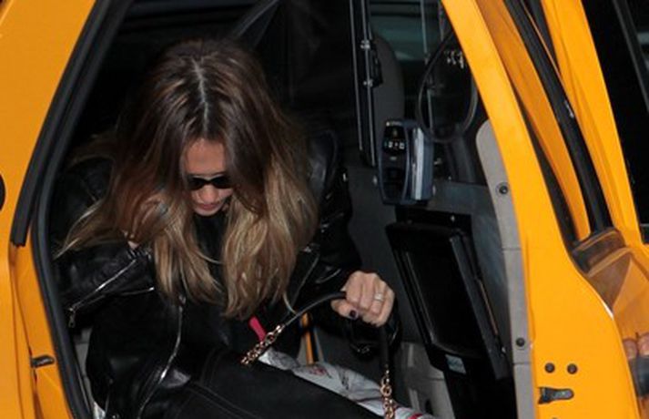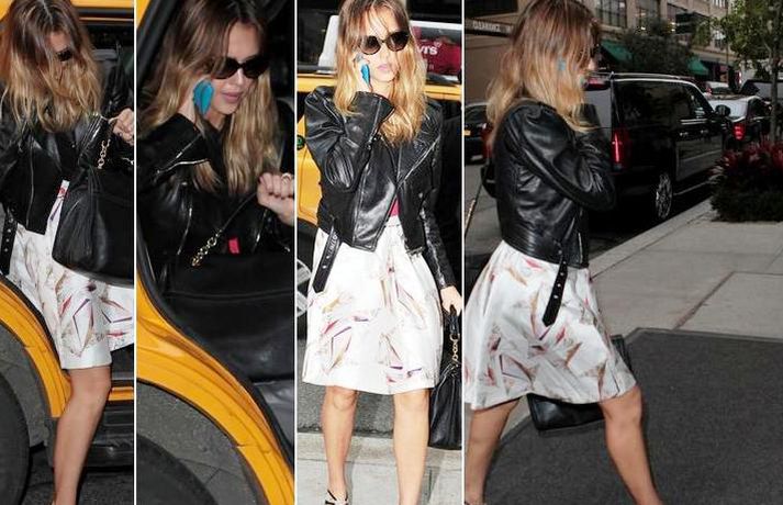 Leikkonan Jessica Alba var mynduð í New York þegar hún yfirgaf leigubíl. Þá var leikkonan í miðju samtali eins og sjá má á myndunum. "Ég er ekki hrifin af of mikilli athygli," lét leikkonan hafa eftir sér. Takið eftir leðurjakkanum við fallega munstrað pilsið og hælaskóna.
