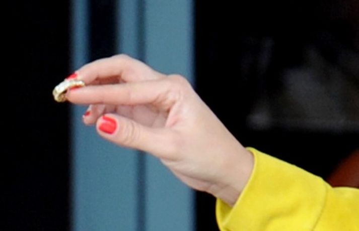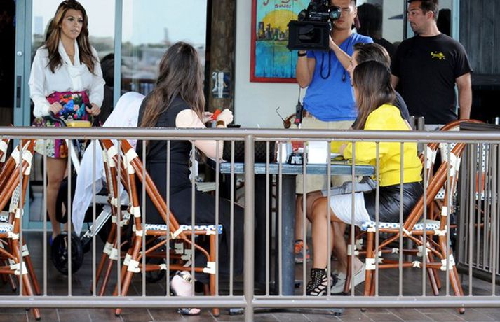 Kim Kardashian hitti systur sínar þær Khloe og Kourtney ásamt Scott Disick yfir hádegisverði á South Beach um helgina. Athygli vakti að Kim sýndi þeim stóran gullhring sem skoðaður var í bak og fyrir. Velta fjölmiðlar því nú fyrir sér hvort hún ætli að biðja kærastans og rapparans Kanye West. Sitt sýnist hverjum um það mál en eins og flestir vita á Kim ekki farsælan feril þegar kemur að hjónaböndum. Kannski gengur betur næst.Hringurinn sem Kim sýndi systrum sínum.