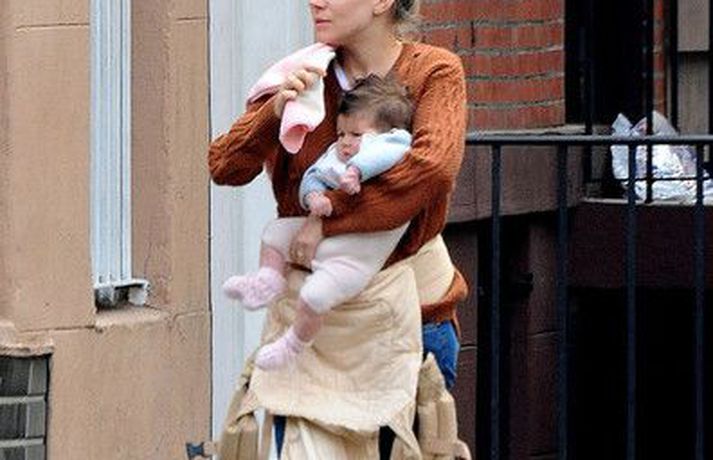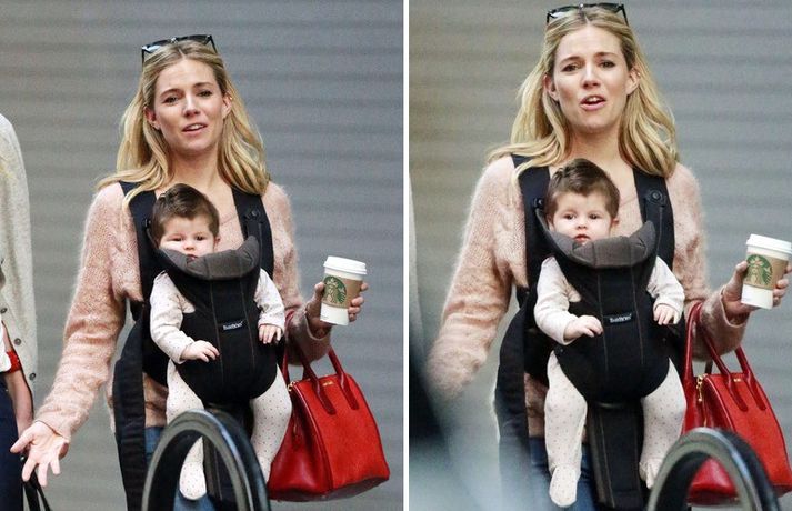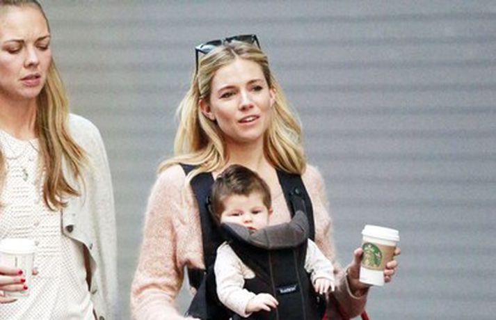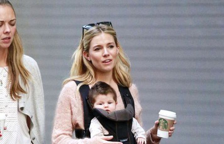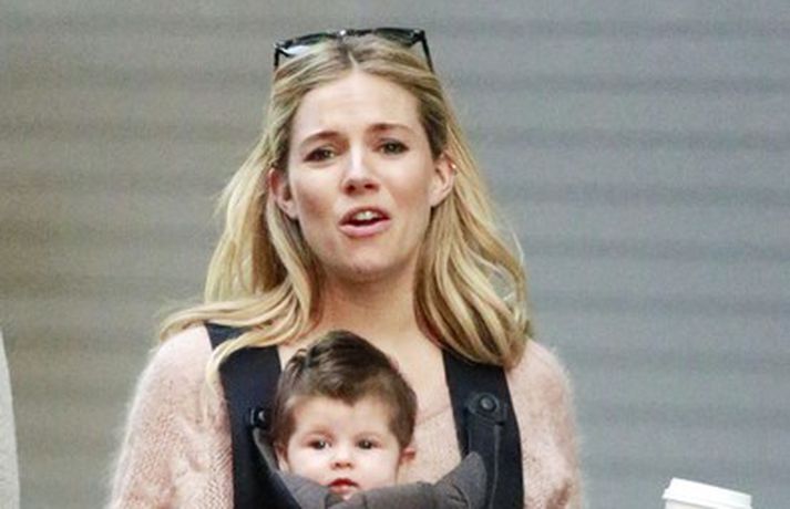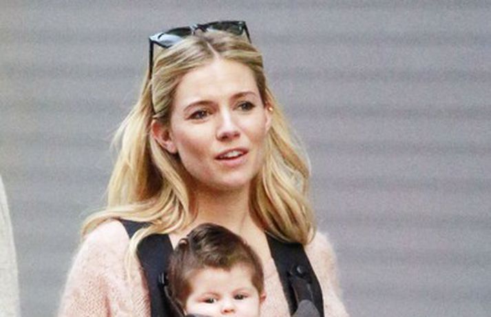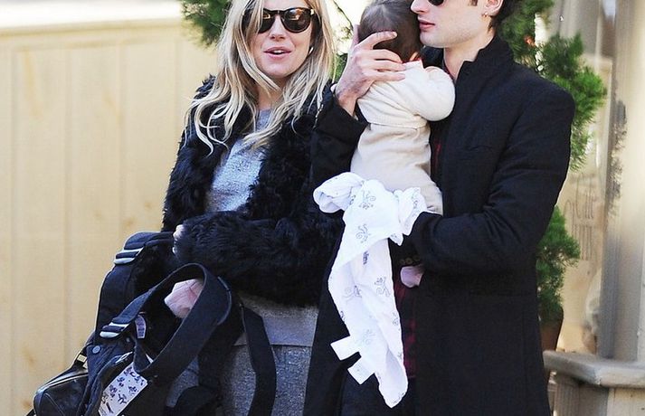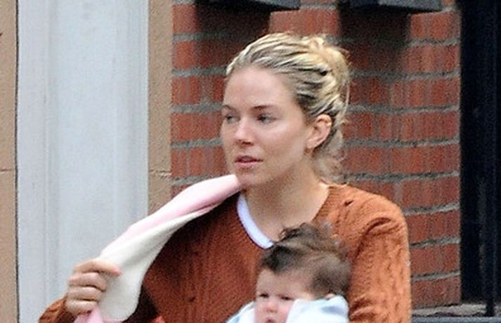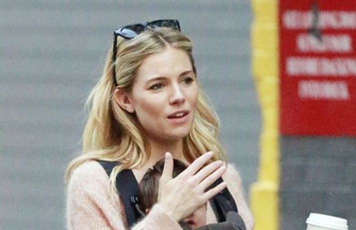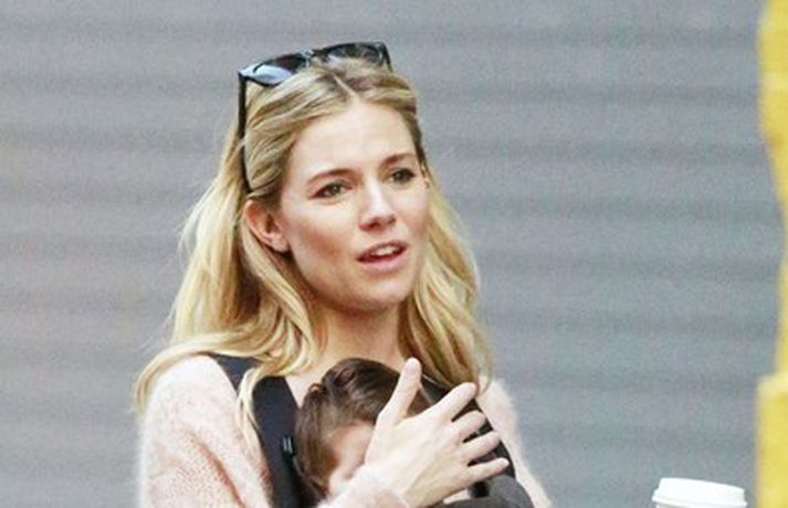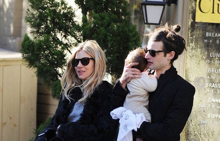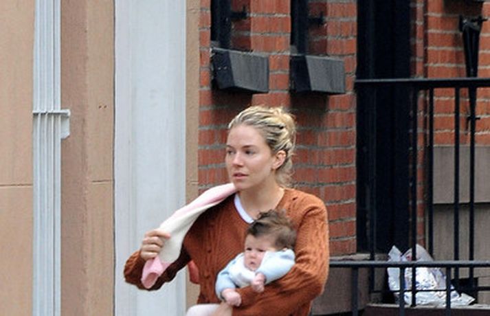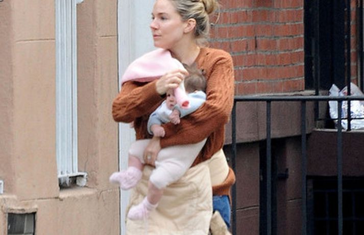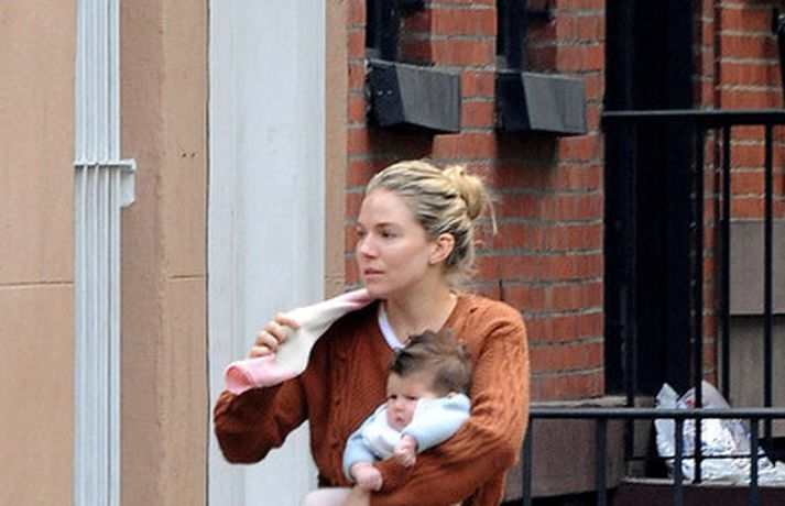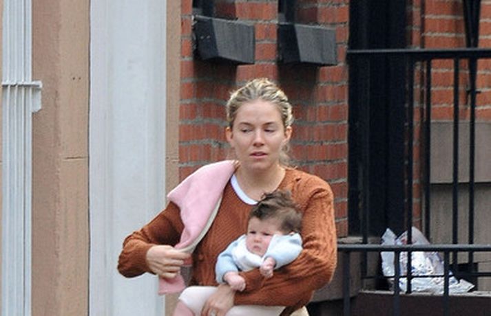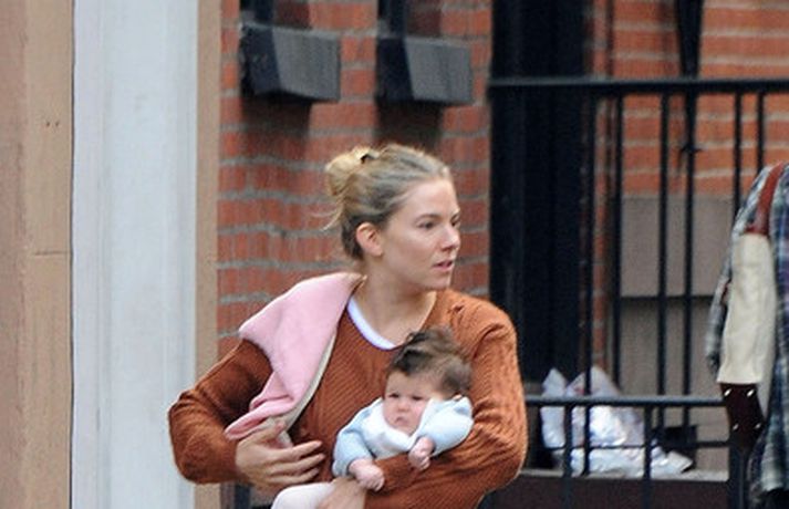 Breska leikkonan Sienna Miller, 30 ára, og unnusti hennar, leikarinn Tom Sturridge, 26 ára, voru mynduð með þriggja mánaða gamla stúlkuna þeirra, Marlowe, á götum New York borgar í gær. Eins og sjá má á myndunum fær fjölskyldan ekki frið - hún er hundelt af ljósmyndurum hvert sem hún fer. Fylgifiskur frægðarinnar segja sumir! Stúlkan er algjört krútt.Lífið leikur við Siennu Miller.