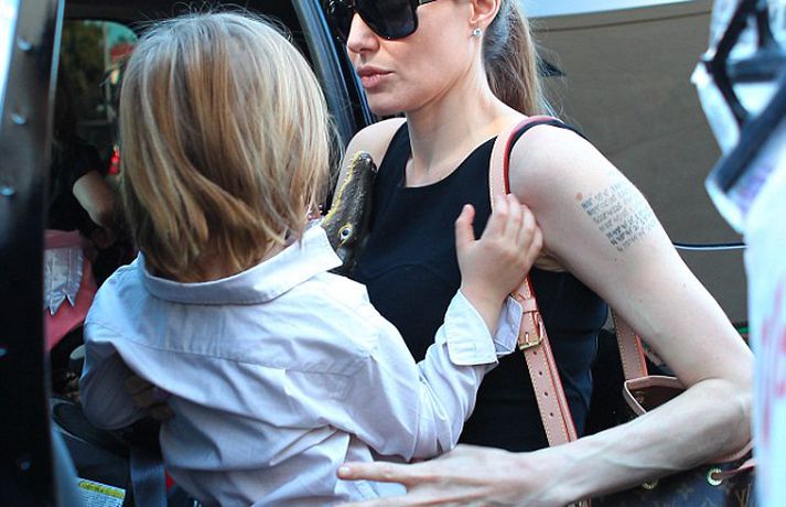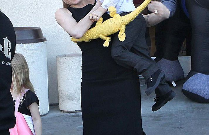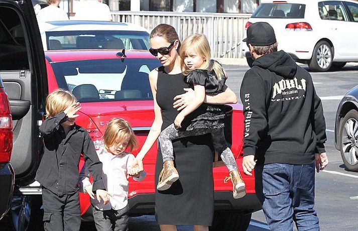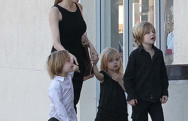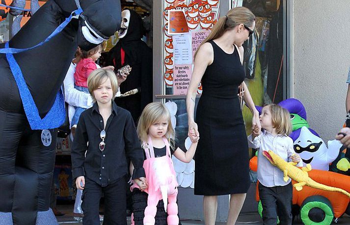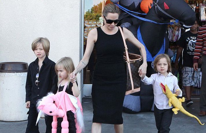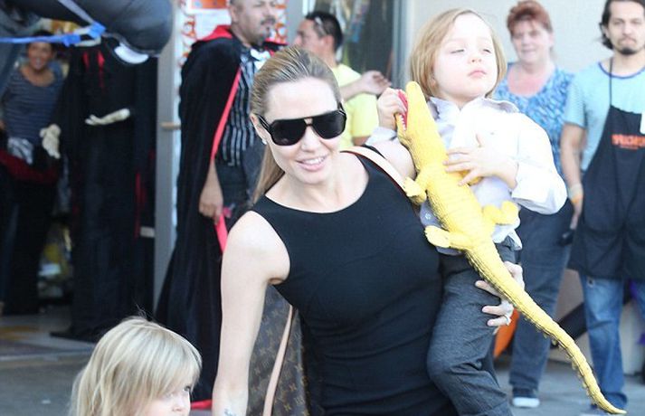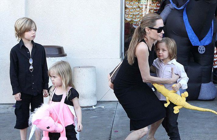Leikkonan Angelina Jolie, 37 ára, var afslöppuð með tvíburana Vivienne og Knox, 4 ára, og Shiloh, 6 ára., þar sem hún verslaði búninga og leikföng. Eins og sjá má leiddi Angelina börnin en ljósmyndarar biðu fyrir utan leikfangaverslunina til að mynda frægu fjölskylduna.Fallegur barnahópurinn.Nóg að gera hjá Angelinu.Óvenju afslöppuð með ljósmyndara í eftirdragi.