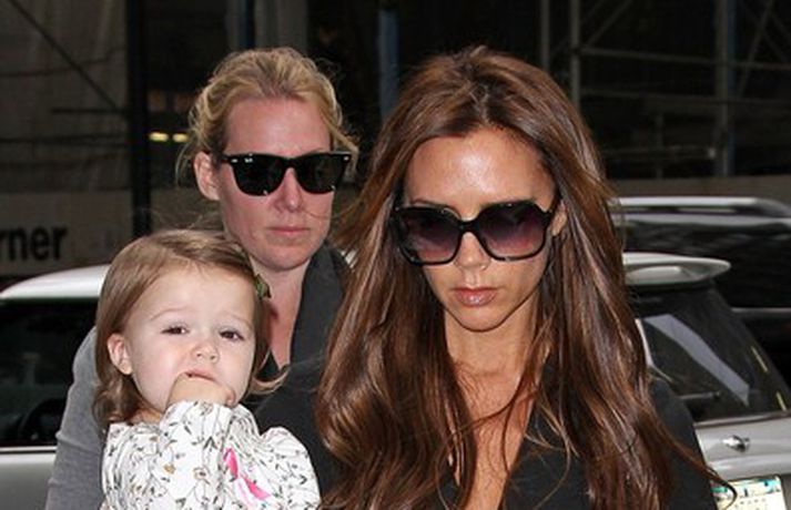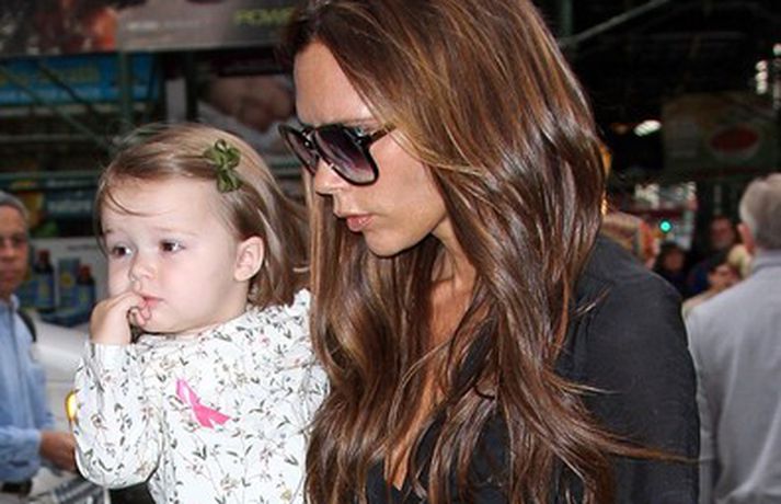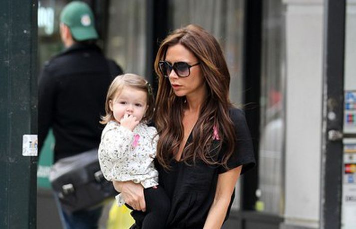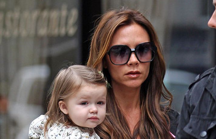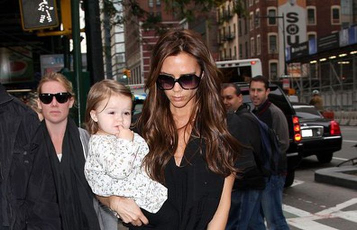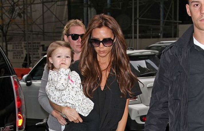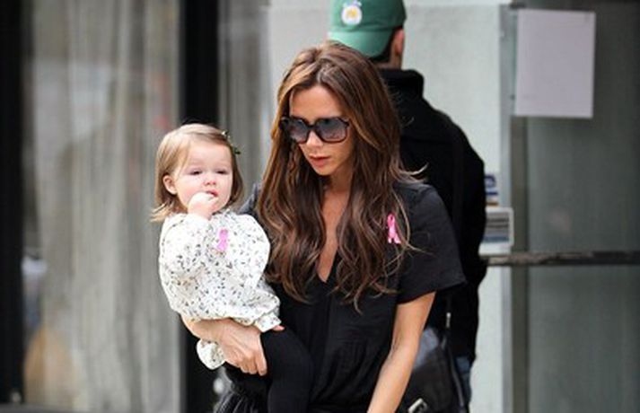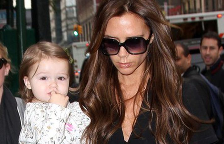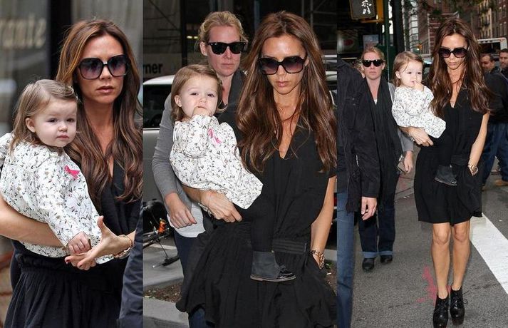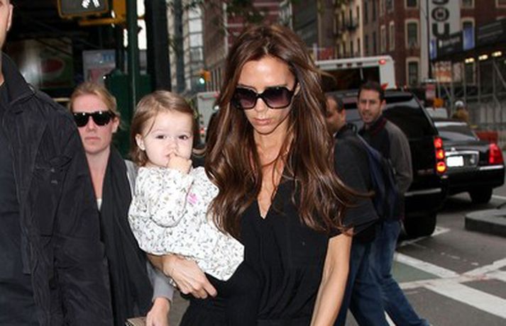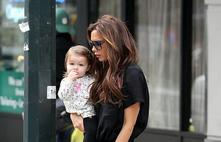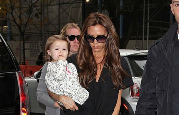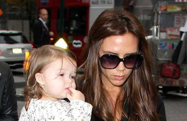 Victoria Beckham, 38 ára, var mynduð með dóttur sína, Harper, í gær þegar þær yfirgáfu hótelið sem þær dvöldu á í New York. Tískuhönnuðurinn segir dóttur sína leika sér eins og synir hennar þrír sem er eðlilegt enda er Harper eina stelpan í systkinahópnum. Drengirnir leika sér í fótbolta daginn út og inn eins og pabbi þeirra, David Beckham. Hver veit nema Harper geri slíkt hið sama í framtíðinni.Harper og Victoria eru fallegar mæðgur.Mæðgurnar ganga rauða dregilinn.