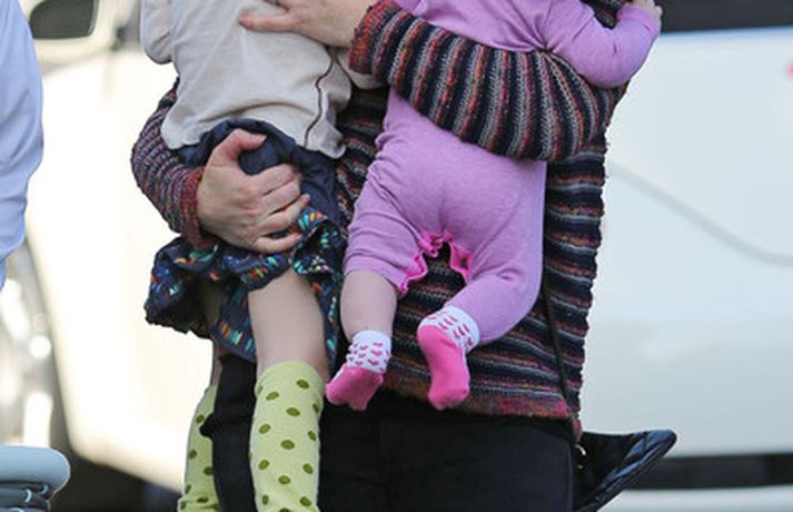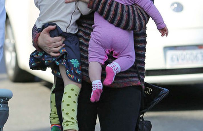 Þær Satyana, þriggja ára og Keeva fimm mánaða kepptust um mömmuknúsið eins og sjá má á meðfylgjandi myndum. Leikkonan var yfirveguð og gaf dætrum sínum allan þann tíma sem þær þurftu. Nutu mægðurnar svo dagsins á markaðnum.