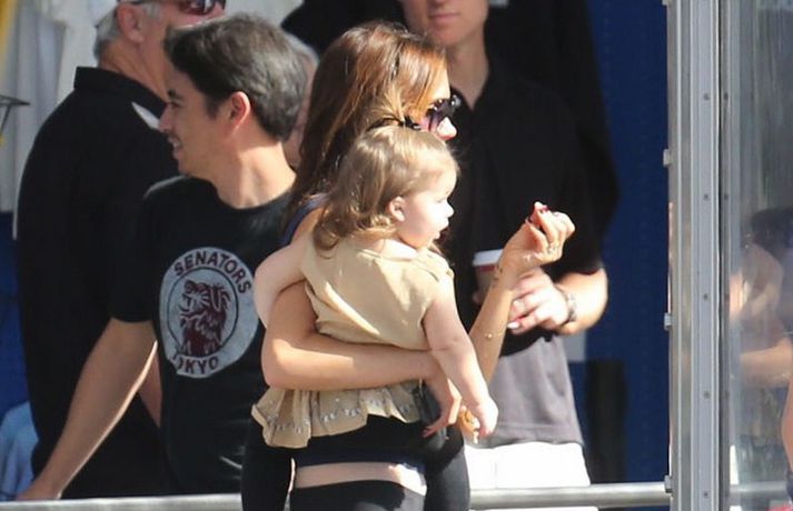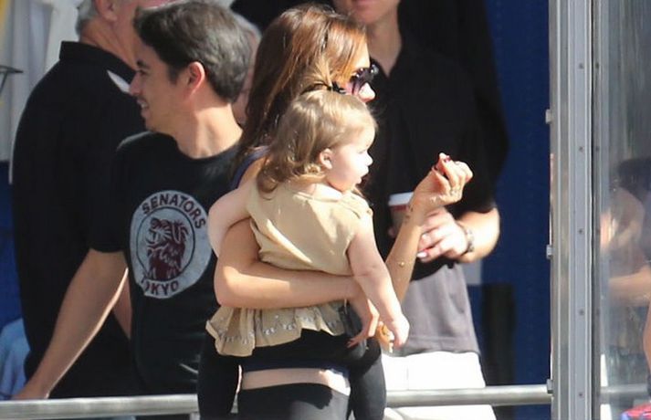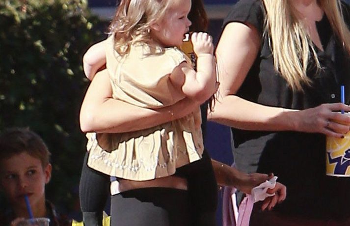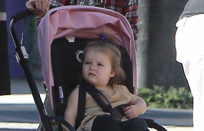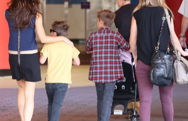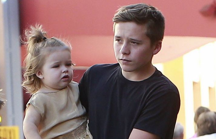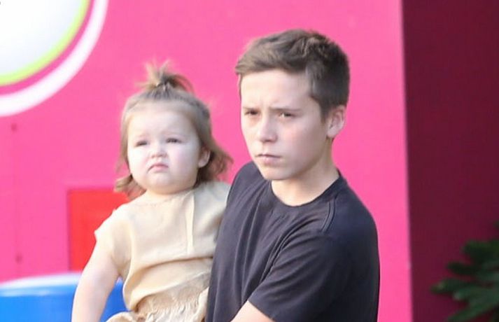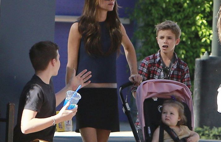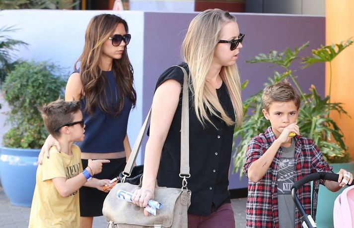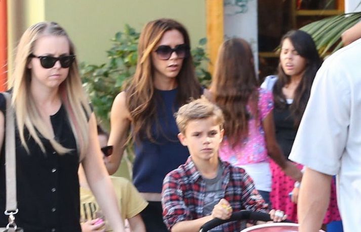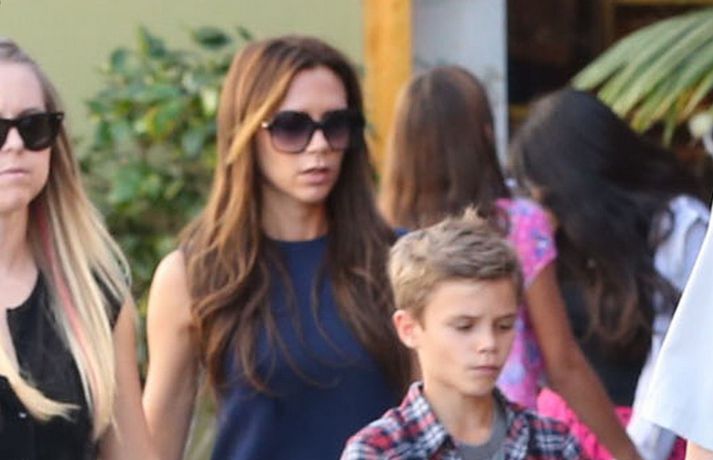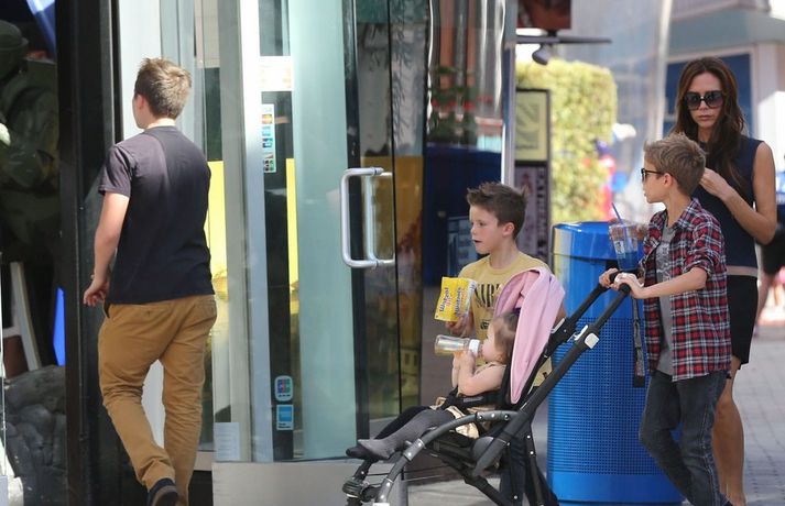 Victoria Beckham, 38 ára, var á lágbotna skóm í gær sunnudag. Það þykir fréttnæmt því hún lætur aðeins sjá sig á himinháum hælaskóm þegar hún er á ferðinni. Í gær var hún með börnunum sínum Brooklyn, Romeo, Cruz, og Harper. Eins og sjá má voru fjölskyldumeðlimir í góðu skapi. Sólgeraugun eru hennar vörumerki.Brooklyn heldur á litlu systur.Lágbotna skór og slúðurheimurinn fer á hliðina.