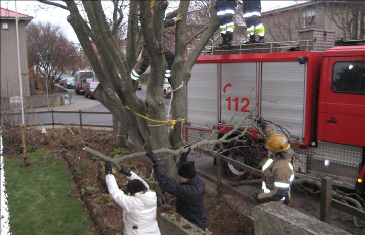 Eitt gríðarstórt tré rifnaði upp með rótum í Mosfellsbæ í óveðrinu í dag. Björgunarsveitarmenn brugðust skjótt við og voru mættir á svæðið innan nokkurra mínútna. „Þeir voru strax komnir og söguðu tréð niður," segir Fríða Líf Vignisdóttir, íbúi að Leirutanga 4 í Mosfellsbæ. Tréð rifnaði upp um fjögur leytið í dag og urðu íbúar ekki varir við það fyrr en nokkru síðar. Ekkert annað skemmdist þegar tréð féll. Tréð sem um ræðir er um þrjátíu ára gamalt en þrátt fyrir þessa þrjátíu ára reynslu af óveðri stóðst það ekki veðurofsann í dag, enda er engu líkara en Sandy sjálf hafi ætt yfir Ísland. „Vanalega er svakaleg jólasería í þessu tré á hverju ári en verður líklega ekki þetta ár," segir Fríða. Fríða hvetur fólk eindregið til að kaupa Neyðarkallinn til að styðja björgunarsveitirnar. „Þeir eru að passa upp á okkur. Standa sig gríðarlega vel," segir hún. Tréð í Mosfellsbæ var ekki eina tréð sem stóðst ekki óveðrið, því eins og sjá má á myndinni hér að neðan klofnaði eitt myndarlegt 70 ára gamalt tré nánast í sundur í veðrinu í morgun. Slökkviliðsmenn voru hins vegar fljótir á staðinn og björguðu málunum með því að festa band utan um tréð svo það myndi ekki klofna í sundur og detta á götuna með tilheyrandi afleiðingum.70 ára gamalt tré var við það að klofna á Kjartansgötu 1 í Norðurmýrinni.Mynd/Óðinn Snær