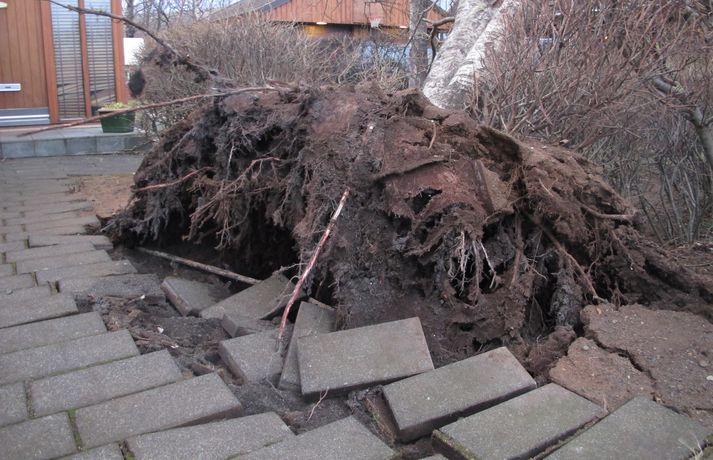 Tré rifnuðu upp með rótum BBI skrifar 2. nóvember 2012 18:01 30 ára gamalt tré rifnaði upp með rótum í Mosfellsbæ í dag. Mynd/Vignir Kristjánsson Eitt gríðarstórt tré rifnaði upp með rótum í Mosfellsbæ í óveðrinu í dag. Björgunarsveitarmenn brugðust skjótt við og voru mættir á svæðið innan nokkurra mínútna. „Þeir voru strax komnir og söguðu tréð niður," segir Fríða Líf Vignisdóttir, íbúi að Leirutanga 4 í Mosfellsbæ. Tréð rifnaði upp um fjögur leytið í dag og urðu íbúar ekki varir við það fyrr en nokkru síðar. Ekkert annað skemmdist þegar tréð féll. Tréð sem um ræðir er um þrjátíu ára gamalt en þrátt fyrir þessa þrjátíu ára reynslu af óveðri stóðst það ekki veðurofsann í dag, enda er engu líkara en Sandy sjálf hafi ætt yfir Ísland. „Vanalega er svakaleg jólasería í þessu tré á hverju ári en verður líklega ekki þetta ár," segir Fríða. Fríða hvetur fólk eindregið til að kaupa Neyðarkallinn til að styðja björgunarsveitirnar. „Þeir eru að passa upp á okkur. Standa sig gríðarlega vel," segir hún. Tréð í Mosfellsbæ var ekki eina tréð sem stóðst ekki óveðrið, því eins og sjá má á myndinni hér að neðan klofnaði eitt myndarlegt 70 ára gamalt tré nánast í sundur í veðrinu í morgun. Slökkviliðsmenn voru hins vegar fljótir á staðinn og björguðu málunum með því að festa band utan um tréð svo það myndi ekki klofna í sundur og detta á götuna með tilheyrandi afleiðingum.70 ára gamalt tré var við það að klofna á Kjartansgötu 1 í Norðurmýrinni.Mynd/Óðinn Snær Mest lesið Enn fleirum sagt upp hjá Árvakri Innlent Þessir Íslendingar kvöddu á árinu 2025 Innlent Kristrún ræðir við Pétur um borgarstjórnarframboð Innlent Eftirminnilegasta augnablikið á ferlinum: „Hann sat á móti mér nokkuð rauður og þrútinn og hvæsti“ Innlent 70 prósent landsmanna hlynnt banni Innlent Ríkisstjórnin sek um ósanngjarna mismunun Innlent Söfnun fyrir Kjartan gengur vel Innlent Neita að ræða við Úkraínumenn vegna meintrar árásar á heimili Pútíns Erlent Árangur aðgerða ekki staðist væntingar almennings Innlent Sjómenn mótmæla breytingum á samsköttun hjóna Innlent Fleiri fréttir Sátt við fyrsta árið og taka stöðuna vegna forfalla ráðherra á næstu dögum Tíu létust í umferðinni á árinu og alvarlegustu slysunum fækkar ekki Árangur aðgerða ekki staðist væntingar almennings Enn fleirum sagt upp hjá Árvakri Ríkisstjórnin sek um ósanngjarna mismunun Vonbrigði í menntamálum og áramótasprengja Hafa áhyggjur af frelsissviptingu barna í brottfararstöð Kristrún ræðir við Pétur um borgarstjórnarframboð Níu ráðherrar funda með Höllu Söfnun fyrir Kjartan gengur vel Komu auga á strandaða ferðamenn við Heklu Hvetja fólk til að plokka flugeldarusl á nýársdag Eftirminnilegasta augnablikið á ferlinum: „Hann sat á móti mér nokkuð rauður og þrútinn og hvæsti“ Víðir hefur nú loks tíma fyrir Lunch United Samfélagsmiðlabann án fræðslu stoðar lítið Samfélagsmiðlabann nýtur mikils stuðnings og flugeldasalan í fullum gangi Hægt að gefa hundum róandi og lyf til að gleyma um áramót Sjómenn mótmæla breytingum á samsköttun hjóna 70 prósent landsmanna hlynnt banni Þessir Íslendingar kvöddu á árinu 2025 Slökkvilið höfuðborgarsvæðisins: „Þorgerður er afar indæl“ Tvö handtekin fyrir þjófnað og þrír fyrir sölu og dreifingu Stoltastur af veiðigjaldinu og telur aðrar skattabreytingar hafa lítil áhrif á heimilin Föðurnum enn haldið sofandi í öndunarvél Fylgi stjórnarflokkanna dalar Föðurnum í Suður-Afríku enn haldið sofandi Skipuðu húsráðanda að elda fyrir sig áður en ræningjarnir ruddust inn Fannst látinn utandyra í Borgarnesi Halldór Blöndal borinn til grafar Fimm með vanlíðan komast í Skjólshús í tvær vikur Sjá meira