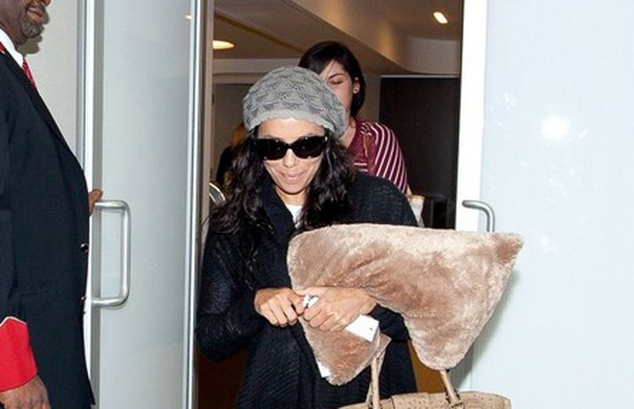 Eva Longoria var vægast sagt afslöppuð og heimilisleg að sjá þegar hún lagði leið sína í flug á dögunum. Var leikkonan óförðuð með húfu, stóran kodda undir handleggnum svo að það færi vel um hana í fluginu. Lét Longoria það lítið á sig fá þó svo að ljósmyndarar eltu hana inn á flugvöll og ákvað að brosa bara sínu breiðasta til þeirra. Það er óhætt að segja að Longoria sé alveg laus við stjörnustælana sem hrjá sumar stjörnurnar