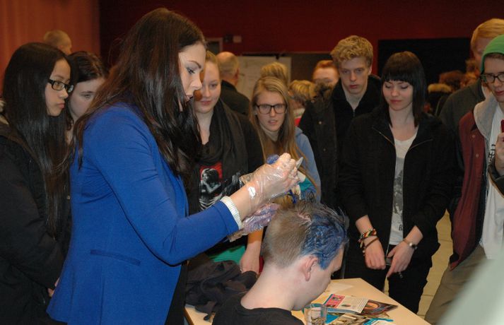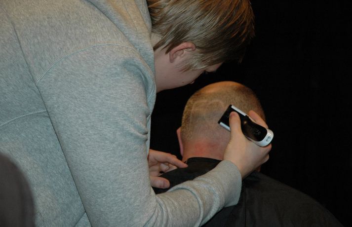 Skólameistari rakar sig fyrir UNICEF BBI skrifar 28. nóvember 2012 18:34 Skólameistarinn fær sér töff klippingu fyrir augum nemenda. Gunnar H. Ársælsson Frumleg fjáröflun fór fram í Fjölbrautaskólanum í Garðabæ í dag. Þar söfnuðu nemendur og starfsfólk fjárframlögum til UNICEF með ýmsum uppátækjum, m.a. með því að lita hárið á sér blátt eða krúnuraka sig. Kristinn Þorsteinsson, skólameistari, lét ekki sitt eftir liggja og rakaði upphafsstafi skólans, FG, í hnakkann á sér gegn minnsta kosti 10 þúsund króna framlagi til UNICEF. Það var nemandi skólans sem varð þess heiðurs aðnjótandi að fá að skrifa í hnakkann á skólastjóranum fyrir augum annarra nemenda. Mest lesið Í deilum við nágrannann vegna trjáa Erlent Tvær þyrlur sækja fjóra eftir alvarlegan árekstur á Fagurhólsmýri Innlent Ekki boðlegt að þingið hunsi þjóðaratkvæðagreiðslu Innlent Segir dulda skattahækkun taka gildi á næsta ári Innlent Þriðji KFC-morðinginn fundinn rúmlega fjörutíu árum síðar Erlent Ferðakostnaður forsetans rúmar tuttugu milljónir Innlent Gróður farinn að grænka fyrir norðan Innlent Mesti snjór í New York í fjögur ár Erlent Sakamálin sem einkenndu árið sem er á enda Innlent „Þetta er ansi flókið, en þó ekki svo flókið“ Erlent Fleiri fréttir Tvær þyrlur sækja fjóra eftir alvarlegan árekstur á Fagurhólsmýri „Rúllandi rafmangsleysi“ alla daga og tífaldur þungi í árásum „Gamla góða Ísland, bara betra“ Gróður farinn að grænka fyrir norðan Ferðakostnaður forsetans rúmar tuttugu milljónir Sakamálin sem einkenndu árið sem er á enda Ekki boðlegt að þingið hunsi þjóðaratkvæðagreiðslu Margfaldur þungi í loftárásum og kyntákn kveður Afbrot, fjölmiðlastyrkir og stefna Miðflokksins Segir dulda skattahækkun taka gildi á næsta ári Líkamsárás í miðbænum Dró konu eftir gangstétt og lyfti henni svo upp með hálstaki Reyndi ítrekað að stofna til slagsmála við skemmtistað Sjálfvirkir lyfjaskammtarar borgi sig tvöfalt til baka Tilhæfulaus líkamsárás í annað sinn og enginn kom til aðstoðar Keyptu aðstoð vegna leiðréttingar landsframlags og hringferðar ráðherra Frumkvæðisvinna lögreglu að loka fjórum afhendingarstöðum „Fara þarf í raunverulegar aðgerðir“ Hrindir af stað söfnun fyrir föður drengsins Kjartan sækist ekki eftir endurráðningu sem bæjarstjóri Landeldi í vexti og lögregla lokar áfengisverslunum Árekstur á Suðurlandsbraut Ekki talinn tengjast aukinni eldvirkni Handteknir grunaðir um framleiðslu fíkniefna Jarðskjálfti við Kleifarvatn Lögreglumenn eltu lausa hesta Lögregla lokaði Smáríkinu og Nýju vínbúðinni Stöðvuðu menn í ofbeldishug við landamærin Piltur skilinn eftir ber að ofan og skólaus eftir hrottafengna árás Dæmdur fyrir líkamsárás í matsalnum Sjá meira