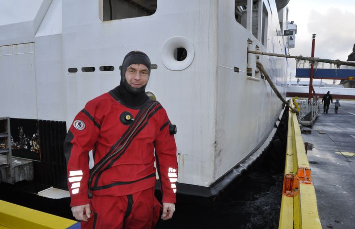 Kafarar skoðuðu Herjólf eftir að hann sigldi utan í varnargarð 24. nóvember 2012 15:30 Kafari nýkominn upp úr sjónum við Vestmannaeyjahöfn. Mynd/Óskar Herjólfur sigldi aðeins á annarri skrúfunni til Vestmannaeyja í dag eftir að hafa rekist utan í varnargrað við Landeyjahöfn í morgun, samkvæmt upplýsingum fréttastofu. Þegar skipið kom til hafnar í Vestmannaeyjum eftir hádegi í dag fór kafari og skoðaði hugsanlegar skemmdir á skrúfunni. Ekki liggur fyrir á þessari stundu hvort að þær hafi verið einhverjar. Gunnlaugur Grettisson, rekstrarstjóri Herjólfs í Vestmannaeyjum, vildi ekki tjá sig um málið þegar fréttastofa náði af honum tali í dag en sagði þó að málið myndi skýrast síðdegis.Vísir/Óskar Mest lesið Í deilum við nágrannann vegna trjáa Erlent Tvær þyrlur sækja fjóra eftir alvarlegan árekstur á Fagurhólsmýri Innlent Trump telur friðarsamkomulag mögulegt innan nokkurra vikna Erlent „Gamla góða Ísland, bara betra“ Innlent Ferðakostnaður forsetans rúmar tuttugu milljónir Innlent Sakamálin sem einkenndu árið sem er á enda Innlent „Þetta er ansi flókið, en þó ekki svo flókið“ Erlent Ekki boðlegt að þingið hunsi þjóðaratkvæðagreiðslu Innlent Tilhæfulaus líkamsárás í annað sinn og enginn kom til aðstoðar Innlent Minnst einn látinn eftir að tvær þyrlur rákust saman í loftinu Erlent Fleiri fréttir Tvær þyrlur sækja fjóra eftir alvarlegan árekstur á Fagurhólsmýri „Rúllandi rafmangsleysi“ alla daga og tífaldur þungi í árásum „Gamla góða Ísland, bara betra“ Gróður farinn að grænka fyrir norðan Ferðakostnaður forsetans rúmar tuttugu milljónir Sakamálin sem einkenndu árið sem er á enda Ekki boðlegt að þingið hunsi þjóðaratkvæðagreiðslu Margfaldur þungi í loftárásum og kyntákn kveður Afbrot, fjölmiðlastyrkir og stefna Miðflokksins Segir dulda skattahækkun taka gildi á næsta ári Líkamsárás í miðbænum Dró konu eftir gangstétt og lyfti henni svo upp með hálstaki Reyndi ítrekað að stofna til slagsmála við skemmtistað Sjálfvirkir lyfjaskammtarar borgi sig tvöfalt til baka Tilhæfulaus líkamsárás í annað sinn og enginn kom til aðstoðar Keyptu aðstoð vegna leiðréttingar landsframlags og hringferðar ráðherra Frumkvæðisvinna lögreglu að loka fjórum afhendingarstöðum „Fara þarf í raunverulegar aðgerðir“ Hrindir af stað söfnun fyrir föður drengsins Kjartan sækist ekki eftir endurráðningu sem bæjarstjóri Landeldi í vexti og lögregla lokar áfengisverslunum Árekstur á Suðurlandsbraut Ekki talinn tengjast aukinni eldvirkni Handteknir grunaðir um framleiðslu fíkniefna Jarðskjálfti við Kleifarvatn Lögreglumenn eltu lausa hesta Lögregla lokaði Smáríkinu og Nýju vínbúðinni Stöðvuðu menn í ofbeldishug við landamærin Piltur skilinn eftir ber að ofan og skólaus eftir hrottafengna árás Dæmdur fyrir líkamsárás í matsalnum Sjá meira