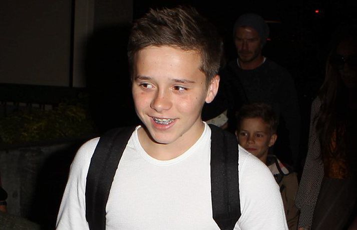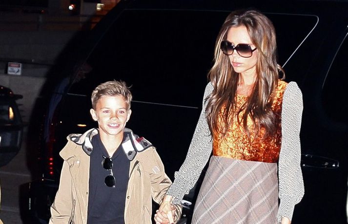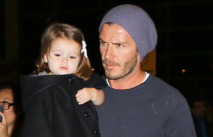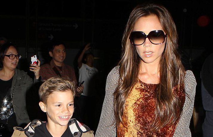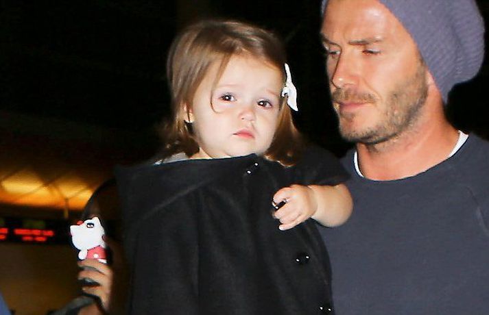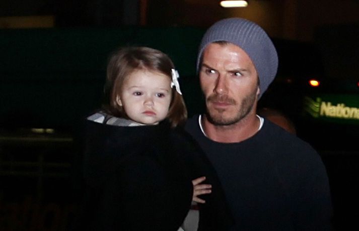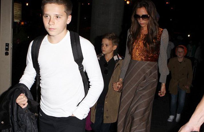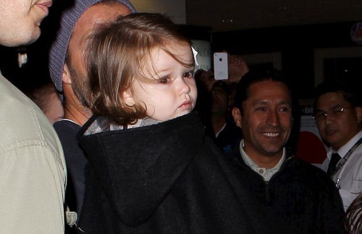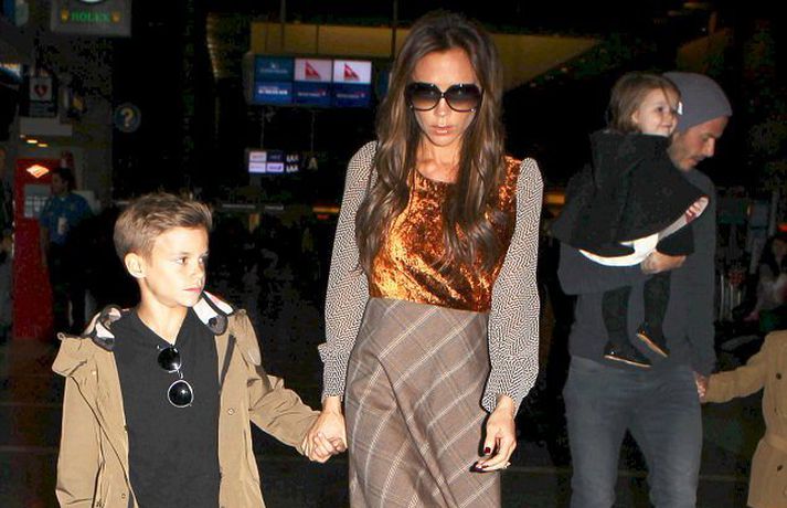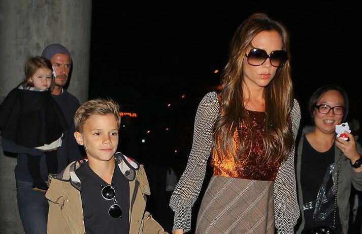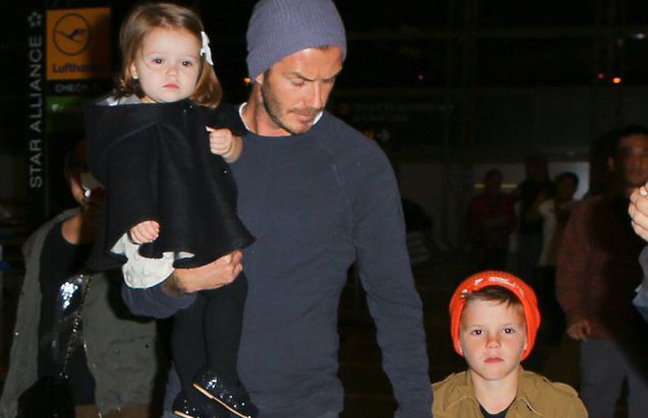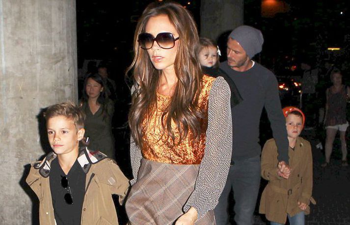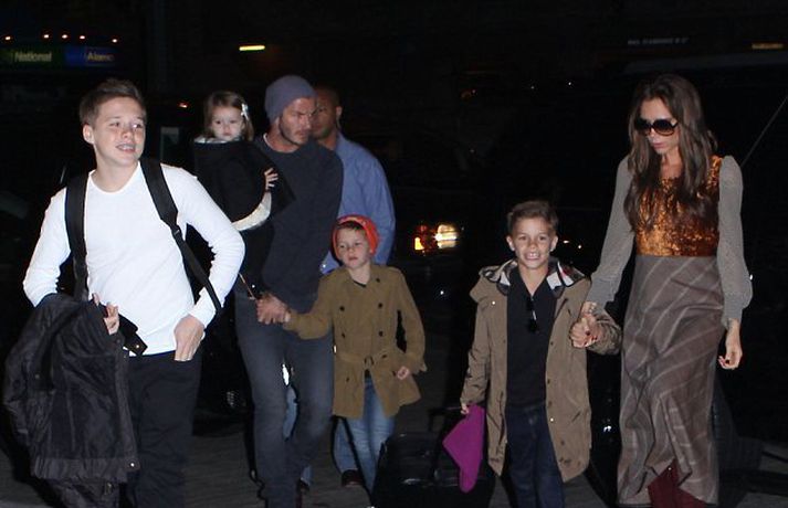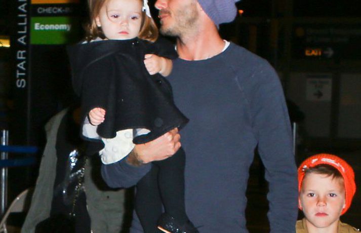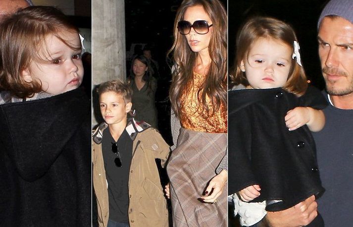 Hjónin David Beckham og Victoria Beckham mættu ásamt börnum sínum, Brooklyn, Romeo, Cruz og Harper á Lax flugvöllinn í Los Angeles í gær. Ferð þeirra var heitið til Lundúna. Eins og sjá má þyrptist fólk að fjölskyldunni sem gekk hröðum skrefum í gegnum flugvöllinn.Þú gætir unnið - vertu með okkur á Facebook.Rome og Victoria.Harper litla er ávallt hrókur alls fagnaðar.