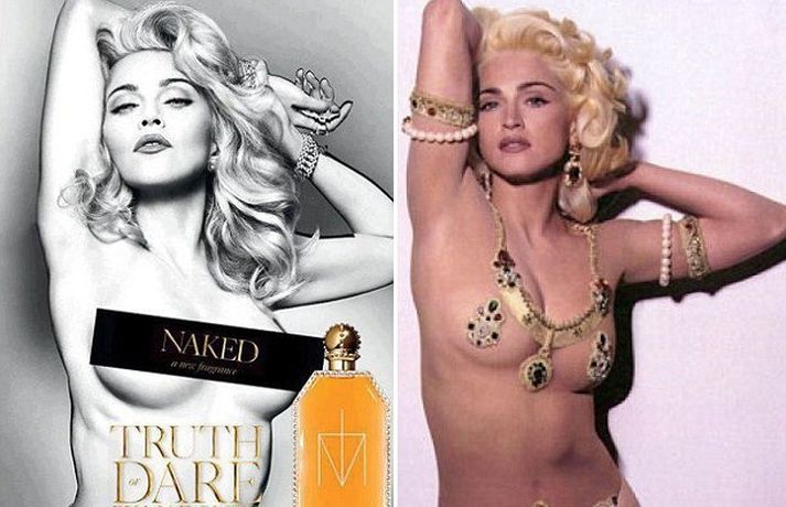 Madonna, sem er 54 ára gömul, hefur endurtekið leikinn eftir tuttugu ár. Eins og sjá má á myndunum er söngkonan í sömu stellingu á báðum myndum hér að ofan. Nema hvað, sú sem er í lit er úr bókinni hennar "Sex" sem kom út fyrir 20 árum og svart hvita myndin er ný auglýsing fyrir ilminn hennar Truth Dare Naked sem hún var að setja á markað. Auglýsingin fyrir Truth Dare Naked ilmvatnið.