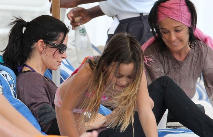Stjörnumæðgurnar Courteney Cox og Coco skelltu sér á ströndina til að sóla sig á Miami um helgina. Þær urðu hins vegar frekar óheppnar því þær lentu í mikilli rigningu og þurftu að yfirgefa ströndina áður en þær náðu að vinna í taninu. Daginn áður sáust þær saman á flugvellinum á Miami og greinilegt að þær eru að eyða gæðastundum saman þessa dagana.