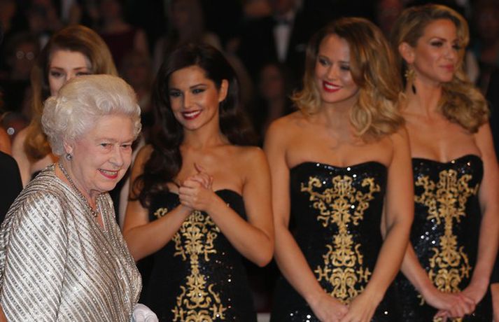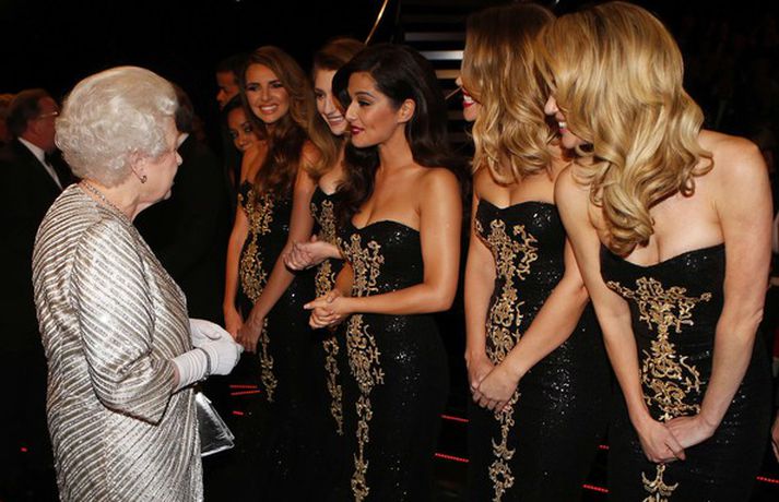 Þær Kimberley Walsh, Nicola Roberts, Sarah Harding, Nadine Coyle og Cheryl Cole sem skipuðu hljómsveitina Girls aloud komu saman á ný í Royal Albert Hall í London í vikunni og tóku þar glæsilegt atriði. Tilefnið var hið árlega Royal Variety Show, en sjálf Elizabeth Bretadrottning mætti til sýningarinnar og heilsaði flestum þeim listamönnum sem þar tróðu upp. Lítið hefur farið fyrir stúlknabandinu lengi og þótti því mörgum ánægjulegt að sjá og heyra í þeim á ný. Smelltu á myndina til að sjá fleiri myndir af stúlkunumCheryl Cole bak við tjöldin.
