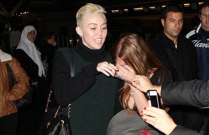 Miley Cyrus, 19 ára, er iðulega umkringd æstum aðdáendum. Eins og sjá má á myndunum brotnaði ung stúlka gjörsamlega niður í sjokki eftir að hún sá goðið sitt. En myndirnar voru teknar af Miley fyrir utan hótelið sem hún gisti á í New York nýliðna helgi. Þá má einnig sjá myndir af henni með móður sinni. Hárið á Miley styttist með hverjum deginum en þessi klipping fer henni áberandi vel. Einn aðdáandi Miley hágrét þegar hún birtist.Stuttklippt og smart.Vinsæl.Í fylgd með múttu. Þær eru ekkert ósvipaðar í útliti.