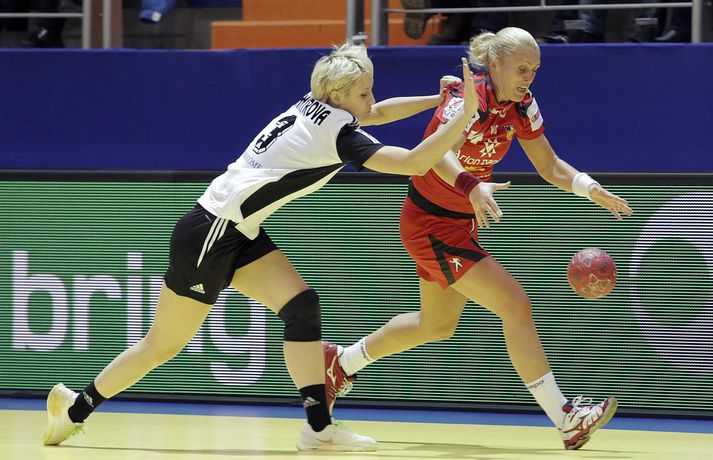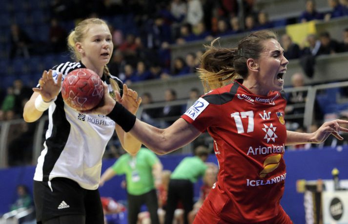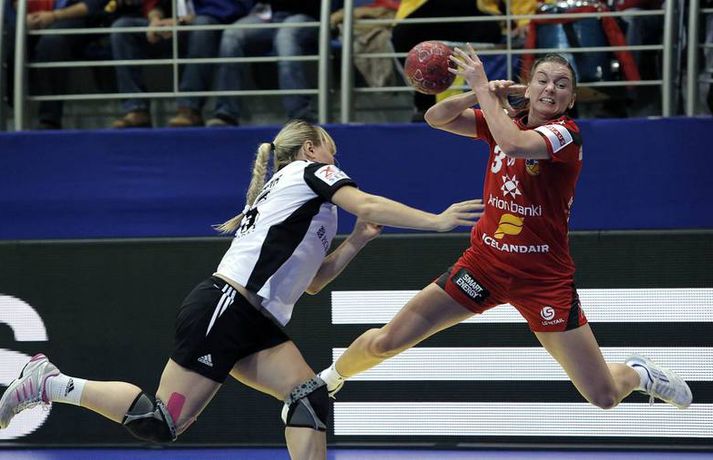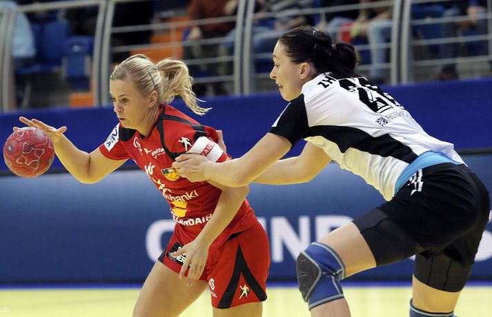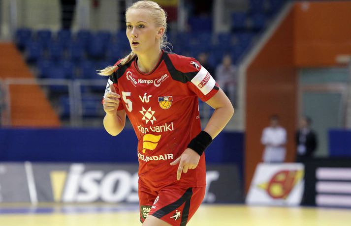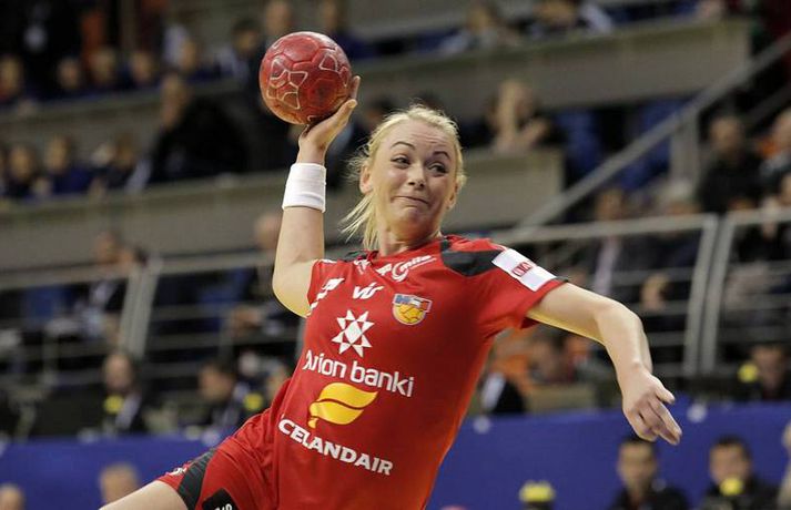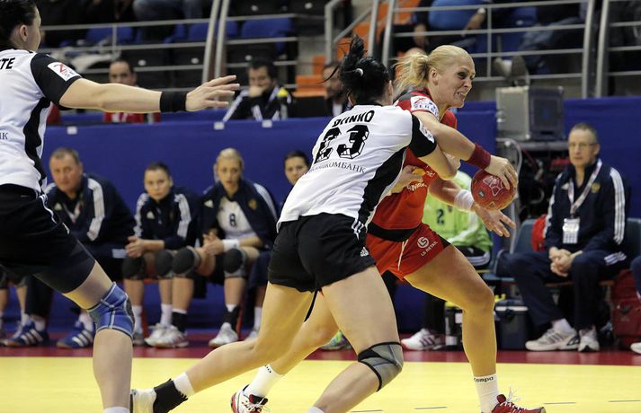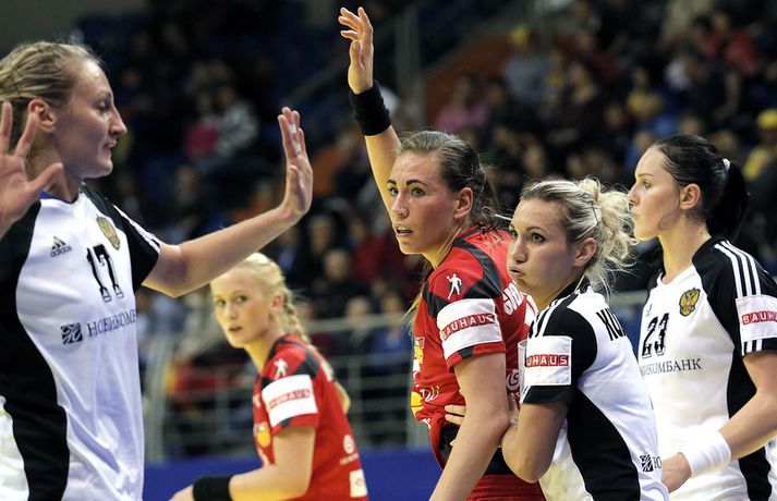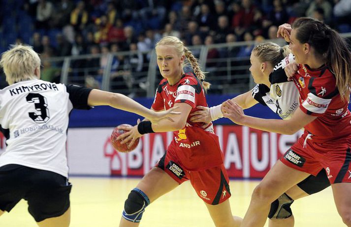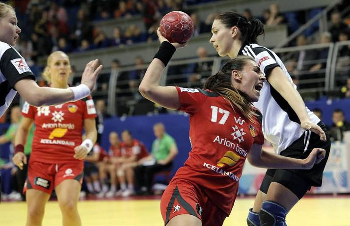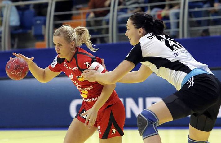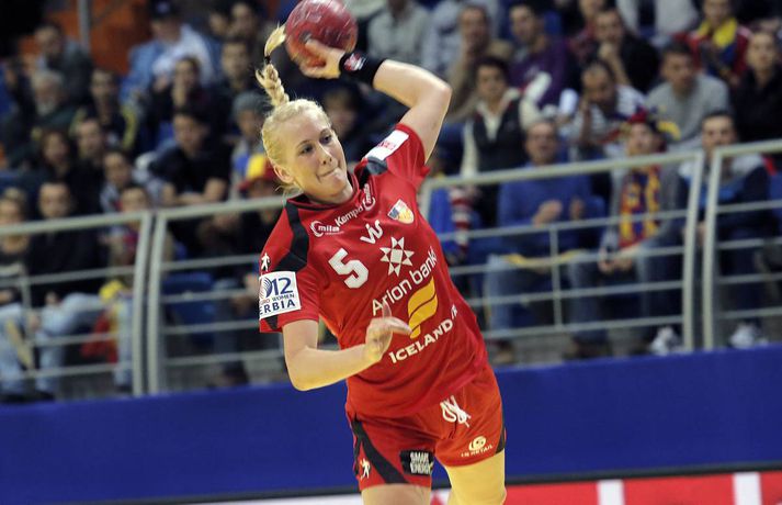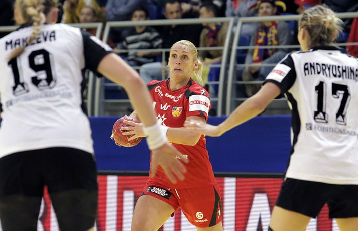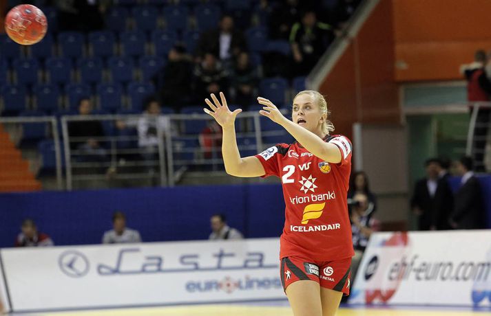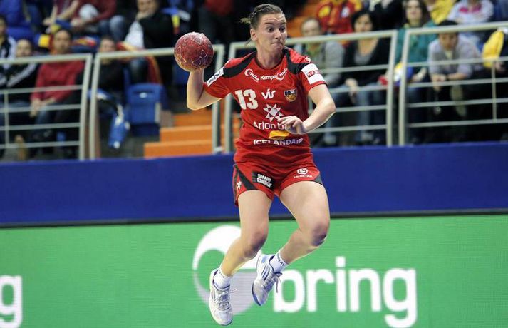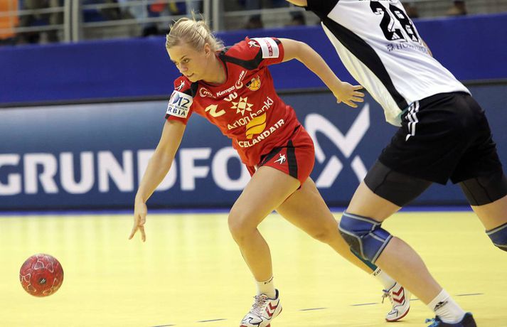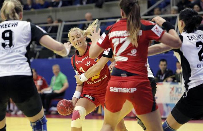 Umfjöllun, viðtöl og myndir: Ísland - Rússland 21-30 | Stelpurnar úr leik Óskar Ófeigur Jónsson í Vrsav skrifar 7. desember 2012 13:19 Karen Knútsdóttir var valin besti leikmaður íslenska liðsins í leiknum. Mynd/Stefán Íslenska kvennalandsliðið í handbolta er úr leik á EM í Serbíu eftir níu marka skell á móti Rússum, 21-30, í þriðja og síðasta leik sínum í D-riðli. Rússar fara því í milliriðilinn í Novi Sad ásamt Svartfellingum og Rúmenum. Slæm byrjun í þessum leik í kvöld fór með alla möguleika stelpnanna á því að ná í söguleg úrslit og komast upp úr riðlinum. Rússland skoraði fjögur fyrstu mörkin, var átta mörkum yfir í hálfleik og gaf síðan ekkert eftir í þeim síðari. Íslenska stelpurnar töpuðu öllum þremur leikjum sínum á mótinu (alveg eins og á EM 2010) og þrátt fyrir góðan varnarleik og fína markvörslu Jennýjar Ásmundsdóttur þá komast íslensku stelpurnar aldrei langt á svona sterku móti með ekki betri sóknarleik en liðið sýndi í Vrsac. Íslenska liðið var næst eðlilegri getu á móti Rúmenum en fékk slæman skell bæði í fyrsta leiknum á móti Svartfjallalandi sem og í kvöld á móti Rússlandi. Rut Jónsdóttir var markahæst hjá íslenska liðinu með fjögur mörk og þær Rakel Dögg Bragadóttir, Hrafnhildur Skúladóttir og Karen Knútsdóttir skoruðu allar þrjú mörk hver. Jenný Ásmundsdóttir varði þrjú víti og þrettán skot í leiknum en það dugði skammt ekki síst vegna þess að íslenska liðið fékk sjaldnast boltann eftir vörslur hennar. Rússar skoruðu fjögur fyrstu mörk leiksins og fyrsta íslenska markið leit ekki dagsins ljós fyrr en eftir rétt tæpar átta mínútur. Íslensku stelpurnar náðu að minnka muninn í tvö mörk, 3-5 en þó komu þrjú rússnesk mörk í röð og tóninn var gefinn. Rússneska liðið hafði lítið fyrir mörkunum sínum á meðan að sóknir íslenska liðsins voru þunglamalegar og bitlitlar. Það var helst að liðið fékk eitthvað í gegnum Önnu Úrsúlu á línunni sem fiskaði fjögur víti í fyrri hálfleiknum. Rússar voru sjö mörkum yfir í hálfleik, 15-8, en munirnn hefði getað verið meiri hefði Jenný Ásmundsdóttir ekki varið tvö víti í hálfleiknum. Vonin kviknaði aldrei í seinni hálfleiknum, þær rússnesku skoruðu fyrsta mark hans og voru komnar tíu mörkum yfir, 12-22, eftir tíu mínútur. Síðustu tuttugu mínúturnar voru spilaðar fyrir stoltið en íslensku stelpurnar komust aldrei nær en að minnka muninn í átta mörk. Ágúst: Okkar lykilleikmenn eiga tíu ár eftir í fremstu röðÁgúst Jóhannsson, þjálfari íslenska liðsins, var að vonum svekktur eftir tapið á móti Rússum í kvöld en íslensku stelpurnar misstu þær rússnesku frá sér í byrjun og voru aldrei almennilega inn í leiknum. „Við byrjuðum illa og þá má eiginlega segja það að byrjunin hafi orðið okkur að falli. Við vorum strax komnar vel undir. Stelpurnar voru óheppnar því þær sköpuðu sér færi í upphafi en skutu framhjá og fengu dæmda á sig línu þegar þær skoruðu. Þetta var eins slæmt og þetta gat orðið í upphafi leiks og það er erfitt að lenda strax nokkrum mörkum undir á móti Rússum," sagði Ágúst. „Við erum að gera tæknimistök varnarlega í fyrri hálfleiknum fimm eða sex sinnum þar sem við erum að fá þær upp á sjö til átta metrum inn á miðjusvæðinu. Það er mjög erfitt að eiga við. Það var eitthvað sem við vorum búin að fara vel yfir og ætluðum að stoppa en því miður gekk þetta ekki núna," sagði Ágúst. „Varnarleikurinn lagaðist í seinni hálfleik og ég var pínu ósáttur með að við náðum ekki að minnka þetta enn meira niður. Ég hef sagt það áður að Rússar spiluðu frábærlega á móti Rúmenum og voru algjörir klaufar að vinna ekki þann leik þar sem markvörðurinn varði 19 skot þar af tólf þeirra af sex metrum," sagði Ágúst. „Markmiðin voru að fara áfram og það hefði verið metnaðarleysi og fáránlegt af okkur að fara inn í þessa riðlakeppni og hafa ekki markmiðið að komast áfram. Þá hefði maður alveg eins getað hætt þessu. Auðvitað vissum við að það væri mjög erfitt að ná markmiðinu," sagði Ágúst. „Maður er svekktur að sjálfsögðu en ég mest svekktur yfir því að við skulum ekki hafa náð jafnari leikjum. Ég vissi það alltaf að þetta markmið yrði mjög erfitt og þessi lið eru bara gríðarlega sterk. Í ofanálag erum við með ungt og efnilegt framtíðarlið og það er orðið mikil reynsla fyrir þær að fara á þrjú stórmót í röð. Lykilleikmenn og stærstu póstarnir í liðinu eru á mjög góðum aldri," sagði Ágúst. „Það er leiðinlegt að segja þetta og vera í þessum pakka en maður verður að horfa á þetta þannig. Okkar lykilleikmenn eru í kringum 22 til 23 ára og eiga því tíu ár eftir í fremstu röð," sagði Ágúst. „Það voru of margar sem náðu sér ekki á strik í mótinu og við náðum eiginlega ekki alveg nógu miklum takti frá fyrsta degi þó svo að leikur tvö á móti Rúmenum hafi verið mjög góður. Við vorum klaufar að hafa ekki unnið hann og svo leikur hefði hugsanlega batra dugað. Þetta er fúlt en við þurfum að taka þetta í reynsluboltann og horfa fram á veginn," sagði Ágúst. „Það eru fullt af verkefnum framundan og liðið er á flottum aldri. Leikmenn eins og Þorgerður og Birna eru líka fyrir utan liðið sem eru miklir framtíðarleikmenn og handan við hornið. Það er bara stefanan að halda áfram. Við fáum tvo leiki við Svía í mars og svo er það bara umspilsleikir í maí og júní. Við höldum tvíefld áfram," sagði Ágúst. Hrafnhildur: Erum með brotið sjálfstraust„Þetta eru gríðarleg vonbrigði og hrikalega svekkjandi. Við áttum ekkert meira skilið út úr þessum le