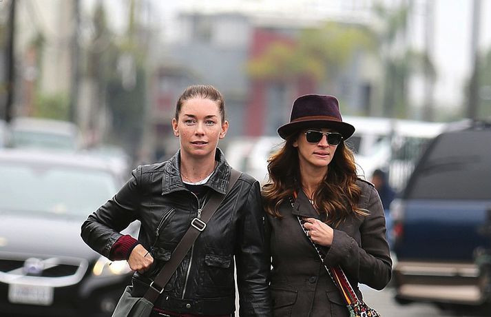 Leikkonan Julia Roberts fékk sér hádegismat á Hal's Bar and Grill í Kaliforníu í vikunni og leiddi leikkonuna Julianne Nicholson en þær leika saman í myndinni August: Osage County sem er væntanleg á næsta ári. Leikararnir Ewan McGregor og Dermot Mulroney, sem fara líka með hlutverk í kvikmyndinni, fengu sér líka bita með þeim stöllum.Smart með hatt.Julia leit stórkostlega út á götum Kaliforníu en hún er orðin 45 ára gömul. Alltaf jafn flott!Frægasta bros í Hollywood.Þú gætir unnið - vertu með okkur á Facebook.
