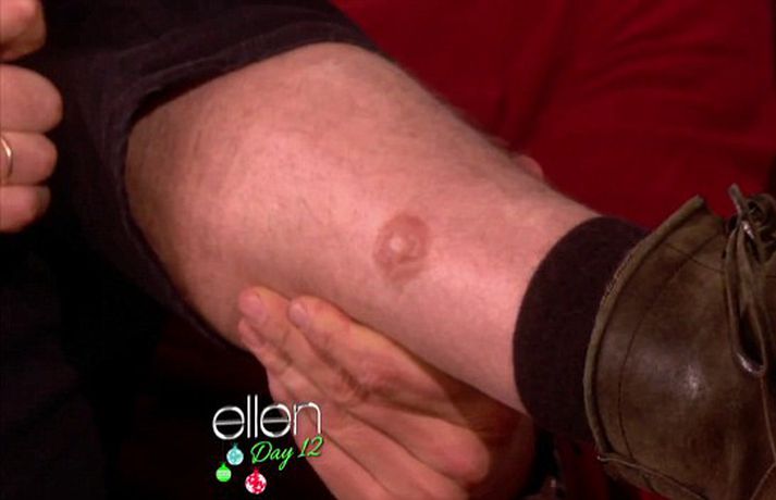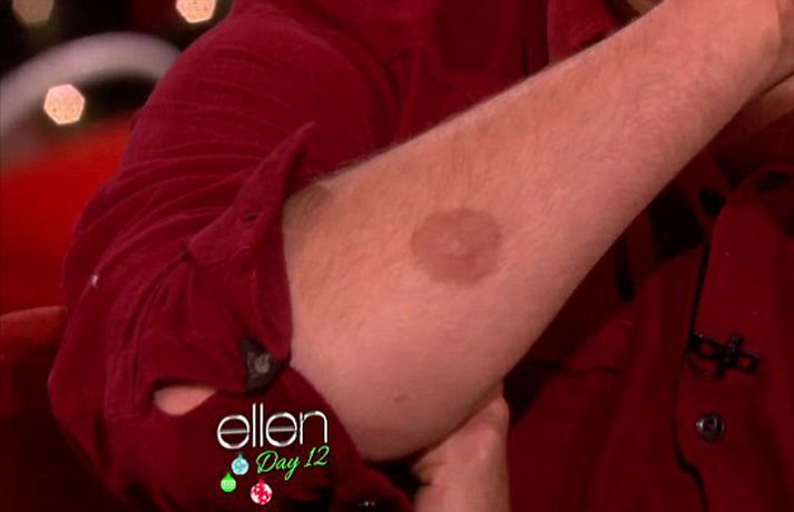 Hjartaknúsarinn Bradley Cooper kom gestum í þætti Ellen DeGeneres hressilega á óvart þegar hann sýndi geirvörturnar fimm sem hann er með á líkamanum. Hann varaði áhorfendur við að hann ætti ógeðslegt leyndarmál og sýndi aukageirvörturnar – eina á brjóstkassanum, eina á handleggnum og eina á fótleggnum.Gott smink.Geirvörturnar eru flennistórar en sem betur fer eru þær ekki ekta. Bradley er bara með tvær geirvörtur eins og flestir og var aðeins að grínast. Gott spaug!Tjillaður.Þú gætir unnið - vertu með okkur á Facebook.