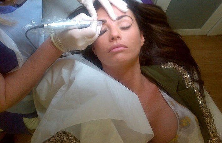 Breska glamúrmódelið Katie Price, 34 ára, er ekki feimin þegar kemur að fegrunaraðgerðum. Hún heimsótti snyrtistofu í vikunni þar sem hún lét húðflúra augabrúnirnar svartar og sett myndir af fegrunaraðgerðinni beint á Twitter síðuna sína síðar sama dag. Eins og sjá má á myndunum var setið um hana fyrir utan snyrtistofuna eins og sjá má.