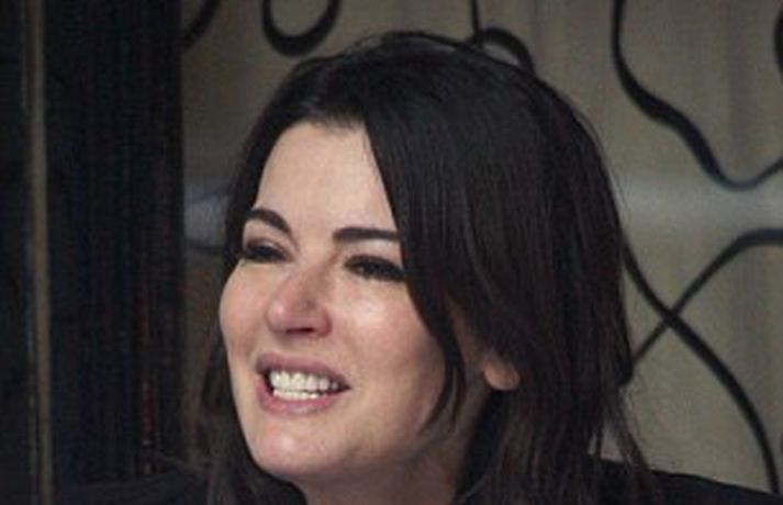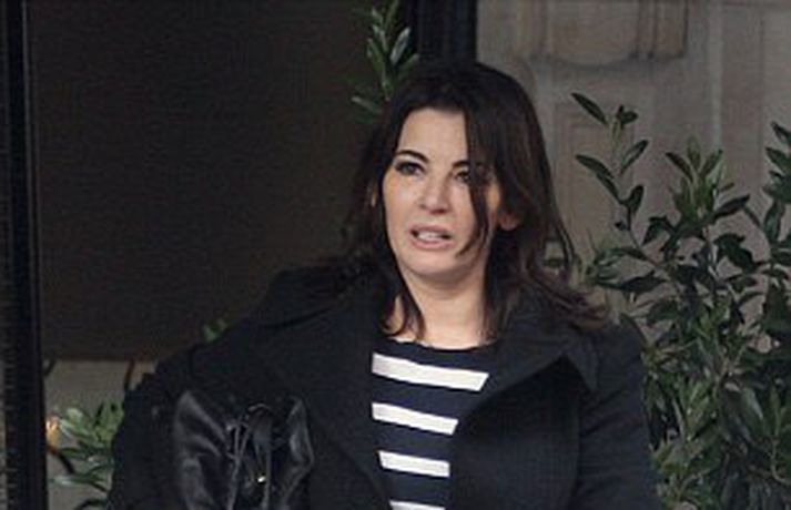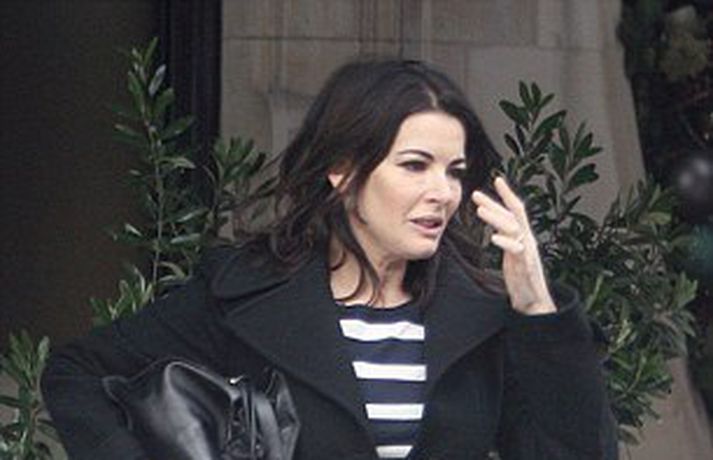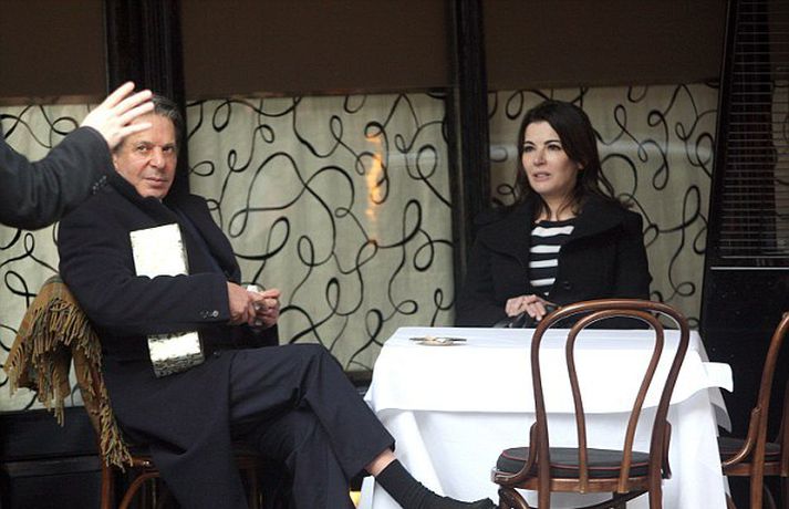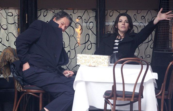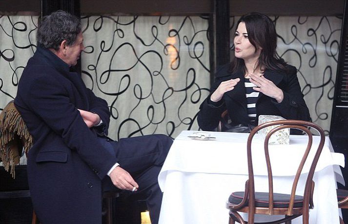 Það var sko dekrað við sjónvarpskokkinn og matgæðinginn Nigellu Lawson, 52 ára, í gær, sunnudag. Það var eiginmaður hennar , Charles Saatchi, sem bauð henni á uppáhaldsveitingastaðinn hennar á Mayfair svæðinu í Lundúnum. NIgella var klædd í svart hvítan topp og svarta kápu með slegið hárið - stórglæsileg eins og ávallt. Á meðan Nigella dundaði sér í iPhone-símanum sínum reykti Charles eins og sjá má á myndunum.