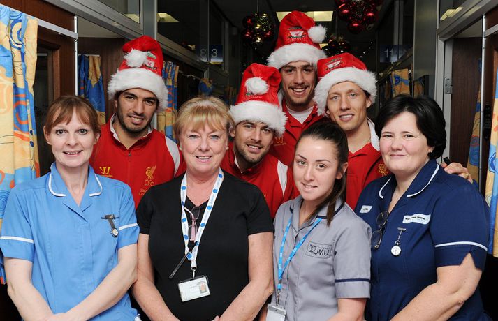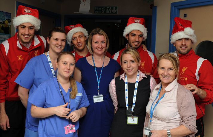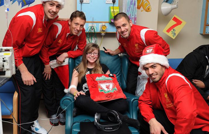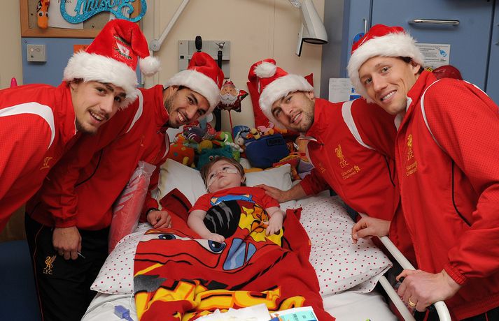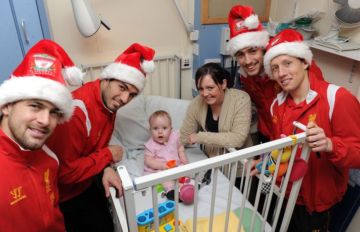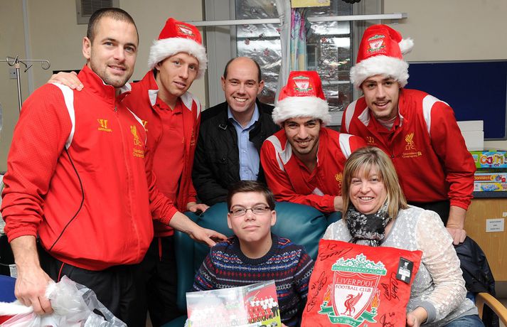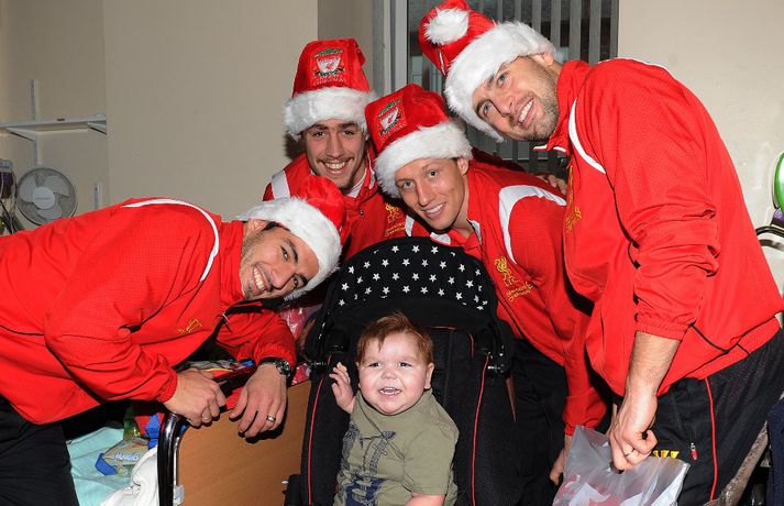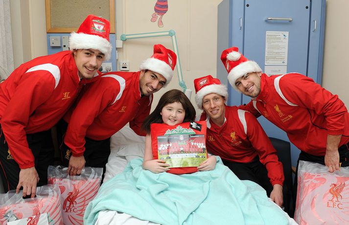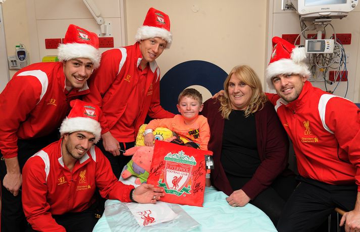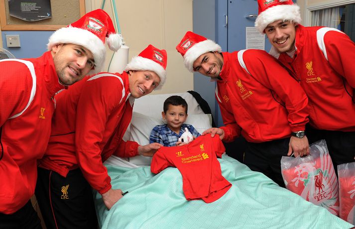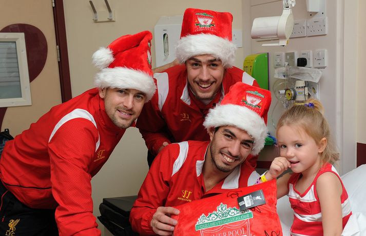 Knattspyrnumenn gefa af sér um jólin og leikmenn Liverpool eru þar engin undantekning. Leikmenn liðsins virtust þó hafa hrætt lítinn, veikan strák á spítala í Liverpool. Aðalmynd fréttirnar segir meira en þúsund orð. Drengurinn, sem er stuðningsmaður Everton, horfir á Luis Suarez, sem skartar jólasveinahúfu, skelfingu lostinn. Suarez og félagar glöddu öll börnin á spítalanum í Liverpool og breytti engu hvaða lið þeir styðja. Þau voru ekki öll hrædd við jólasveininn Suarez sem dró hvergi af sér við að kæta krakkana. Skoða má fleiri myndir af spítalaheimsókn leikmanna Liverpool hér að ofan.