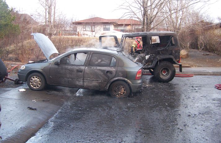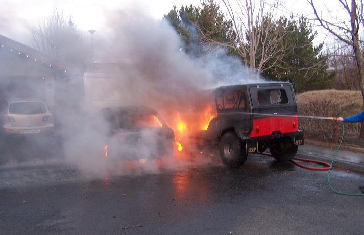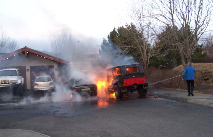 Kviknaði í tveimur bílum við íbúðarhús BBI skrifar 26. desember 2012 14:21 Bílarnir eru gerónýtir. Mynd/Yngvinn G Eldur kom upp í tveimur bílum við Gerðhamra 26 í Grafarvogi um eitt leytið í dag. Bílarnir voru báðir utandyra og tókst að ráða niðurlögum eldsins áður en hann barst í nærlæg íbúðarhús. Bílarnir eru þó báðir ónýtir eftir eldsvoðann. Annar þeirra er gamall Willys og hinn nýlegur fólksbíll. Slökkviliðinu á höfuðborgarsvæðinu bárust fjölmargar tilkynningar vegna eldsvoðans og sendi allt tiltækt lið á svæðið. Þegar þangað var komið reyndist bruninn ekki jafnalvarlegur og óttast var í fyrstu. Íbúar á svæðinu höfðu hafið slökkvistörf með mjög takmörkuðum árangri áður en slökkviliðið kom á svæðið. Þegar slökkviliðið mætti gekk hins vegar greiðlega að slökkva eldinn. Ekki er vitað hvað olli eldsvoðanum en sem stendur lítur út fyrir að ekki hafi verið um íkveikju að ræða. Mest lesið Töpuðu tæpum hundrað milljónum Innlent Milljónir í sekt fyrir að bakka á konu Innlent Þau kvöddu á árinu 2025 Erlent Hitinn fór í 19,8 stig og desembermetið slegið Veður Seinfeld og Friends-leikari látinn Lífið Klæðning fauk af Stjórnsýsluhúsinu og skemmdi bíla Innlent Yfir hundrað handteknir grunaðir um að skipuleggja árásir á gamlársdag Erlent Fundu yfir milljón skjöl sem tengjast Epstein Erlent Hvar er opið á aðfangadag? Innlent Gefur lítið fyrir staðhæfingar um nýfallið hitamet Veður Fleiri fréttir Töpuðu tæpum hundrað milljónum Milljónir í sekt fyrir að bakka á konu Þörf á að skerpa á verklagi spítalans í heimilisofbeldismálum Engin jólamessa vegna rafmagnsleysis Klæðning fauk af Stjórnsýsluhúsinu og skemmdi bíla Gleðileg jól, kæru lesendur Einn fluttur á sjúkrahús eftir bílslys Skiluðu hagnaði á kosningaári Hátíðarveisla á kaffistofu Samhjálpar: „Það er ró og friður yfir fólki“ Björgunarsveitin kölluð út í fokverkefni Grjóthrun undir Eyjafjöllum Fátækari eftir að hafa svindlað á ferðakonum Arion banki varar við svikaherferð Innanlandsflugi aflýst Foreldrar skipverjans fá áheyrn í Hæstarétti Hvar er opið á aðfangadag? Innflytjendamálin almenningi efst í huga Bæta við allt að 200 íbúðum og mathöll í Spöngina Maður í umferðarslysi reyndist fíkniefnasali Minni rekstrarkostnaður fyrir eigendur bensínháka Hafnar „jólakveðju“ ríkisins Hefði þurft hjólbörur undir öll verðlaunin sín Ýmis ráð til taugatrekktra á Þorláksmessu Ekkert því til fyrirstöðu að Ásthildur Lóa verði aftur ráðherra Óvissa um ráðherraskipan og skata fyrir byrjendur Maðurinn fundinn Sigríður Halldórsdóttir nýr ritstjóri Kastljóss Íslendingur í gæsluvarðhaldi í Kólumbíu vegna gruns um kynferðisbrot Forsætisráðuneytið eyddi meiru í almannatengla í fyrra en í ár Inkalla snuð vegna of mikils magns BPA-plastefna Sjá meira