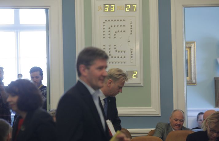 Bjarni Ben: Þetta er ekki áfall fyrir mig 1. mars 2012 12:10 Bjarni Benediktsson stuttu eftir að niðurstöðu úr atkvæðagreiðslunni lágu fyrir á Alþingi í dag. mynd/valli „Ég gerði mér fyrir því að það hafi verið mikil átök bakvið tjöldin. Flokksfélög hafa verið að álykta um þessi mál og þingmenn hafa verið settir undir mikinn þrýsting," segir Bjarni Benediktsson, formaður Sjálfstæðisflokksins og flutningsmaður tillögu um að afturkalla ákæru á hendur Geir H. Haarde. Frávísunartillaga var samþykkt á morgun með 33 atkvæðum gegn 27. Landsdómsmálið heldur því áfram en aðalmeðferð í því hefst á mánudaginn. Bjarni segir að margir þeir sem greiddu atkvæði í dag hafi verið með líf ríkisstjórnarinnar í huga. „Þetta er ekki áfall fyrir mig, lang langt í frá. Þetta er áfall yfir meðferð ákæruvaldsins í landinu og virðingu fyrir grundvallar mannréttindum," segir Bjarni í samtali við fréttastofu. Mest lesið Ástæða fyrir því að genaumræðan hafi ekki náð mikilli útbreiðslu Innlent Veðurvaktin: Biðja fólk að halda sig heima í kvöld Veður Karlmaður lést í Bláa lóninu Innlent Hlýni á föstudag og snjórinn geti horfið í næstu viku Veður Færeyingar marka leið fyrir risastór neðansjávargöng Erlent Ráðgjafinn ráðinn tveimur dögum eftir að grennslast var fyrir um málið Innlent Stærsti fellibylur í sögu Jamaíka Erlent „Alvöru“ jólasveinn gisti á Hótel Rangá Innlent Ungur Miðflokksmaður gengst við rasisma og segir af sér Innlent Biðu í fjóra tíma úti á braut og aðra fjóra við farangursbeltin Innlent Fleiri fréttir Ástæða fyrir því að genaumræðan hafi ekki náð mikilli útbreiðslu Ráðgjafinn ráðinn tveimur dögum eftir að grennslast var fyrir um málið „Alvöru“ jólasveinn gisti á Hótel Rangá Vesturbæjarlaug opnuð enn eina ferðina eftir viðgerðir Verklagi ábótavant og krefur ríkislögreglustjóra skýringa Mæla með því að farþegar reiði sig ekki á tímaáætlanir Snjókoman mikla, ábótavant verklag ríkislögreglustjóra og jólasveinamót Karlmaður lést í Bláa lóninu Biðu í fjóra tíma úti á braut og aðra fjóra við farangursbeltin Kærðu umdeildar framkvæmdir allt of seint Skellt í lás í sundlaugum borgarinnar vegna veðurs Reglur brotnar og þjónusta sem bjóða ætti út Þarf að borga bætur þrátt fyrir breytingar á hlaupahjólinu Hvatt til varúðar vegna snjóflóðahættu á suðvesturhorninu Meiri kvika en í síðasta gosi Eldur í blokk við Ljósheima Flugmaðurinn sem fórst millilenti oft í Reykjavík Halla leiðir krabbameinsráð ráðherra Snjókomumet og umferðaröngþveiti Segir sameiginlegum gildum Norðurlanda ógnað Fjölmargir farþegar fastir í flugvélum á Keflavíkurflugvelli Ungur Miðflokksmaður gengst við rasisma og segir af sér Sturlað ástand og United vettlingar prjónaðir í bílnum Mesta snjódýpt í Reykjavík sem mælst hefur í október Viðbragðsaðilar í mikilli hættu vegna bíla á sumardekkjum Bílar út af veginum á Reykjanesbraut Vill heimila Samkeppniseftirlitinu að ráðast í húsleitir Snjókoman rétt að byrja Píratar berjist gegn „rísandi bylgju lýðskrums og fasisma“ Skvísur geti virkað sem hálfgerðir þroskaþjófar Sjá meira