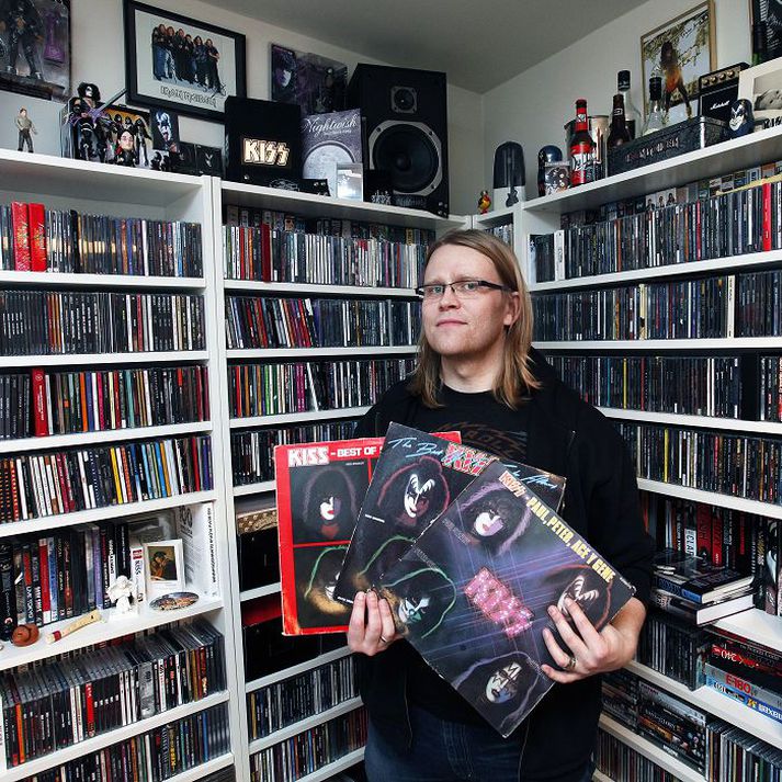 Þráinn Árni Baldvinsson, gítarleikari Skálmaldar, er með sérstakt rokkherbergi heima hjá sér. Þar fær árátta hans tengd hljómsveitinni Kiss að njóta sín. Heimili Þráinn Árni Baldvinsson, gítarleikari Skálmaldar, nýtur þeirra forréttinda að vera með rokkherbergi heima hjá sér. Í því eru geisladiskar, vínylplötur og alls kyns munir tengdir uppáhaldshljómsveitum hans Kiss, Iron Maiden og Metallica en aðallega þó Kiss. „Við flytjum inn í þessa íbúð 2007. Ég var með svo mikið dót sem var búið að fylgja mér í gegnum tíðina að konan vissi alveg að hverju hún var að ganga þegar við byrjuðum að hittast nokkrum árum áður,“ segir Þráinn. „Þannig að það var allan tímann á hreinu að þetta yrði herbergi fyrir þetta drasl. Svo er konan líka mikill tónlistaráhugamaður, þótt hún sé í allt öðrum geira. Hún kemur hérna inn og setur Sinéad O"Connor á fóninn, þannig að þetta er samvinnuverkefni.“ Þegar Þráinn er ekki að hlusta á tónlist í herberginu æfir hann sig á gítarinn. Spurður út í andrúmsloftið í rokkrýminu segir hann það mjög gott. „Ég er búinn að spyrja nágranna mína hvort þetta trufli þá eitthvað og einn sagði að ég ætti nú bara að hækka heldur en hitt, þannig að þetta er alveg dásamlegt.“ Hann hefur alla tíð verið mikill aðdáandi Kiss og hefur safnað ýmsum munum tengdum sveitinni í gegnum árin, þar á meðal árituðum plötum, Paul Stanley-hasarfígúrum og árituðum myndum. Hann er meira að segja með Kiss-nestisbox uppi á hillu sem að sjálfsögðu verður aldrei notað. „Ég var heilaþveginn af Kiss þegar ég var lítill og man ekki eftir mér öðruvísi. Frændi minn var mikill Kiss-aðdáandi og eftirlét mér allt sitt plakatasafn á sínum tíma,“ segir hinn 35 ára Þráinn, sem sá goðin sín fyrst á tónleikum þegar hann var tólf ára. „Söfnunaráráttan er fyrst og fremst vínyl-„geðveiki“ og þar læt ég ekkert stoppa mig þegar kemur að Kiss.“ Sem dæmi á hann plötuna Lick It Up í mörgum mismunandi útgáfum, þar á meðal innsiglaðri, mexíkóskri og japanskri. Síðustu Kiss-plötu, Sonic Boom, keypti hann í tveimur vínylútgáfum, á geisladiski, á geisla- og mynddiski og í japanskri útgáfu. Hann kaupir einnig allar sólóplötur meðlima Kiss, þar á meðal trommuleikarans Peters Kriss. „Þær eru allar alveg hræðilegar, hundleiðinlegt djassað rugl en ég kaupi þær samt.“ Samanlagt eru Kiss-titlarnir í herberginu orðnir hátt í eitt þúsund talsins. Þrátt fyrir aðdáun hans á Kiss segist hann ekki viss um hvort hægt sé að falla fyrir hljómsveitinni á fullorðinsárum. „Þetta er svo mikill partur af því að alast upp. Allar plöturnar eru eins og tímavélar fyrir mann,“ segir hann og telur þetta ekki verra áhugamál til dæmis golf. Hann á einmitt erfitt með að skilja hvers vegna menn ákveða á einhverjum tímapunkti að hætta að hlusta á uppáhaldstónlistina sína. „Mér finnst það léleg afsökun að einhver haldi að hann þurfi að fullorðnast. Það er bara rugl. Menn eiga að vera heilir í sínu og hafa gaman að þessu. En ég er fyrstur til að viðurkenna að þetta er bara klikkun.“freyr@frettabladid.is