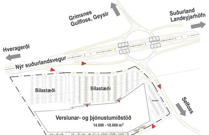 Sveitarfélagið Árborg hefur veitt vilyrði fyrir sex hektara lóð undir nýja verslunar- og þjónustumiðstöð fyrir ferðamenn á Suðurlandi. Miðstöðin kallast Miðja Suðurlands og á að rísa við fyrirhuguð gatnamót Suðurlandsvegar og Biskupstungnabrautar þegar hringvegurinn verður fluttur norðaustur fyrir Selfoss. Fullbyggð á verslunar- og þjónustumiðstöðin að vera 14 til 18 þúsund fermetrar. Í fyrsta hluta byggingarinnar er gert ráð fyrir að reisa fjölorkustöð sem býður jafnt upp á hefðbundið eldsneyti sem og þjónustu við farartæki knúin nýjum orkugjöfum á borð við metan og rafmagn. Þá á sérstaklega að huga að þjónustu við húsbíla og fellihýsi. Að byggingu Miðju Suðurlands stendur fyrirtækið Gatnamót ehf. Í forathugunum þess kemur fram að alls fari daglega 9.000 bílar um þennan kafla Suðurlandsvegar. Þá telji íbúafjöldi svæðisins 50.000 manns ef talin er með sumarhúsabyggð á sumrin. Að sögn Árna Blöndals, eins forsvarsmanna Gatnamóta, er gert ráð fyrir að framkvæmdir hefjist við fyrsta tækifæri. „Við gerðum samstarfssamning við Sveitarfélagið Árborg í janúar og fengum þá vilyrði fyrir þeirri lóð sem við hyggjumst nýta undir starfsemina," segir hann og kveður bæði minnihluta og meirihluta í stjórn sveitarfélagins áfram um að sjá verkefnið verða að veruleika. Árni segir að búa eigi til „hlýlegt og notalegt umhverfi", en staðsetja eigi stórverslanir í báðum endum byggingarinnar. Öðrum megin er gert ráð fyrir lágvöruverðsverslun og hinum megin byggingavöruverslun. Í samgönguáætlun 2011-2022 er gert ráð fyrir nýjum vegi norðaustan Selfoss með nýrri brú á Ölfusá á árunum 2019 til 2022. Á árunum 2015 til 2018 stendur hins vegar til að tvöfalda og endurnýja veginn milli Hveragerðis og Selfoss. Samkvæmt áætluninni gætu nýlegar upplýsingar um takmarkað burðarþol Ölfusárbrúar við Selfoss þó orðið til að breyta forgangsröðun. „Því er settur sá fyrirvari að unnt verði að víxla framkvæmdum á Suðurlandsvegi í áætlun þessari," segir þar. Árni kveðst hins vegar vongóður um að hægt verði að hefja framvæmdir við Miðju Suðurlands innan fárra ára, en það ráðist svolítið af ákvörðunum á sviði stjórnmálanna. olikr@frettabladid.is