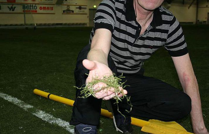 Gervigras sem kostaði tugmilljónir er gallað 17. apríl 2012 07:00 Gervigrasið í Reykjaneshöll bókstaflega spænist upp þegar það er þrifið og er á öruggri leið með að hverfa þaðan af gólfinu. Myndir/VSÓ Skipta þarf út nýlegu gervigrasi í íþróttahöllunum í Reykjanesbæ og Grindavík. Grasið losnar af gólfmottunum. Framleiðandinn viðurkennir galla og verið er að semja um ný gólf. Þau kostuðu yfir 40 milljónir er þau voru keypt fyrir hrun. „Ef þetta heldur svona áfram endar það náttúrlega með því að það verður lítið eftir af grasi,“ segir Stefán Bjarkason, framkvæmdastjóri íþrótta- og tómstundasviðs Reykjanesbæjar. Gervigrasið í Reykjaneshöll er á síðasta snúningi þrátt fyrir að vera aðeins fjögurra ára gamalt. Gervigrasið í Reykjaneshöll var endurnýjað fyrir rúmum fjórum árum af þýsku fyrirtæki. Á sama tíma var sams konar gervigras sett í nýju fjölnotahöllina Hópið í Grindavík. Fljótlega kom í ljós að gólfin í báðum húsum eru gölluð, bæði krumpuð og reytt. „Það er eins og grasið verði of þurrt og það brotnar,“ segir Róbert Ragnarsson, bæjarstjóri í Grindavík. „Framleiðandinn hefur viðurkennt að þetta sé galli og ætlar að skipta gólfinu út en vill fá greitt fyrir afnotin í þau þrjú ár sem við höfum notað gólfið. Við höfum sagt að það sé mál á milli framleiðandans og kaupandans á gólfinu – sem er ekki við heldur verktakinn sem við keyptum húsið af.“ Reykjanesbær keypti sitt gólf beint af þýska framleiðandanum og greiddi fyrir það 22 milljónir króna. Gólfið í Grindavík mun hafa kostað um 20 milljónir. Báðar þessar upphæðir eru frá því fyrir hrun þannig að tjónið er jafnvel tvöfalt hærra í krónum talið og því samtals yfir 80 milljónir króna. „Þetta er algjört mánudagsgras,“ segir Stefán Bjarkason. „Festingarnar undir mottunni eru límdar og saumaðar og það er eins og límið hafi ekki verið nógu gott þannig að það fór fljótlega að bera á því að grasið raknaði bara upp og losnaði. Þannig að þegar við erum að þrífa koma heilu pokarnir upp af grasstráum. Þeir hafa komið og lagað þetta okkur að kostnaðarlausu en við erum ekki sátt við að það sé alltaf verið að stoppa upp í götin.“ Þýski framleiðandinn viðurkennir galla í báðum gólfunum. Á þeim er fimm ára ábyrgð. Til stendur að skipta þeim báðum út í sumar þegar aðilar hafa náð samkomulagi. Stefán segir að líklega muni Reykjanesbær bera eitthvert tjón. „Þá er bara að taka því, það verður að skipta um gras,“ segir Stefán sem undirstrikar þó eins og Róbert í Grindavík að engin hætta hafi skapast vegna ástands grassins og það hafi ekki takmarkað notkun hallanna. Í Reykjaneshöllinni er gólfið fjögur þúsund fermetrar. Þjóðverjarnir sjá ekki fyrir sér að taka ónýta grasið með sér heim. „Þeir vilja náttúrlega losna við förgunina og eru búnir að bjóða okkur grasið til notkunar úti en ég veit ekki hvort það mundi endast þar,“ segir Stefán Bjarkason.gar@frettabladid.is Mest lesið WhatsApp-skilaboð Auðuns til konunnar ekki metin gild Innlent Lak trúnaðargögnum um Icesave til viðskiptamógúls Erlent „Hrækjandi drullu eins og maður sé að steypa án grímu“ Innlent Rýnt í stöðuna í Úkraínu: Gífurlegt mannfall en litlar breytingar á víglínunni Erlent Kjartan er kominn heim til Íslands Innlent Eitrað fyrir Navalní með froskaeitri Erlent Safnstjórinn segir þessa flugvél merkasta gripinn Innlent Landfylling í Skerjafirði: Óttast að borgin vaði af stað Innlent Fjölmargir Íslendingar á ADHD-lyfjum sviptir bílprófi Innlent Ánægja með bæjarstjórann en Sjálfstæðismenn með mest fylgi Innlent Fleiri fréttir Rósin segir sig úr fulltrúaráði Samfylkingarinnar Ný samræmd próf lögð fyrir Framsókn þurfi að þora að svara rangfærslum og hálfsannleik popúlista „Hrækjandi drullu eins og maður sé að steypa án grímu“ Kjartan er kominn heim til Íslands Aldrei fleiri útskrifast frá Bifröst Gagnrýnir hversu seint og illa endurreisn Grindavíkur gengur Íslendingar stemmningsfólk sem taki öllum gleðidögum fagnandi Bein útsending: Sigurður Ingi ávarpar Framsóknarmenn í síðasta sinn sem formaður Segir einkaðila ekki hafa fengið svör í marga mánuði Ánægja með bæjarstjórann en Sjálfstæðismenn með mest fylgi Uppnám á bráðamóttökunni og seinagangur í Grindavík Fluttur á sjúkrahús eftir líkamsárás í Grafarvogi WhatsApp-skilaboð Auðuns til konunnar ekki metin gild Safnstjórinn segir þessa flugvél merkasta gripinn Herþotur frá Svíþjóð, Danmörku og Þýskalandi á Íslandi Tveir handteknir fyrir stórfellda líkamsárás og vörslu fíkniefna Landfylling í Skerjafirði: Óttast að borgin vaði af stað Loðnutorfur á hraðferð með suðurströndinni „Þá er Ísland kannski næsti biti“ Algjör samstaða sé um að hækka bætur Kanna samninga við Klíníkina vegna „hamfaraástands“ Vildi fá hestinn endurgreiddan þar sem hann var með aukatönn Viðræður við Klíníkina, barátta stórvelda og Breiðholt Got Talent Óðinn Svan leiðir L-listann Siguðu lögreglu á sofandi fastakúnna „Ég hef aldrei séð svona samninga“ Tveir veiðimenn fengu tvær milljónir frá Hval Boðar tímabundna heimild svo unnt sé að senda erlenda fanga fyrr úr landi Kominn undan feldi og svarið er nei Sjá meira
