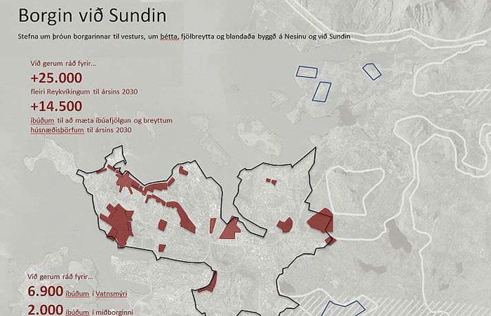 Aðalskipulag Reykjavíkur gerir ráð fyrir að borgarbúum fjölgi um að minnsta kosti 25.000 á næstu 18 árum. Reisa á 14.500 íbúðir fyrir árið 2030 til að mæta þeirri fjölgun. Unnið verður að því að þétta byggð og verða þær því allar vestan Elliðaáa. Í bæklingi um aðalskipulagsvinnuna, en nú stendur yfir endurskoðun á því, segir að miðað sé við að allt að 90% nýrra íbúða rísi innan núverandi þéttbýlismarka. Stærstu uppbyggingarsvæðin eru í Vatnsmýri við Mýrargötu og í Elliðaárvogi. Þá verður byggð þétt á öðrum vannýttum svæðum. „Skipulag bygginga, gatna og opinna svæða verður samtvinnað á heildrænan hátt með borgarmiðað gatnakerfi að leiðarljósi. Íbúðir, skrifstofur, verslun og þjónustu verður að finna innan sömu götureita. Byggðin verður almennt 3-5 hæðir og íbúðarþéttleiki um 60 íbúðir/ha,“ segir í bæklingnum. Hjálmar Sveinsson, varaformaður skipulagsráðs, segir mörg rök liggja fyrir því að stöðva útþenslu borgarinnar og byggja inn á við. Götur Reykjavíkurborgar séu yfir 1.000 kílómetrar að lengd og reksturinn dýr eftir því. „Allar kannanir á markaði segja okkur að straumurinn liggi inn í borgina. Við sem borgaryfirvöld hljótum að svara því.“ Hjálmar segir að nú þegar sé hafin uppbygging í Vatnsmýri sem falli vel að áherslum aðalskipulagsins. „Þar vísa ég til 280 stúdentaíbúða sem byrjað er að byggja í Vatnsmýrinni. Þá er Búseti búinn að kynna fyrirætlanir um reit við Einholt og Þverholt, en þær ganga út á allt að 250 íbúðir. Þá má búast við að fljótlega gerist eitthvað á Hampiðjureitnum og vonandi kynnum við í borgarráði nýtt rammaskipulag fyrir Hafnarsvæðið frá Sjóminjasafni að Hörpu í þessari viku. Á Mýrargötusvæðinu geta risið 250 íbúðir.“ Stýrihópur skipaður fulltrúum allra flokka hefur unnið að aðalskipulagsvinnunni og hefur hún verið kynnt á hverfisfundum. Þá vinnur skipulagssvið að frekari útfærslu. Vonast er til að ráðherra staðfesti skipulagið fyrir vorið. kolbeinn@frettabladid.is