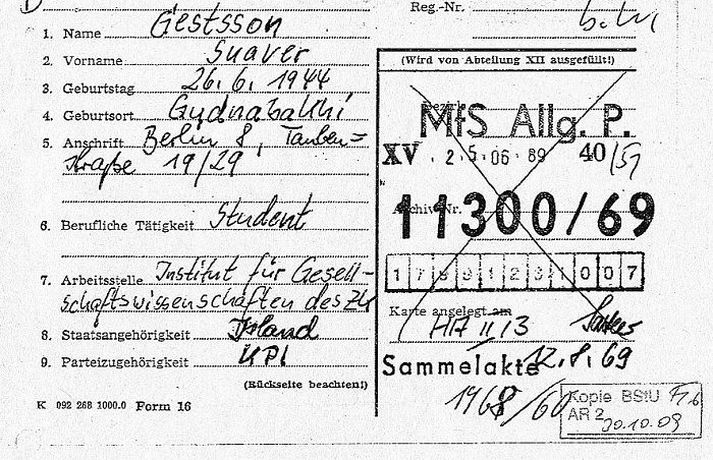 Svavar Gestsson, fyrrverandi formaður Alþýðubandalagsins, þingmaður, ráðherra og sendiherra, var grunaður um að vinna fyrir bandarísku leyniþjónustuna CIA á meðan hann var við nám í Austur-Berlín á sjöunda áratug síðustu aldar. Skjöl sýna að tíðar ferðir hans til Vestur-Berlínar vöktu grunsemdir austurþýsku leyniþjónustunnar Stasi. Þetta kemur fram í sjálfsævisögu Svavars sem kemur út á morgun, en hún ber titilinn Hreint út sagt. Í kjölfarið á falli múrsins árið 1989 og Austur-Þýskalands opnaði Stasi skjalasöfn sín. Um miðjan tíunda áratuginn fluttu Ríkisútvarpið og Morgunblaðið fregnir af því að nafn Svavars væri að finna í skjölum leyniþjónustunnar. Um það var einnig skrifað í bók Árna Snævarrs og Vals Ingimundarsonar, Liðsmenn Moskvu. Í bók Svavars kemur fram að vissulega sé nafn hans að finna í skjölum Stasi, enda hafi verið fylgst með öllum útlendingum í landinu á þessum árum. „Á Íslandi hafa fáeinir menn reynt að koma því óorði á mig í áratugi að ég hafi unnið fyrir Stasi – við hvað skildi ég aldrei. Hvað gat ég svo sem gert að því að ég væri á skrám Stasi? En þegar betur er að gáð kemur í ljós að Austur-Þjóðverjarnir, sem lágu meðal annars yfir einkabréfum mínum, hafa talið að ég væri að vinna fyrir bandarísku leyniþjónustuna sennilega af því að ég fór svo oft til Vestur-Berlínar.“ kolbeinn@frettabladid.is