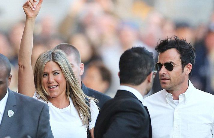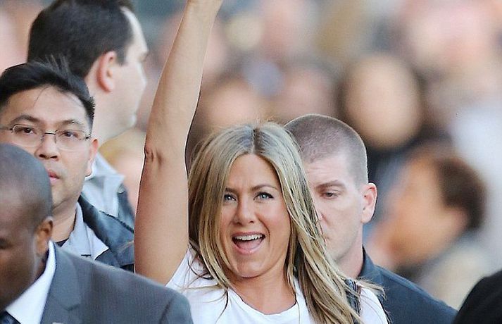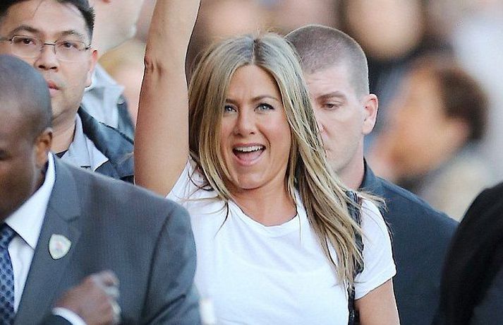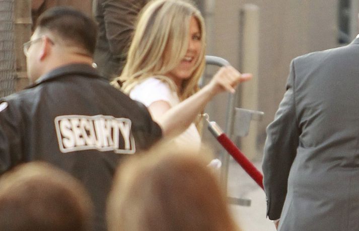 Leikkonan Jennifer Aniston var stórglæsileg klædd í hvítan stuttermabol þegar hún mætti í upptökuver sjónvarpsmannsins Jimmy Kimmel í gær. Með leikkonunni voru lífverðir og unnusti hennar leikarinn Justin Theroux. Meðfylgjandi myndir sem teknar voru af leikkonunni sem er 43 ára gömul sýna að hún er úthvíld og síung (enda nýkomin úr fríi) þegar kemur að útliti en sögusagnir um að Jennifer gangi með barn eru ansi háværar í slúðurheimi vestan hafs og nú má hún varla stíga skref án þess að getgátur um að hún sé "greinilega ólétt" poppi upp á erlendum miðlum. Nú eru sögusagnir um að hún sé pottþétt ólétt því hún á að vera með meiri fyllingu í andlitinu en vanalega. Lífið á erfitt með að sjá að Jennifer sé eitthvað öðruvísi en vanalega í andliti - nema hvað að hún er glöð og greinilega í dúndur formi. Myndir af henni sem teknar voru í desember og í gær má skoða í myndaalbúminu hér að ofan. Sérð þú mun? Skoðaðu myndasafnið og sjáðu hvort eitthvað sé að marka þessa pælingu.