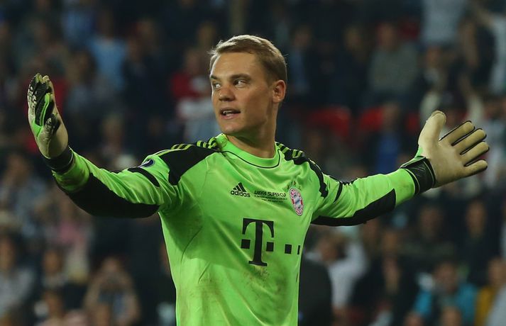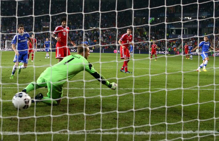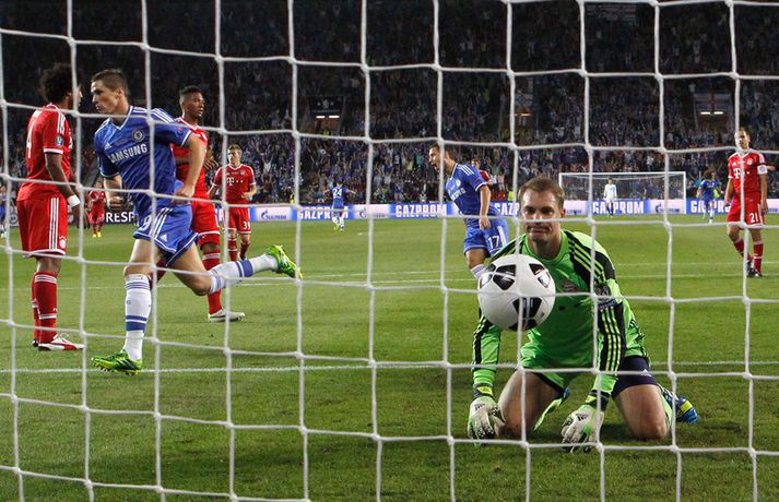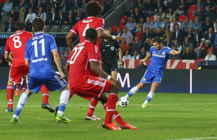 Bayern München er meistari meistaranna í Evrópu eftir 5-4 sigur á Chelsea í vítakeppni í leiknum um Ofurbikar Evrópu í Prag í kvöld en þetta er árlegur leikur á milli Evrópumeistaraliðanna frá síðustu leikíð. Þyski landsliðsmarkvörðurinn Manuel Neuer tryggði Bayern München titilinn þegar hann varði vítaspyrnu Romelu Lukaku en liðin voru þá búin að nýta níu fyrstu vítaspyrnur sínar í vítakeppninni. Chelsea lék manni færri alla framlenginguna en var aðeins nokkrum sekúndum frá því að tryggja sér titilinn í framlengingunni en Javi Martínez jafnaði metin í 2-2 með síðustu spyrnu leiksins. Chelsea komst tvisvar yfir í leiknum því Fernando Torres skoraði í upphafi leiks og Eden Hazard í upphafi framlengingarinnar. Franck Ribéry jafnaði í 1-1 í byrjun seinni hálfleiks. Þetta er í fyrsta sinn sem Bayern München vinnur Ofurbikar Evrópu en liðið var þrisvar sinnum búið að tapa þessum leik (1975, 1976, 2001). Jose Mourinho, knattspyrnustjóri Chelsea, var hársbreidd frá því að vinna fyrsta titilinn síðan að hann snéri aftur á Brúna en hann hefur aldrei unnið Ofurbikarinn á ferlinum. Chelsea fékk draumabyrjun í leiknum þegar Fernando Torres skoraði glæsilegt mark á 8. mínútu eftir frábæra skyndisókn. Eden Hazard sprengdi upp vörn Bayern og fann André Schürrle sem gaf fyrir á Torres. Spænski framherjinn afgreiddi boltann viðstöðulaust upp í bláhornið. Bayern tók ekki langan tíma að jafna metin í seinni hálfleik en Franck Ribéry skoraði þá með langskoti á 47. mínútu eftir samspil við Toni Kroos. Chelsea hafði varla komið við boltann í seinni hálfleiknum þegar Bayern München var búið að skora. Ramires fékk síðan sitt annað gula spjald fyrir brot á Mario Götze á 85. mínútu og Chelsea-liðið var því orðið manni færra. Það voru ekki skoruð fleiri mörk í venjulegum leiktíma og því þurfti að framlengja leikinn. Eden Hazard Kom Chelsea aftur yfir strax á þriðju mínútu í framlengingunni eftir einstaklingsframtak á vinstri vængnum. Hann lék inn að markinu og afgreiddi boltann í nærhornið án þess að Manuel Neuer kæmi vörnum við. Petr Cech varði nokkrum sinnum frábærlega í framlengingunni, þar á meðal tvisvar með skömmu millibili og Chelsea-liðið virtist ætla að lifa af mikla pressu Bayern-liðsins. Javi Martínez náði hinsvegar að jafna metin með síðustu spyrnu leiksins og tryggja Bayern vítakeppni. Martínez var á réttum stað þegar boltinn datt fyrir fætur hans eftir aukaspyrnu.Bayern München-Chelsea - vítakeppnin : 1-0 David Alaba, Bayern - mark 1-1 David Luiz, Chelsea - mark 2-1 Toni Kroos, Bayern - mark 2-2 Oscar, Chelsea - mark 3-2 Philipp Lahm, Bayern - mark 3-3 Frank Lampard, Chelsea - mark 4-3 Franck Ribéry, Bayern - mark 4-4 Ashley Cole, Chelsea - mark 5-4 Xherdan Shaqiri, Bayern - mark Romelu Lukaku, Chelsea - varið (Manuel Neuer)