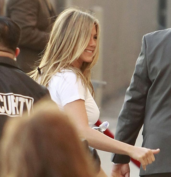 Leikkonan Jennifer Aniston var stórglæsileg klædd í hvítan stuttermabol þegar hún mætti í upptökuver sjónvarpsmannsins Jimmy Kimmel í gær. Með leikkonunni voru lífverðir og unnusti hennar leikarinn Justin Theroux. Meðfylgjandi myndir sem teknar voru af leikkonunni sem er 43 ára gömul sýna að hún er úthvíld og síung (enda nýkomin úr fríi) þegar kemur að útliti en sögusagnir um að Jennifer gangi með barn eru ansi háværar í slúðurheimi vestan hafs og nú má hún varla stíga skref án þess að getgátur um að hún sé "greinilega ólétt" poppi upp á erlendum miðlum. Nú eru sögusagnir um að hún sé pottþétt ólétt því hún á að vera með meiri fyllingu í andlitinu en vanalega. Lífið á erfitt með að sjá að Jennifer sé eitthvað öðruvísi en vanalega í andliti - nema hvað að hún er glöð og greinilega í dúndur formi. Myndir af henni sem teknar voru í desember og í gær má skoða í myndaalbúminu hér að ofan. Sérð þú mun? Skoðaðu myndasafnið og sjáðu hvort eitthvað sé að marka þessa pælingu.