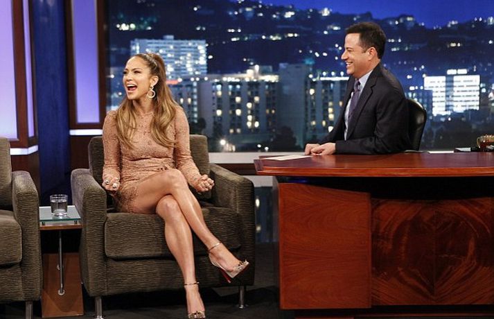 Þúsundþjalasmiðurinn Jennifer Lopez ljómaði í húðlituðum kjól er hún mætti í viðtal til Jimmy Kimmel fyrir suttu. Þar talaði hún um nýjustu mynd sína Parker og hvað henni fannst um að afklæðast fyrir framan karakterinn sem leikinn er af Jason Statham. "Ég fór ekki úr öllu en nógu miklu til að þetta væri óþægilegt. Hjarta mitt sló svo hratt, það var hræðilegt. Það var hægt að heyra saumnál detta því það vissu allir að það væri að koma að atriðinu,“ segir þessi hressa, tveggja barna móðir. Jimmy og Jennifer.Jimmy kom líka inn á daglegt líf Jennifer og hvenær hún vakni eiginlega á morgnanna. "Ég á tvíbura og þeir vakna um sjö leytið. Þeir koma inn og vekja mig.“