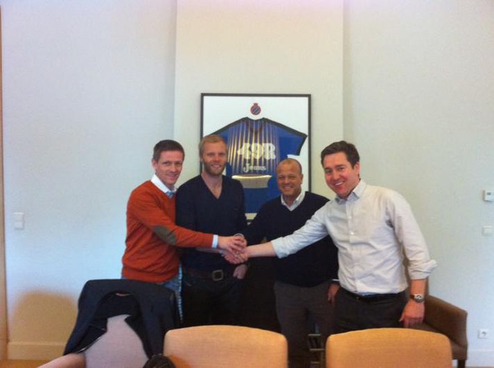Eiður Smári Guðjohnsen er genginn til liðs við belgíska úrvalsdeildarfélagið Club Brugge. Það staðfesti félagið á heimasíðu sinni í kvöld. Eiður Smári kemur frá grannliðinu Cercle Brugge eftir stutta dvöl þar en hann samdi til Club til loka tímabilsins 2014. Eiður Smári hefur spilað vel með Cercle Brugge síðan hann kom til félagsins í haust. Alls skoraði hann sex mörk í þrettán leikjum. Hann var með samning út tímabilið en var þó heimilt að fara frítt til félaga utan Belgíu þann 31. janúar næstkomandi. Belgísk félög þurftu hins vegar að greiða fyrir hann og er talið að Club hafi greitt Cercle 50-85 milljónir króna.Þessi mynd birtist á heimasíðu Club Brugge í kvöld.Eiður Smári mun gangast undir læknisskoðun á morgun og fara á sínu fyrstu æfingu á þrijðudag. Líklegt er að hann spili sinn fyrsta leik með liðinu á sunnudag - gegn Cercle Brugge í grannaslag. „Ég er ánægður með þessi félagaskipti. Ég er sannfærður um að Eiður muni hafa góð áhrif á liðið, bæði innan vallar sem utan,“ sagði Arnar Grétarsson, yfirmaður knattspyrnumála hjá Club Brugge. „Þessi félagaskipti gera mig mjög ánægðan. Ég hlakka til að koma til sterks liðs og keppa um titla. Ég sendi Cercle Brugge líka mínar bestu óskir,“ er haft eftir Eiði Smára sjálfum.