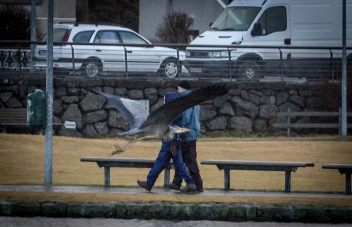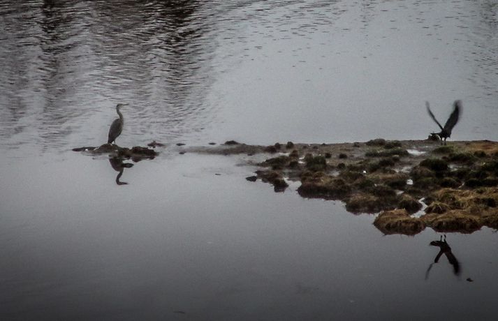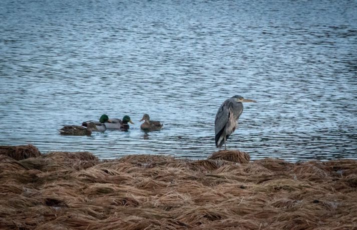 Myndarlegur gráhegri heiðrar Hafnfirðinga með nærveru sinni 21. janúar 2013 11:32 Gráhegrinn fylgist með öðrum fuglum á tjörninni úr fjarlægð. Það var fallegt um að litast við tjörnina í Hafnarfirði þegar Egill Aðalsteinsson, kvikmyndatökumaður á Stöð 2 og ljósmyndari, leit þar við um helgina. Þar sá hann fallegan gráhegra. Hann er frekar styggur og fljótur að fljúga upp ef menn reyna að nálgast hann. HInir fuglarnir láta hann í friði, en Egill varð var við að endurnar veittu því athygli hvers lags furðufugl væri þarna á ferðinni. Yann Kolbeinsson, fuglafræðingur á Náttúrustofu Norðausturlands, segir að þarna sé um að ræða ungan fugl sem hafi komið í heiminn í sumar. „Þeir eru tíðir vetrargestir um allt land, þó sérstaklega á SV-landi og suður með landinu austur í Skaftafellssýslur. Þar sjást gjarnan smáir hópar sem halda til saman yfir veturinn í grennd við opið vatn (fiskeldi, heitar uppsprettur, lækir osfrv) á hefðbundnum stöðum og nátta sig stundum í grenilundum þar sem þá er að finna," segir hann í svari til fréttastofu. Hann segir að á höfuðborgarsvæðinu sjáist þeir gjarnan við Hvaleyrarlón, Urriðavatn, Elliðavatn og Keldur. Á árunum 1979-2007 hafi sést hér að meðaltali um 60 fuglar á ári en komum þeirra virðist hafa fjölgað lítillega á síðari árum. Flest bendir til að gráhegrar sem koma hingað eigi uppruna sinn í Skandinavíu, mögulega að mestu leyti frá Noregi. Stakir fuglar sjást stundum hér yfir sumartímann en ekki er vitað til að þeir hafi orpið hér enn sem komið er. Mest lesið „Ég hef aldrei upplifað annan eins harm“ Innlent Gaf fingurinn á Miklubraut Innlent Breiddi út faðminn fyrir rasista: „Þið þurfið ekki að biðjast afsökunar á að vera hvít lengur“ Erlent Ný könnun Maskínu: „Væri alveg ný staða í íslenskum stjórnmálum“ Innlent Hundrað og fjörutíu milljarða bótakrafa á Samherja sé súrrealísk Innlent Hrindir af stað söfnun fyrir móður stúlkunnar sem lést í Suður-Afríku Innlent „Þetta hefur verið þungur tími“ Innlent Ársæll hringdi beint í utanríkisráðherra eftir fundinn Innlent Nýr ritstjóri stöðvaði umfjöllun um brottvísanir Trump Erlent Ósannað að fimmtán ára stúlka hafi stungið sextán ára pilt tvisvar Innlent Fleiri fréttir Vestmannaeyingar fá að eiga Vestmannaeyjar Hyggst kæra dyraverði Auto til lögreglu „Ótrúlega sorglegt að pabbi sé búinn að vera svona lengi í þessari stöðu“ Höfðu samband við dönsku herstjórnina á Grænlandi Ný könnun Maskínu: „Væri alveg ný staða í íslenskum stjórnmálum“ Glæný Maskínukönnun og jólaóveður Ársæll hringdi beint í utanríkisráðherra eftir fundinn Ósannað að fimmtán ára stúlka hafi stungið sextán ára pilt tvisvar Sameina Farice, Öryggisfjarskipti og hluta Neyðarlínunnar Gaf fingurinn á Miklubraut Birtir drög að lögum um lagareldi: Hyggst leggja niður Fiskeldissjóð Hundrað og fjörutíu milljarða bótakrafa á Samherja sé súrrealísk Skemmdir í kirkjugörðum vegna aksturs utan vegar Ólýsanlegur harmur fyrir fjölskylduna og söfnun hleypt af stokkunum „Ég hef aldrei upplifað annan eins harm“ Vill leiða lista Sjálfstæðismanna í Reykjanesbæ „Þetta hefur verið þungur tími“ Naut aðstoðar samskiptasérfræðinga vegna veiðigjaldamálsins Hrindir af stað söfnun fyrir móður stúlkunnar sem lést í Suður-Afríku Varð vitni að ótrúlegum norðurljósum: „Mér fannst þetta magnað“ Færir nýársboðið fram á þrettándann Fjórir fluttir á sjúkrahús eftir bílveltu á Suðurlandi Leggur aftur til hverfislögreglustöð í Breiðholti Nú má heita Love, Tóní, Ranimosk og Draumur Kvartar til umboðsmanns og vonar að Vegagerðin sjái að sér Ætlar ekki að beita sér í máli starfsmanns Útlendingastofnunar „Ég vil ekki nokkurn tímann sjá neitt svona aftur“ Gyðingar á Íslandi upplifa aukinn ótta Ferðaþjónusta blómstrar í uppsveitum Árnessýslu „Þetta er bara ljótt“ Sjá meira