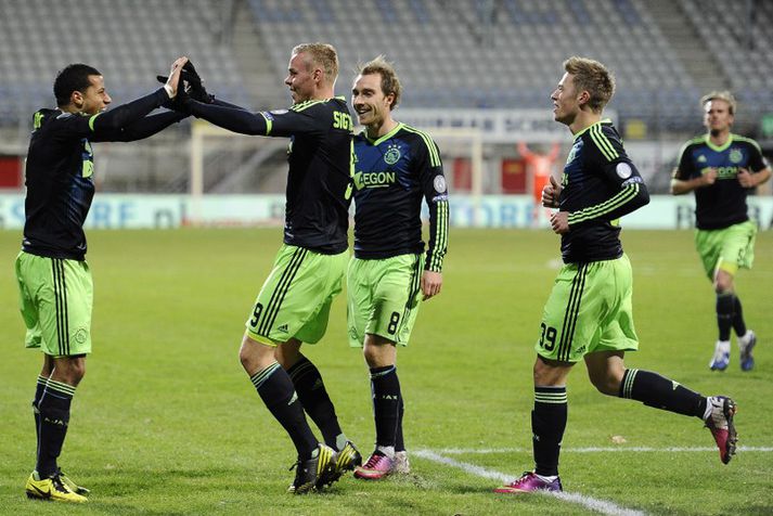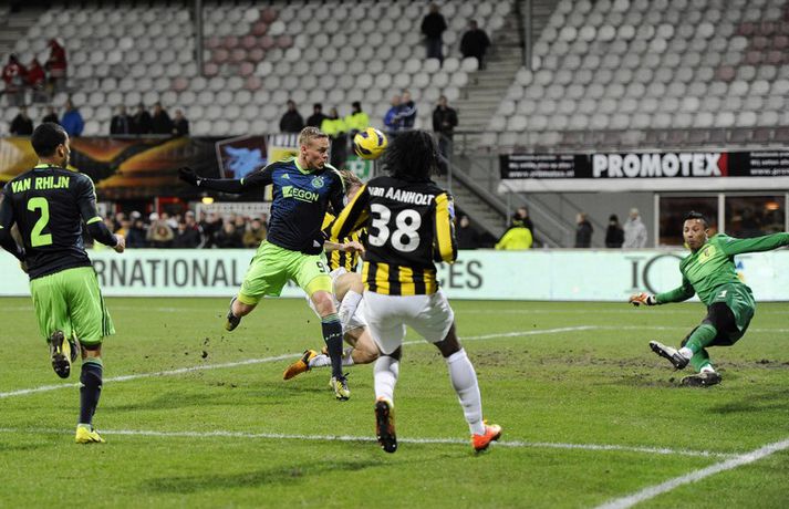 Tvö mörk hjá Kolbeini á fyrstu fimmtán mínútunum - myndir Óskar Ófeigur Jónsson skrifar 31. janúar 2013 22:47 Mynd/Nordic Photos/Getty Kolbeinn Sigþórsson var ekki lengi að stimpla sig inn hjá Ajax þegar hann lék sinn fyrsta leik með liðinu í fimm mánuði. Kolbeinn skoraði tvö mörk á fimmtán mínútum í 4-0 bikarsigri á Vitesse í kvöld. Kolbeinn kom inn á sem varamaður á 75. mínútu leiksins. Á 81. mínútu fylgdi hann á eftir þegar Daninn Lasse Schöne lét verja frá sér vítaspyrnu og fimm mínútum síðar skoraði hann með skalla úr markteignum eftir fyrirgjöf frá Ricardo van Rhijn. Þetta voru fyrstu fimmtán mínúturnar hjá íslenska landsliðsframherjanum eftir að hann missti úr fimm mánuði vegna uppskurðar á öxl. Kolbeinn átti því magnaða endurkomu inn í lið Ajax. Kolbeinn hefur nánast misst af öllu tímabilinu en er samt kominn með fimm mörk, 1 mark í 1 leikjum í hollensku deildinni, 2 mörk í 1 leik í hollenska bikarnum og 2 mörk í 1 landsleik á móti Færeyjum á Laugardalsvellinum í ágúst.Myndband af mörkum Kolbeins má sjá hér. Fótbolti Mest lesið Ekkert bit í snáknum: „Hörmulegur og ætti að hætta“ Sport United horfir til Þýskalands eftir höfnun Semenyo Enski boltinn „Þú birtir falsfrétt um mig, þú ert í banni“ Fótbolti Kynntu Sigurð á slaginu sex á aðfangadag Íslenski boltinn Zidane sá soninn spila á Afríkumótinu Fótbolti Goðsögn fallin frá Enski boltinn „Ég elska peninga“ Sport Haaland stóðst vigtun eftir jólin Enski boltinn Þessi tíu eru tilnefnd sem Íþróttamaður ársins 2025: 23 ára aldursmunur Sport Féll úr skíðalyftu og lést Fótbolti Fleiri fréttir United horfir til Þýskalands eftir höfnun Semenyo „Þú birtir falsfrétt um mig, þú ert í banni“ Haaland stóðst vigtun eftir jólin Hápunktarnir hingað til í enska boltanum Goðsögn fallin frá Zidane sá soninn spila á Afríkumótinu Hótað brottrekstri ef hann færi ekki á börurnar Kærður af knattspyrnusambandinu Bestu jólamörkin: Drogba, Scholes eða Giroud? Býst ekki við að spila aftur fyrir landsliðið Féll úr skíðalyftu og lést Kynntu Sigurð á slaginu sex á aðfangadag Van de Ven bað Isak afsökunar: „Vildi ekki meiða hann“ Var frústreraður vegna landsliðsins Hvers vegna heillast stórliðin svo af Semenyo? Stewart, Snoop og Modric í eina sæng Mahrez batt enda á bið Alsíringa Heyrði hvorki frá Blikum né Víkingum Ruglaðar lokamínútur í Afríkukeppninni Vill ekki segja hversu lengi Bruno er frá Spyr hvort Guardiola stígi á vigtina Viðurkenna að VAR hafi bilað Úr Bestu heim í Hauka „Þetta er stærsti klúbbur Íslands“ Kaupmannahafnarbúi afgreiddi Úganda Arsenal í undanúrslit eftir vító Man. Utd reyndi stíft en Semenyo kaus City Iwobi og Lookman áberandi í sigri Nígeríu „Tölfræðilega séð eiga þeir ekkert að vera í þessari stöðu“ Amanda hætt hjá Twente Sjá meira