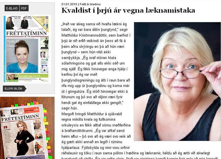 Álitin þunglynd en reyndist vera með krabbamein í ristli 31. janúar 2013 22:22 Skjáskot af vef Fréttatímans. Matthildur Kristmannsdóttir var álitin þunglynd þegar hún leitaði ítrekað til læknis vegna veikinda. Í viðtali við Fréttatímann, sem kemur út á morgun, kemur fram að þremur árum eftir að hún leitaði sér fyrst hjálpar kom í ljós að Matthildur var alls ekki þunglynd - heldur með krabbamein. Í viðtali við Fréttatímann segir hún: „Það var alveg sama við hvaða lækni ég talaði, ég var bara álitin þunglynd," segir Matthildur Kristmannsdóttir, sem barðist í þrjú ár við erfið veikindi án þess að fá á þeim aðra skýringu en þá að hún væri þunglynd – sem hún vildi ekki samþykkja. „Ég svaf stóran hluta sólarhringsins og gat alls ekki séð um mig sjálf. Ég fékk hinsvegar enga hjálp í kerfinu því ég var með þunglyndisgreiningu og átti í raun bara að rífa mig upp úr þunglyndinu og koma mér út í göngutúra. Ég stóð hinsvegar ekki á fótunum og þó svo að viljinn væri fyrir hendi gat ég einfaldlega ekki gengið," segir hún. Margoft hringdi Matthildur á sjúkrabíl vegna mikilla kvala og fullkomins orkuleysis en fékk alltaf sömu meðferðina á bráðamóttökunni. „Ég var alltaf send heim aftur – þó svo að ég væri svo veik að ég gæti ekki annað en legið í rúminu hjálparlaus. Fjölskylda og vinir voru orðnir ráðalausir og tóku í raun sama pólinn í hæðina og læknarnir, héldu að ég ætti við alvarlegt þunglyndi að stríða. Ég var orðin alein. Það var eiginlega komið þannig fyrir mér að mig langaði til að deyja því enginn hlustaði á mig," segir Matthildur. „Þegar ég loks fór í ristilspeglunina kom í ljós æxli í ristlinum sem var á stærð við appelsínu. Það var svo stórt að ristillinn var næstum alveg lokaður og myndavélin komst ekki framhjá því. Æxlið hafði því verið að vaxa þarna í 10-12 ár eftir því sem læknarnir sögðu og veikindi mín síðustu þrjú árin höfðu því stafað af því að ég var með stórt krabbameinsæxli í ristli," segir Matthildur. Viðtalið í heild sinni má nálgast hér. Mest lesið Sextán ára fékk greitt fyrir að færa Epstein stúlkur Erlent Milljónir til almannatengla og átta sinnum meira en í fyrra Innlent Systir og amma drengs í meðferð létust í Suður-Afríku Innlent Ljósmyndir horfnar úr Epstein-skjölunum, þar á meðal ein af Trump Erlent „En hver sagði að þetta ætti að vera auðvelt?“ Innlent Grunuð um að koma til landsins til að brjóta á öldruðum Innlent Sex hundruð miðar á vettvangi morðsins: „Fokking hálfvita fífl bæði tvö!!!!“ Innlent Bindur vonir við Vor til vinstri Innlent „Við erum pottþétt að koma út í mínus, hversu miklum vitum við ekki“ Innlent „Þetta er alveg ásættanlegur samningur“ Innlent Fleiri fréttir Eyjólfur í orlof og Inga þrefaldur ráðherra Vegagerðin segir flóðin í Vík fyrirséð Fjölmiðlar, bókmenntir og hægrimennska á Sprengisandi „En hver sagði að þetta ætti að vera auðvelt?“ Milljónir til almannatengla og átta sinnum meira en í fyrra Grunuð um að koma til landsins til að brjóta á öldruðum Leggja hald á skip á alþjóðahafsvæði undan ströndum Venesúela Bindur vonir við Vor til vinstri Systir og amma drengs í meðferð létust í Suður-Afríku „Við erum pottþétt að koma út í mínus, hversu miklum vitum við ekki“ „Þetta er alveg ásættanlegur samningur“ Deildi nöfnum skjólstæðinga á Instagram Íslendingar þægileg fórnarlömb fyrir vasaþjófa „Að öllu óbreyttu mun þjóðvegurinn fara í sundur“ Vonbrigði í Vík og rýnt í Epstein-skjölin Morgundagurinn sá stysti á árinu Langtímaleigan 23 þúsund krónum dýrari á ári Grenjandi rigning og hífandi rok á aðfangadag Reyndi að komast inn á lögreglustöð með fíkniefni Svona á að raða í uppþvottavélina „Verður vonandi til að styrkja íslensku einkareknu miðlana“ Talinn hafa komið til landsins til að stela Snorkstelpan snýr aftur eftir ágreining um höfundarrétt Framlög til einkarekinna fjölmiðla næstum tvöfaldast Meðferð við spilafíkn loks niðurgreidd af Sjúkratryggingum Kílómetragjaldið bitni helst á sparneytnum eldsneytisbílum Tvær íslenskar konur létust í umferðarslysinu í Suður-Afríku Íslendingar lentu í alvarlegu slysi í Suður-Afríku Stóraukið fjármagn til Frú Ragnheiðar Standi ekki til að leggja niður Rás 2 þrátt fyrir boðaða heimild Sjá meira