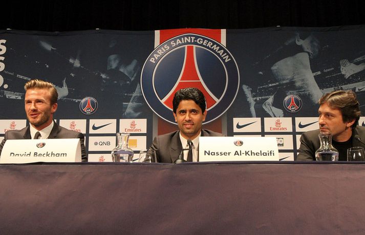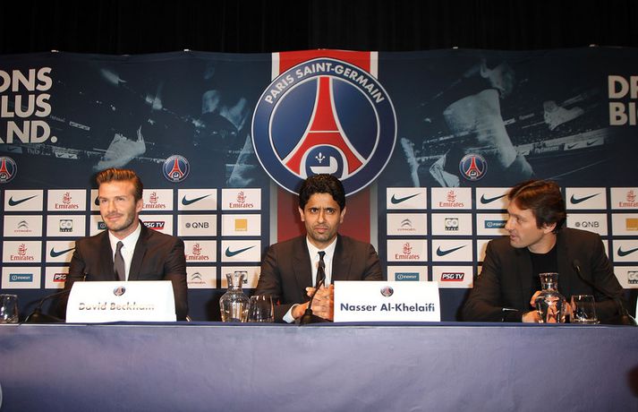 David Beckham er nú á blaðamannafundi í París þar sem hann var tilkynntur sem nýr leikmaður Paris Saint-Germain. Beckham gerir fimm mánaða samning við Parísarliðið og segist ætla að hjálpa liðinu vaxa enn frekar. Beckham er ekki kominn til Paris Saint-Germain peninganna vegna sem sést kannski best á því að hann hefur ákveðið að ánefna barnaspítala í París öll launin sín hjá PSG. „Ein af ástæðunum fyrir því að ég kem til París er að við höfðum tækifæri til að gera eitthvað einstakt. Launin mín munu fara til barnaspítala í París og ég er mjög spenntur og stoltur yfir því að geta gert það. Ég er ekki viss um að svona hafi verið gert áður," sagði Beckham. Beckham gaf ekki upp nákvæma upphæð eða hvaða barnaspítali fái launin hans en viðurkenndi þó að þetta væri ekki lítil upphæð. Beckham talaði líka um það á fundinum að hann verði nú að rifja upp skólafrönskuna sína og að bæði eiginkonan hans og börnin fjögur muni búa áfram í London.