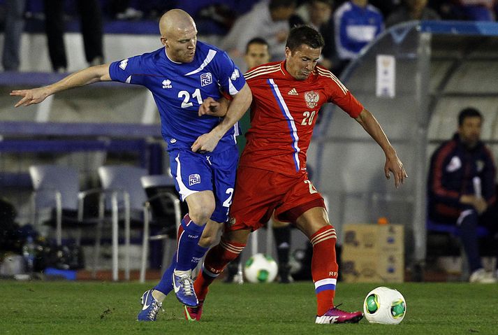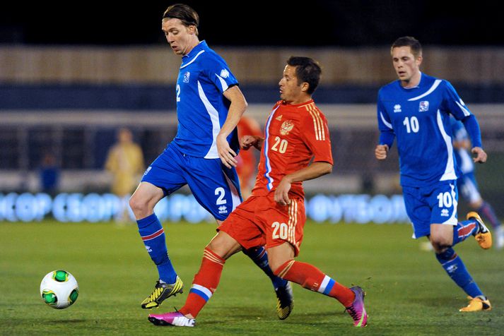 Umfjöllun og viðtöl: Ísland - Rússland 0-2 Eiríkur Stefán Ásgeirsson skrifar 6. febrúar 2013 18:27 Mynd/AFP Sókndjörf uppstilling Lars Lagerbäck landsliðsþjálfara borgaði sig ekki í arfaslökum vináttulandsleik gegn Rússlandi á Spáni í kvöld. Rússar komust yfir í lok fyrri hálfleiks eftir að hafa spilað sig laglega í gegnum íslensku vörnina. Roman Shirokov batt endahnút á þá sókn með marki. Snemma í síðari hálfleik skoraði svo varamaðurinn Oleg Shatov mark, aftur eftir slappan varnarleik íslenska liðsins. Þeim tókst ekki að hreinsa boltann frá marki eftir stungusendingu og Shatov skoraði með föstu skoti í vítateignum. Ísland fékk fá færi í leiknum en það besta fékk líklega Eiður Smári Guðjohnsen. Hann hitti þó boltann illa úr ágætu færi. Íslendingar hittu reyndar aldrei markrammann í kvöld. Lagerbäck var með þá Eið Smára og Gylfa Þór á köntunum en í fremstu víglínu voru Kolbeinn Sigþórsson og Alfreð Finnbogason. Sóknarlína íslenka landsliðsins hefur sjaldan litið jafn vel út á pappírnum margfræga en því miður skilaði hún litlu af sér í kvöld. Rússneska landsliðið, sem hefur unnið alla leiki sína í undankeppni HM 2014 til þessa - og haldið hreinu þar að auki, var afar yfirvegað og vel skipulagt í öllum sínum aðgerðum í kvöld. Rússarnir biðu eftir mistökum hjá íslenska liðinu og náðu í tvígang að refsa fyrir slík mistök með marki. Varnarleikur Íslands var á löngum köflur ágætur en leit þó afar klaufalega út í nokkur skipti, þar á meðal í báðum mörkum rússneska liðsins. Því skal þó haldið til haga að Rússarnir sköpuðu sér ekki mýgrút almennilegra marktækifæra í kvöld - þó svo að þau hafi verið fleiri en hjá íslenska liðinu. Birkir Bjarnason átti fínan leik á miðjunni og sýndi enn og aftur að hann getur gegnt nánast hvaða hlutverki sem er í íslenska liðinu. Flestir aðrir náðu sér ekki nógu vel á strik og eiga vonandi meira inni fyrir komandi landsliðsverkefni.Kolbeinn: Vonbrigði að spila ekki betur Blaðamaður Vísis fann sig knúinn til að slá á létta strengi þegar hann heyrði hljóðið í Kolbeini Sigþórssyni eftir leik í kvöld. Kolbeinn var nefnilega fyrirliði íslenska landsliðsins í 2-0 tapinu gegn Rússlandi í kvöld en hann bar fyrirliðabandið í fjarveru Arons Einars Gunnarssonar. „Hvað segir Kolbeinn kafteinn?" spurði blaðamaður. Kolbeinn hló kurteisislega á móti og sagðist svo hafa verið stoltur af því að hafa fengið að leiða íslenska liðið út á völlinn í kvöld. „Það var mikill heiður," bætti hann við. „Það hefði auðvitað verið skemmtilegra að vinna leikinn. Þetta var ekki nógu gott hjá okkur í dag." „Það eru þó einhverjir jákvæðir punktar sem við getum tekið með okkur. Til dæmis gerðum við fá mistök í vörn í fyrri hálfleik og gáfum heilt yfir fá færi á okkur." „En Rússarnir voru skynsamir og biðu eftir því að við gerðum mistök. Þeir voru mjög yfirvegaðir," sagði hann. Kolbeinn játar því að það hafi verið vonbrigði að fá ekki meira úr sóknarleiknum, sérstaklega miðað við liðsuppstillinguna. „Það var erfitt að fá boltann í lappirnar og þeir náðu mjög vel að loka á okkar spil. Það reyndist því erfitt að skapa eitthvvað af viti." „Við hefðum viljað skapa fleiri færi, þó svo að fengum einhverja sénsa í leiknum. En það vantaði upp á síðustu sendinguna eða skotið. Sem betur fer var þetta æfingaleikur en við verðum að gera betur ef við ætlum að vinna einhverja leiki á þessu ári."Emil: Alltaf sama sagan „Það er alltaf sama sagan hjá okkur. Við gerum okkur of oft seka um klaufaleg mistök," sagði miðjumaðurinn Emil Hallfreðsson eftir leik Íslands og Rússlands í kvöld. Rússarnir unnu leikinn, 2-0, með öguðum leik og fáum en beittum sóknaraðgerðum. Íslenska liðið náði ekki að skapa sér mörg færi. „Bæði mörkin sem við fengum á okkur voru hálf klaufaleg. Í stöðunni 1-0 fékk Eiður reyndar færi til að jafna leikinn en það gekk ekki." „Það má samt ekki gleyma því að við vorum að spila gegn mjög sterku liði sem er með fullt hús stiga eftir fjóra leiki í undankeppninni og ekki enn fengið á sig mark." „Þeir voru mjög skipulagðir og voru svo fljótir að vinna boltann til baka þegar þeir töpuðu honum. Þeir voru bara betri en við í dag. Við hefðum samt mátt halda boltanum betur og skapa okkur fleiri betri sóknir." Emil segir að leikmenn hefðu allir lagt sitt af mörkum. „Viljinn til að gera vel er til staðar. Nú munum við skoða þennan leik og reyna að bæta það sem fór úrskeðis í dag. Vonandi náum við að pússa okkur betur saman fyrir leikinn gegn Slóvenum í mars."Lagerbäck: Munum spila við lakari lið en Rússland Landsliðsþjálfarinn Lars Lagerbäck telur að það hafi vel þess virði að prófa að tefla fram jafn sókndjörfu liði og hann gerði gegn Rússlandi í kvöld. Leikurinn tapaðist þó, 2-0. „Það eru alltaf vonbrigði að tapa en ég er samt ánægður með mína leikmenn að mörgu leyti. Þetta var góð liðsframmistaða gegn einu af tíu bestu landsliðum heims," sagði Lagerbäck við Vísi í kvöld. „Við ræddum það sérstaklega fyrir leik að halda boltanum og byggja upp sóknir. Við vorum hins vegar mjög fljótir að missa boltann og það olli mér mestum vonbrigðum í kvöld." „Við vissum að Rússarnir myndu pressa mikið á okkur þegar við vorum með boltann en það þýðir samt ekki að sparka alltaf boltanum frá sér. Það þarf að finna rétta jafnvægið í þessum efnum." Lagerbäck stillti upp sókndjörfu liði í kvöld og segist ánægður með útkomuna. „Mér fannst þeir standa sig vel. Þetta voru sókndjarfari vængmenn en við höfum áður teflt fram og ég held 