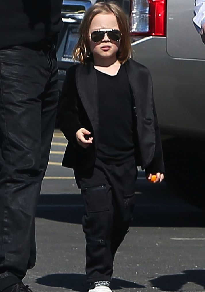 Knox Jolie-Pitt, sonur Angelinu Jolie og Brad Pitt, er alveg nákvæmlega eins og pabbi sinn. Það sást vel þegar hann eyddi tíma í Los Angeles um helgina með foreldrum sínum og tvíburasystur sinni Vivienne. Knox var svartklæddur eins og faðir sinn, með svipuð sólgleraugu og sama, fallega, gyllta hárið.Frábærir feðgar.Ekki er ólíklegt að hann feti líka sömu braut og faðir sinn í lífinu en systir hans Vivienne er strax byrjuð í bransanum. Hún leikur á móti móður sinni í kvikmyndinni Maleficent sem kemur í kvikmyndahús í mars á næsta ári.Lítill töffari.Mæðgurnar.Þú gætir unnið - vertu með okkur á Facebook.