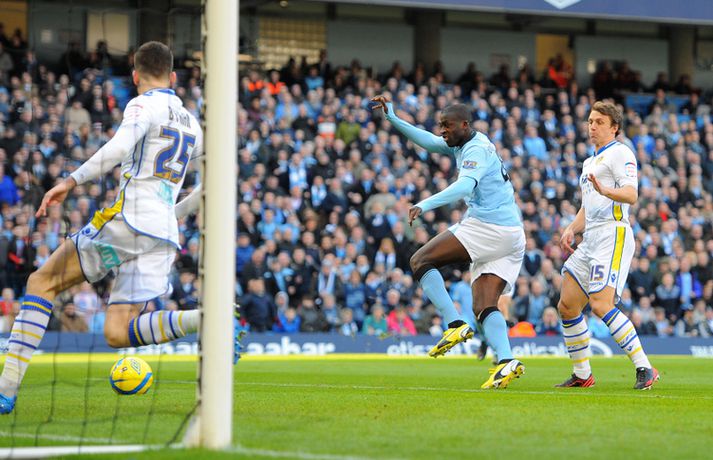 Manchester City rústaði Leeds Stefán Árni Pálsson skrifar 17. febrúar 2013 00:01 Mynd/AFP Manchester City vann auðveldan sigur, 4-0, á Leeds í enska bikarnum á Etihad-vellinum í Manchester. Fyrsta mark leiksins kom eftir aðeins fimm mínútna leik þegar Yaya Touré skoraði laglegt mark eftir frábæran undirbúning hjá Carlos Tevez. Tíu mínútum síðar skoraði Sergio Agüero mark úr vítaspyrnu. Carlos Tévez skoraði síðan þriðja mark City í upphafi síðari hálfleiks og Sergio Agüero skoraði síðan fjórða mark heimamanna korteri fyrir leikslok. Manchester City flaug því áfram í 8-liða úrslita bikarsins. Enski boltinn Mest lesið Syrgja átján ára fimleikakonu Sport Fyrsta mark Wirtz í þriðja sigrinum í röð Enski boltinn Arnar Þór ráðinn til FIFA: „Himinlifandi að hafa fengið þetta starf“ Fótbolti Írar ætli að fylgja eftir tillögu Heimis Fótbolti Gerir grín að klæðaburði liðsfélaga síns Körfubolti Arsenal aftur á toppinn Enski boltinn Cherki aðalmaðurinn í sigri City Enski boltinn Segir að Arsenal stefni á sögulega fernu á þessu tímabili Enski boltinn Þjálfar 2. flokk samhliða því að spila fyrir KR Íslenski boltinn Samþykkja hvern Rússann á fætur öðrum inn á Ólympíuleikana Sport Fleiri fréttir Chelsea - Aston Villa | Endar sigurhrinan á Brúnni? Schade og Jiménez sendu Brentford og Fulham í efri hlutann Arsenal aftur á toppinn Fyrsta mark Wirtz í þriðja sigrinum í röð Cherki aðalmaðurinn í sigri City Úlfarnir heiðruðu minningu Jota Andri Lucas frá í mánuð Sjáðu dönsku þrumuna sem færði United-mönnum öll þrjú stigin Segir að Arsenal stefni á sögulega fernu á þessu tímabili Amorim endaði viðtalið á gamansömum nótum „Við eigum heima í Evrópu“ Daninn skaut Man. United upp fyrir Liverpool Amorim segir strákinn í frystinum vera framtíðin hjá Man. United Martinez með fyrirliðabandið og báðir Fletcher-bræðurnir á bekknum Havertz gæti snúið aftur á næstu dögum Alfons og Willum sáu tvö rauð spjöld fara á loft Synir Diogo Jota leiða leikmenn út á Anfield Cunha vill skemmta og Howe treystir leikmönnum United horfir til Þýskalands eftir höfnun Semenyo Haaland stóðst vigtun eftir jólin Hápunktarnir hingað til í enska boltanum Goðsögn fallin frá Kærður af knattspyrnusambandinu Bestu jólamörkin: Drogba, Scholes eða Giroud? Van de Ven bað Isak afsökunar: „Vildi ekki meiða hann“ Hvers vegna heillast stórliðin svo af Semenyo? Stewart, Snoop og Modric í eina sæng Vill ekki segja hversu lengi Bruno er frá Spyr hvort Guardiola stígi á vigtina Arsenal í undanúrslit eftir vító Sjá meira